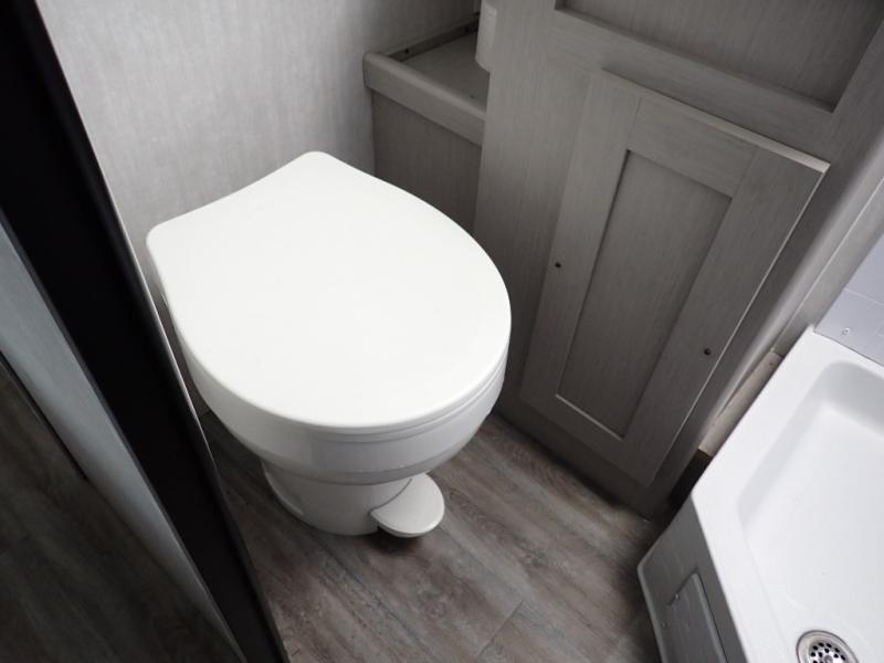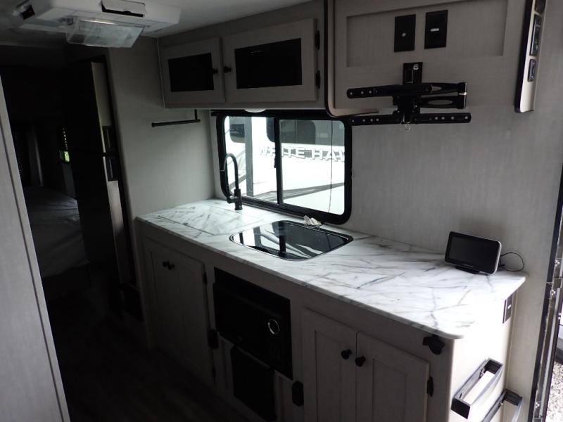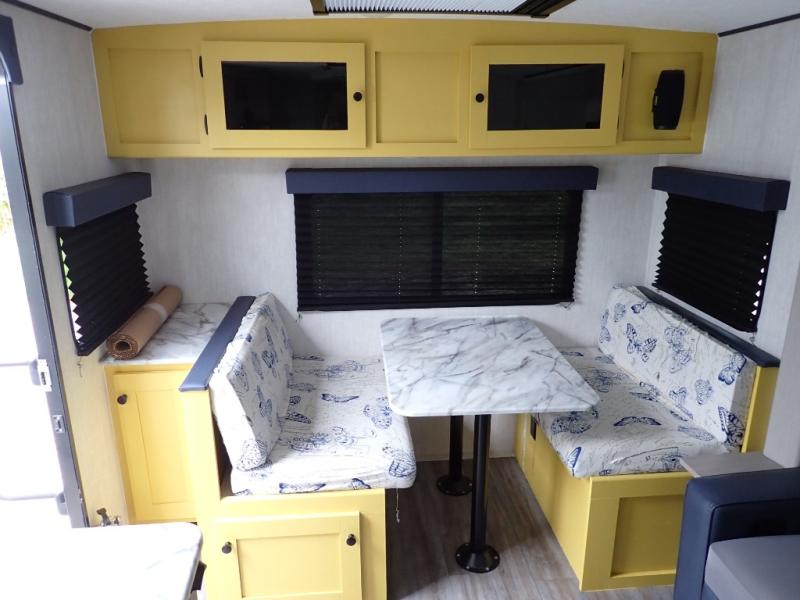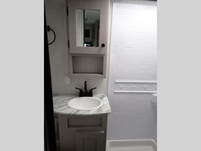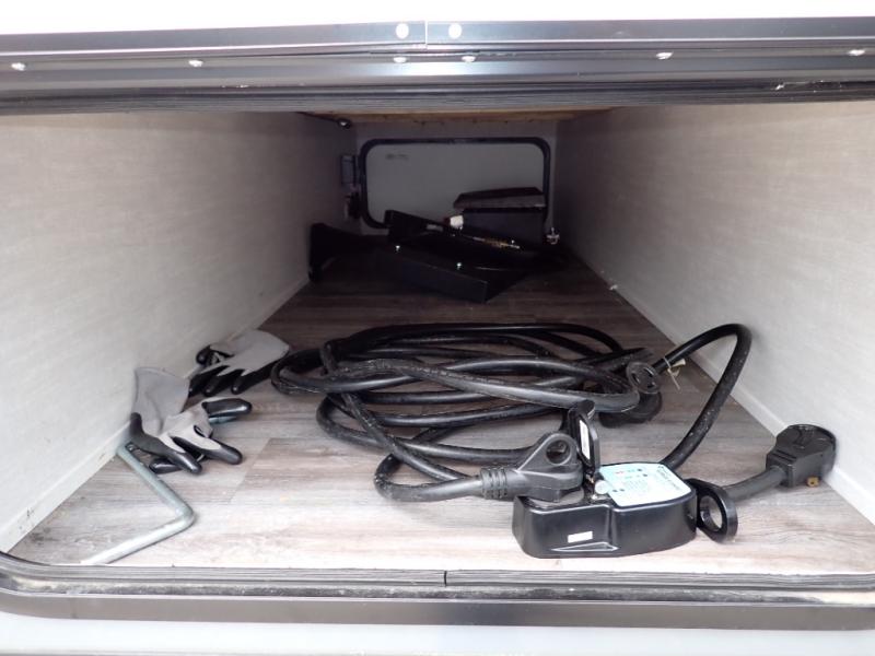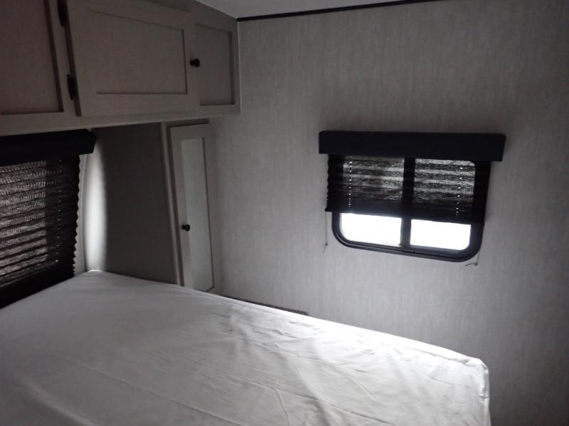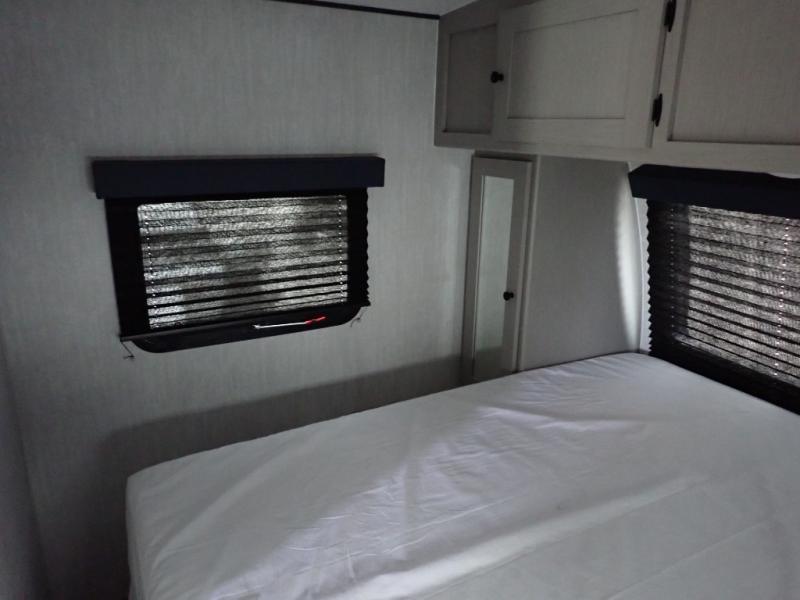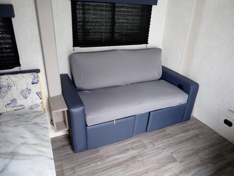 Escape the hustle and bustle of everyday life with this travel trailer! You will start each morning feeling recharged after sleeping on the front queen bed with wardrobes on either side to keep your clothes looking nice. The full bathroom has a neo-angled shower for you to freshen up and a medicine cabinet to store your toiletries. The sofa slide is across from the entertainment center for a comfortable movie night if you add your own TV, or you can play some card games at the rear booth dinette with an end table on one side.