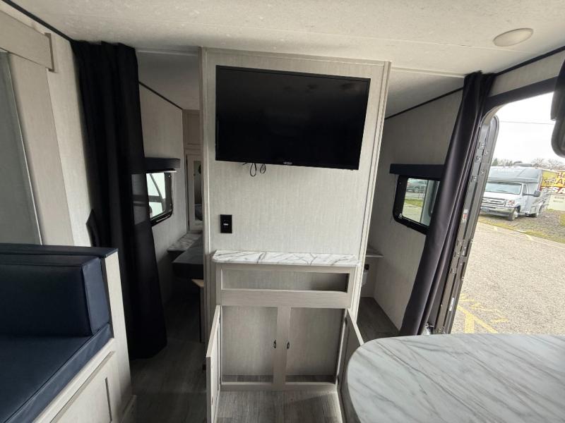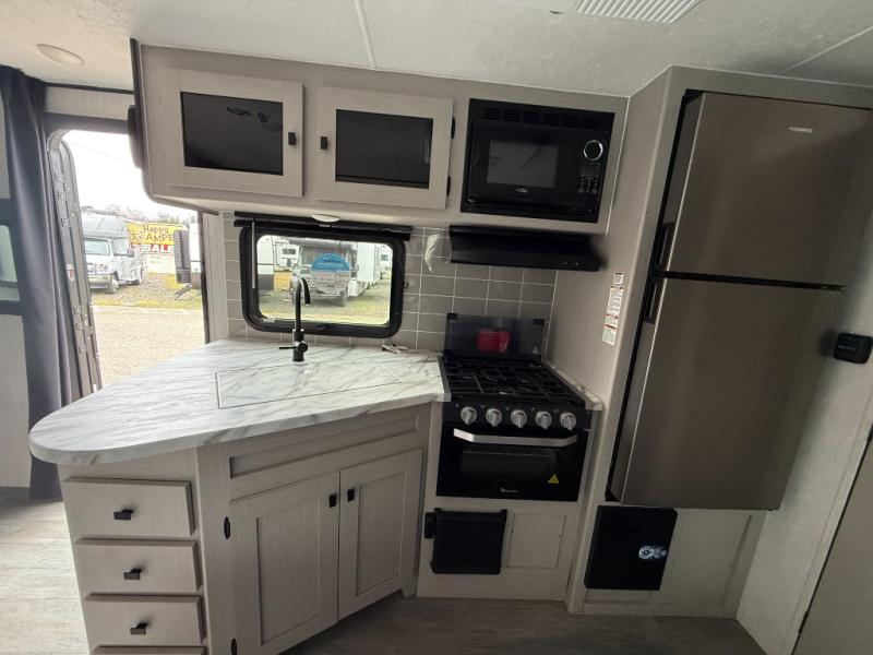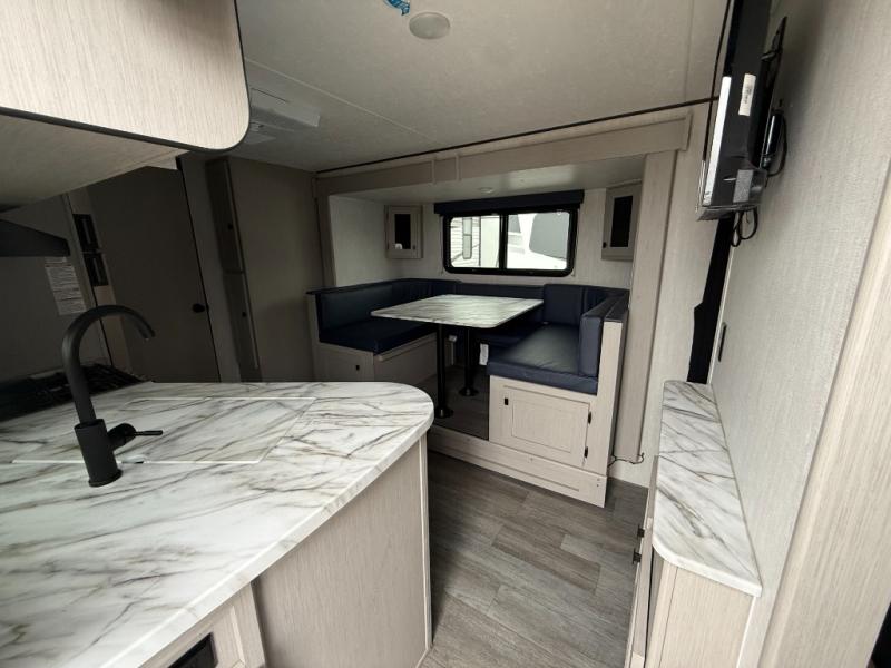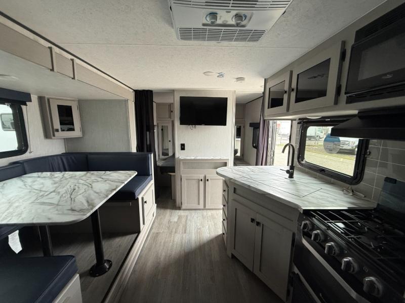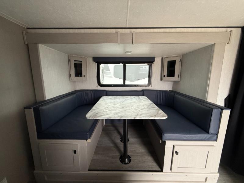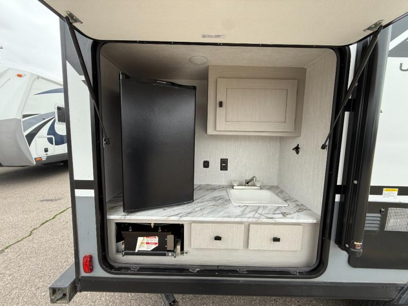 Easy to tow so you can get up and go! The U-shaped dinette slide will not only be a favorite spot to dine and play games, but will also double as additional sleeping space. There is a full interior kitchen, plus an outdoor kitchen that is perfect for breakfast outdoors. When you're ready to come in for the night, head to the spacious full rear bath to clean up, and the front bedroom will make this unit feel more like home with its queen bed and dual wardrobes!