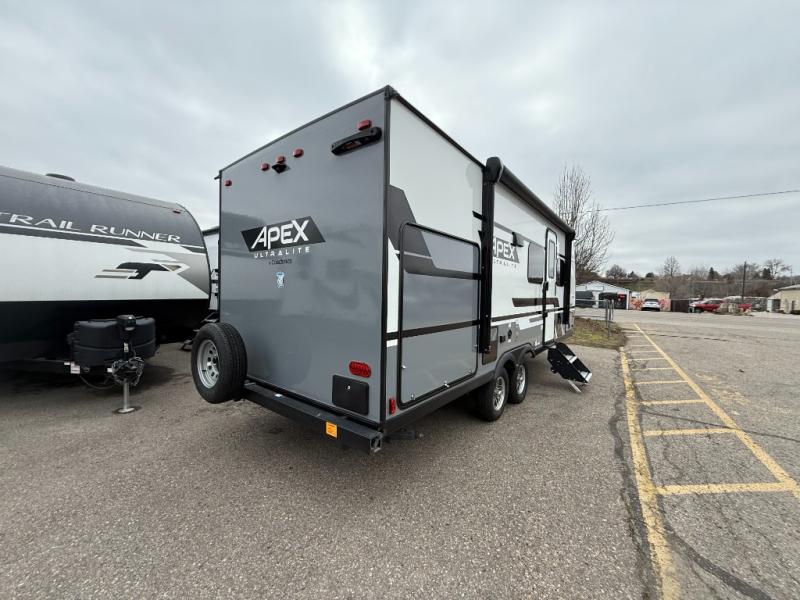 Lightweight living and camping is found with the Apex Ultra-Lite travel trailers by Coachmen. These eco-friendly units are made to last thanks to the Azdel composite sidewalls, the laminated aluminum floor, and the vacuum-bonded laminated crowned roof. Easy lube axles make towing easier than ever, plus there is a friction hinge entrance door, a 200-watt solar panel with a 30 Amp control charger, and slam latch baggage door catches for easy unloading. Some of the interior comforts you'll fall in love with are the one-piece seamless edge countertops, the hard valances with night shades, the matte black hardware, and the Casino Bisque cabinetry. The Apex Ultra-Lite trailers also include USB ports, a digital TV antenna with cable hook-ups and Wi-Fi capability, and a 13.5K BTU A/C to keep you comfortable all summer long!