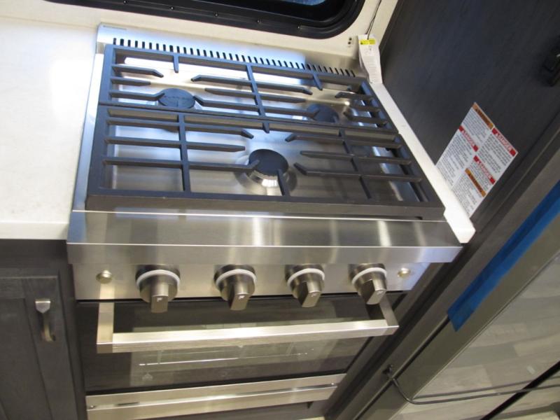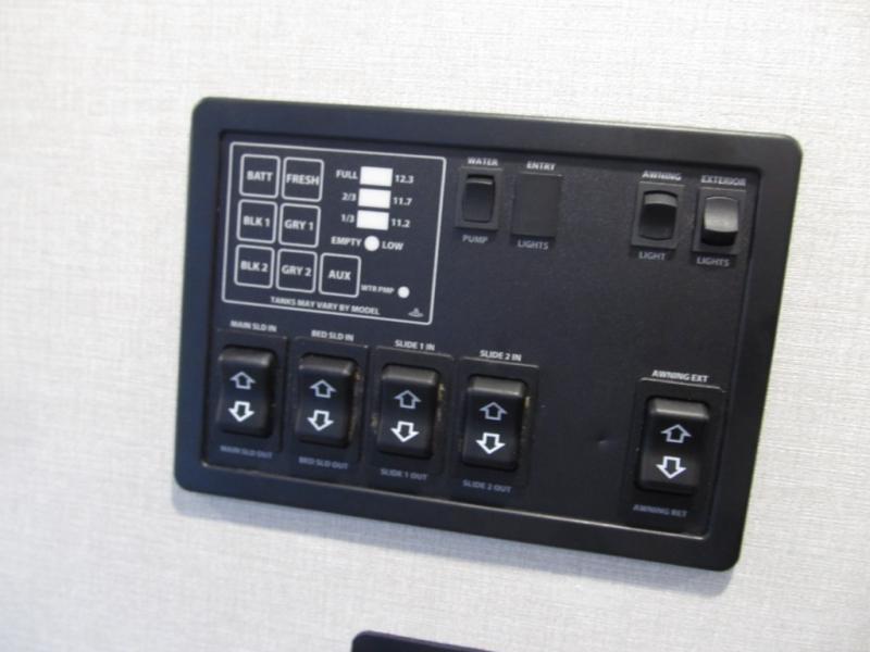 This family-friendly fifth wheel can sleep six to eight comfortably between the king bed, the tri-fold sofa, and the middle bunkhouse with a loft above! There is plenty of counter space in the bunkhouse, plus a sofa with a removable table and a wardrobe for clothes. The kitchen is any chef's dream with its residential cooktop, 15.6 cu. ft. 12V refrigerator, and kitchen island for more counter space. While dinner is being made, you can play a game of cards at the free-standing table, relax on the tri-fold sofa, or visit outdoors under the 20' power awning with LED lights. You won't be left wanting for storage space in this model thanks to the overhead cabinets, plus the bedroom dresser and large wardrobe. There is even a wardrobe with washer and dryer prep if you choose to go full-time!