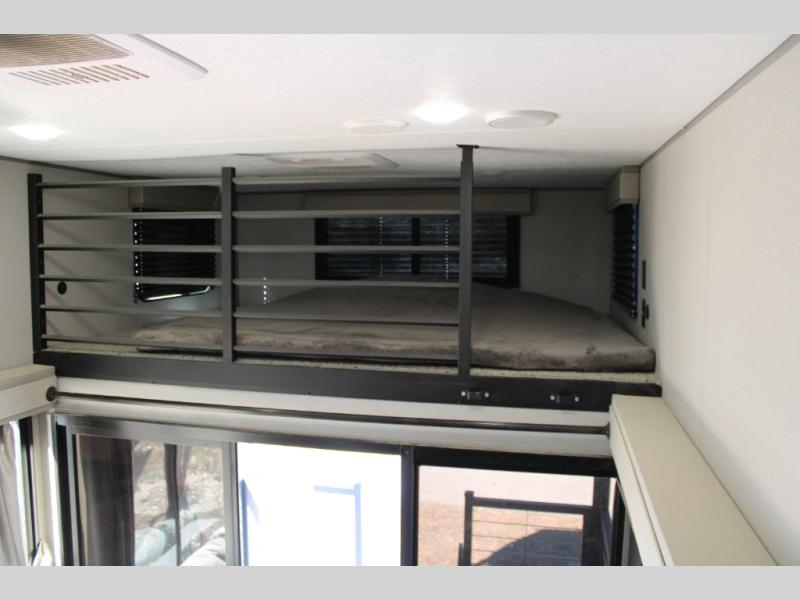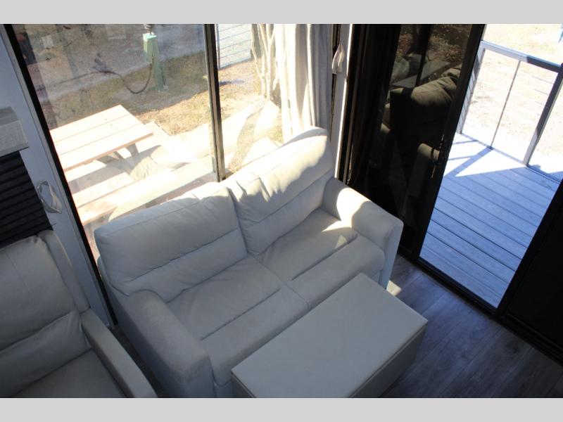 If you are looking for the ultimate camp experience you are going to love this double loft unit with a view! A 180 degree view from inside the front portion with large windows on each side and a full glass front patio door to an outside covered porch with composite decking for years of easy maintenance. Above the covered porch inside, there is a removeable ladder to the front loft space with a queen bunk matt for sleeping. A staircase to the rear master loft allows for storage under the stairs, and the master loft features a king bed mattress, electric fireplace, and plenty of storage for your things. There are also nice views from both lofts. The living room and kitchen feature all of the necessities to be comfortable. A tri-fold sofa and recliner for relaxing, and an ottoman also has a hinged lift table for dining. The kitchen features all of the appliances needed to create meals and snacks just like at home including a residential refrigerator for your perishables. The rear bath offers privacy and a nice size shower, toilet, and plenty of storage for towels and toiletries. Your family is sure to love this double loft unit!