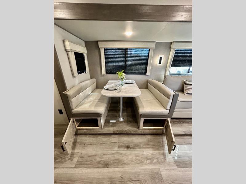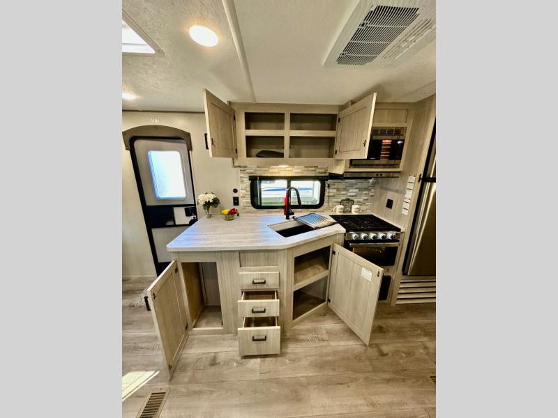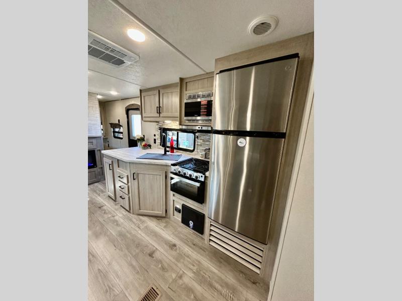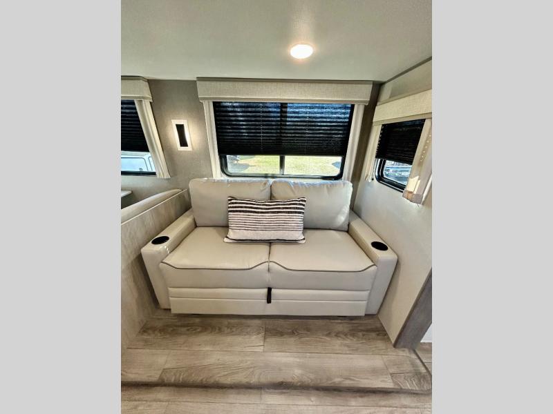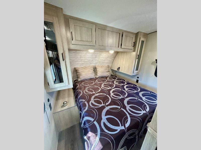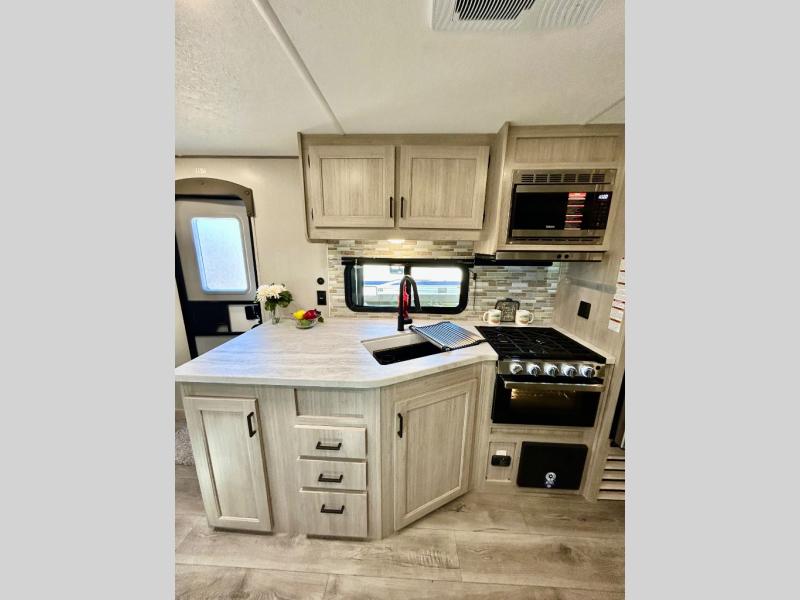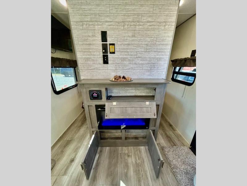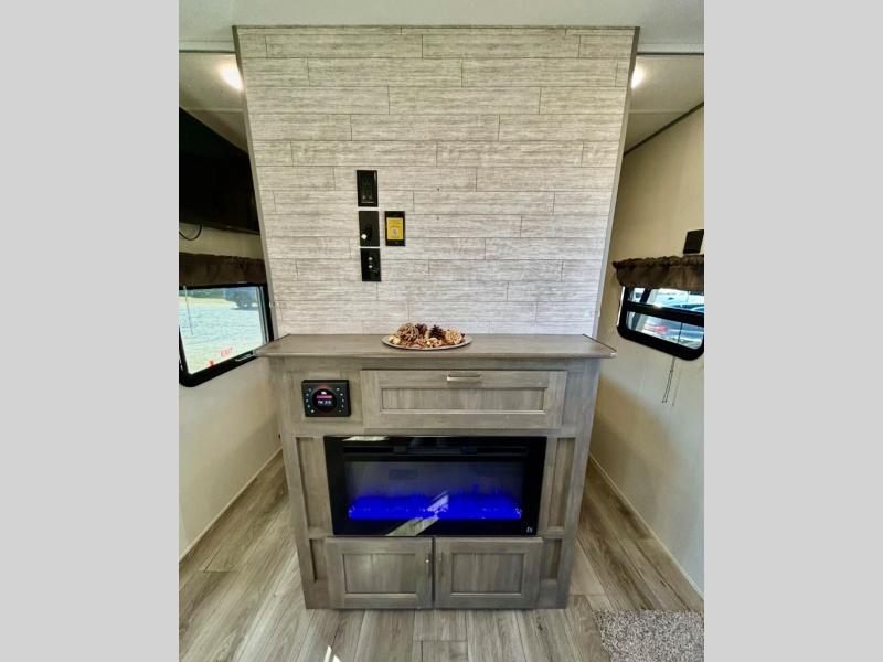 This half-ton friendly trailer is easy to pull and park, and is spacious thanks to the large slide out in the main living and kitchen area! You can dine at the booth dinette or choose the free standing dinette option, and the sofa offers drink holders for when you are watching the entertainment center with the optional fireplace below. The rear corner offers a full bathroom, and a large wardrobe/pantry for the storage you need. The galley kitchen offers full amenities plus a breakfast bar where you can set out fresh fruit and cereal. And the 15' awning provides protection from the elements plus has the choice of multiple LED colors with the use of the remote.