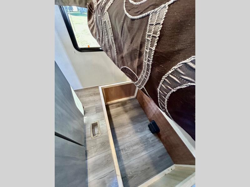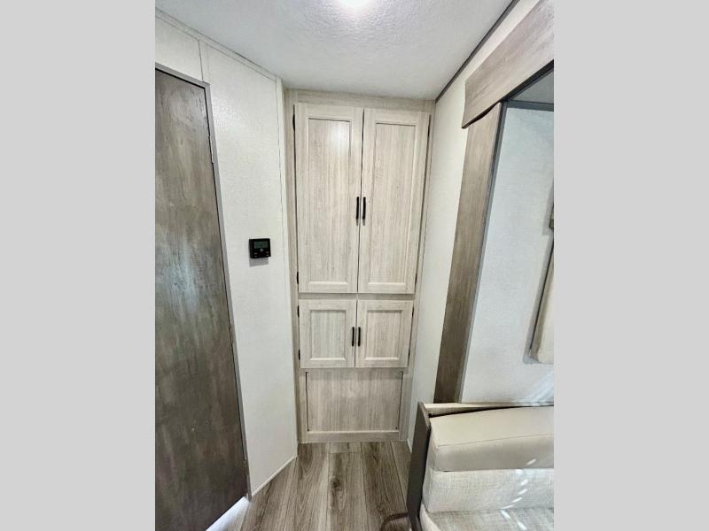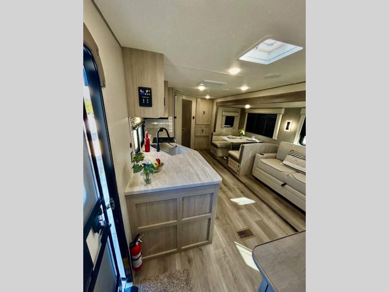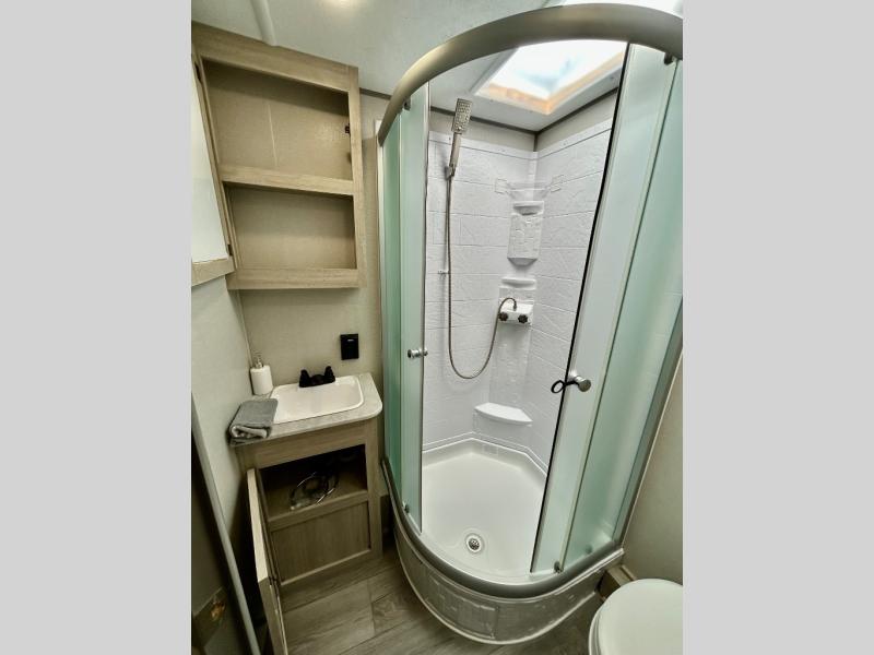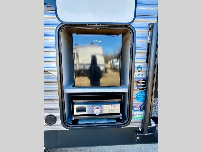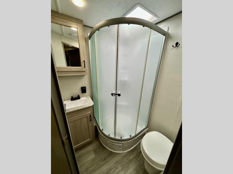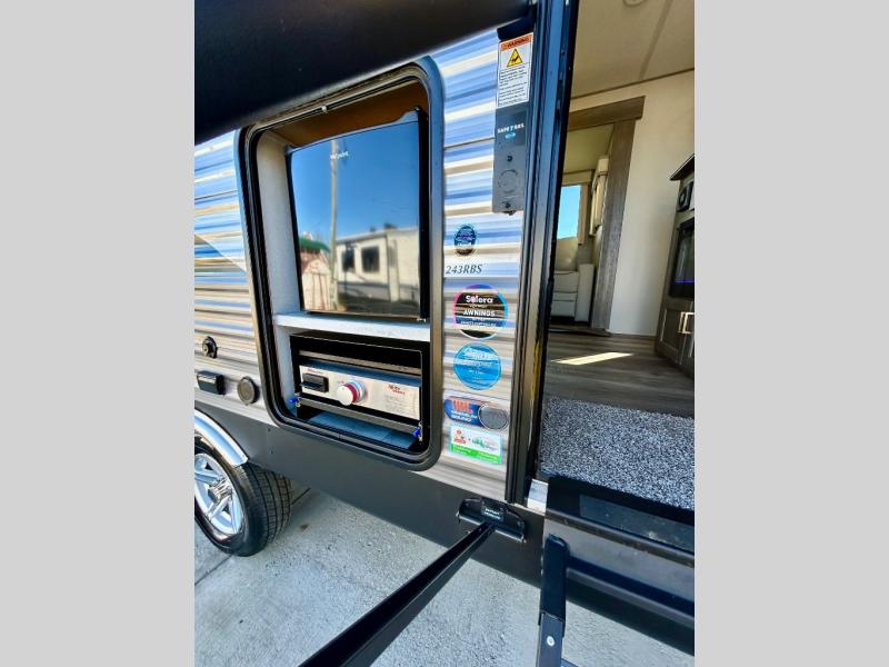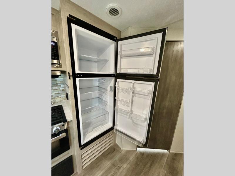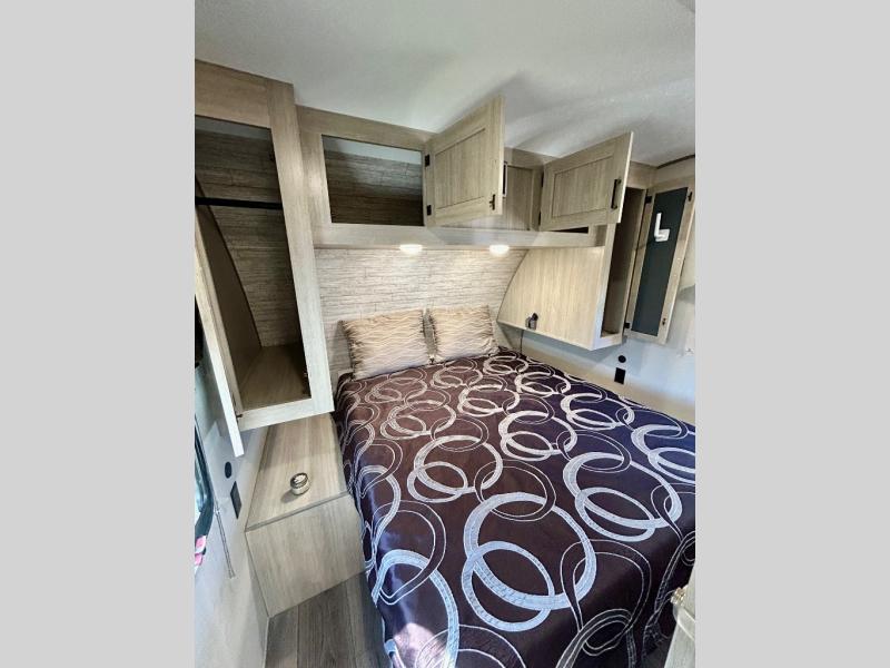 This half-ton friendly trailer is easy to pull and park, and is spacious thanks to the large slide out in the main living and kitchen area! You can dine at the booth dinette or choose the free standing dinette option, and the sofa offers drink holders for when you are watching the entertainment center with the optional fireplace below. The rear corner offers a full bathroom, and a large wardrobe/pantry for the storage you need. The galley kitchen offers full amenities plus a breakfast bar where you can set out fresh fruit and cereal. And the 15' awning provides protection from the elements plus has the choice of multiple LED colors with the use of the remote.