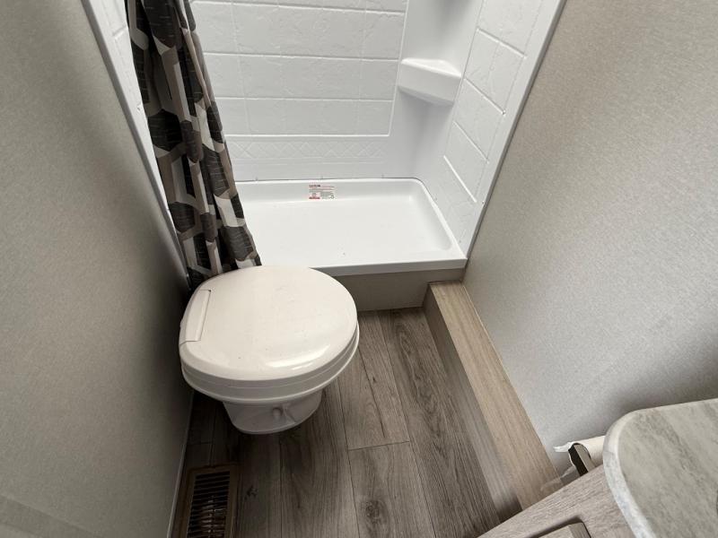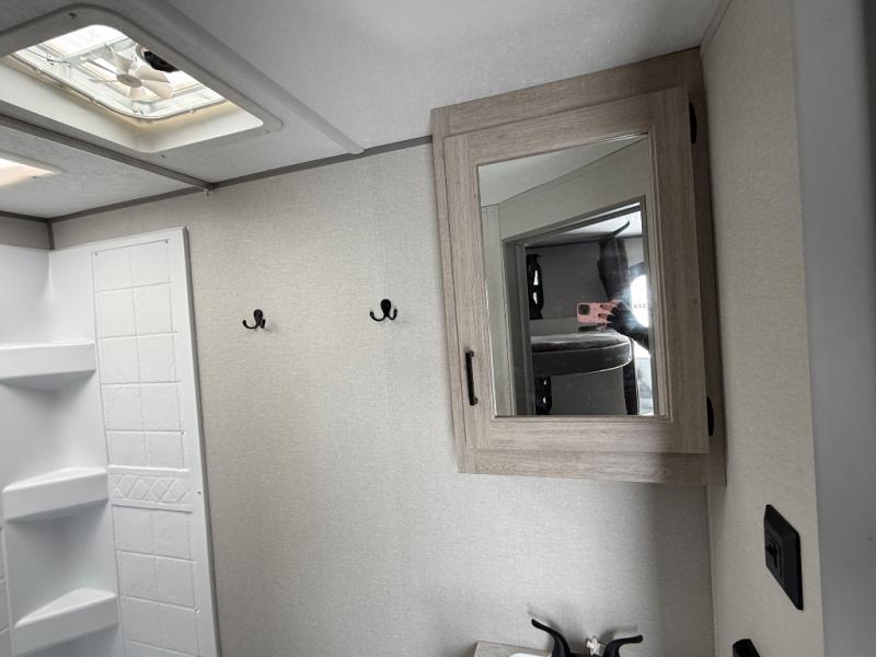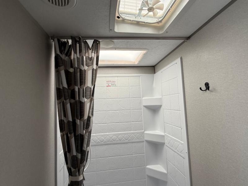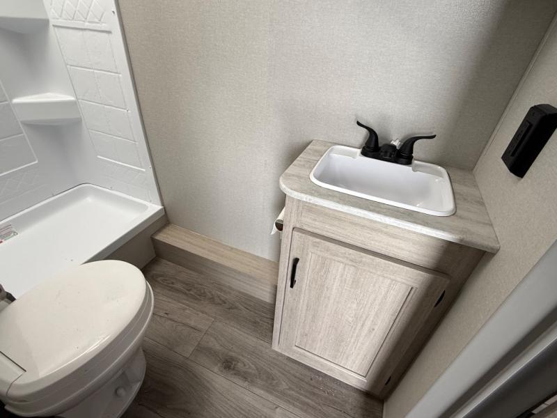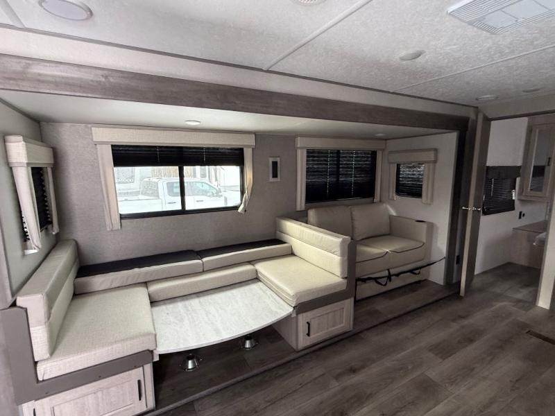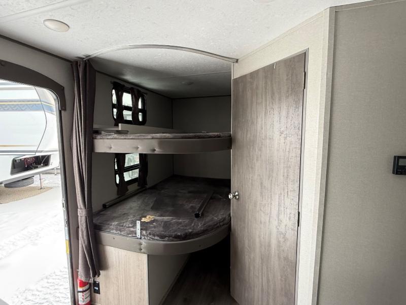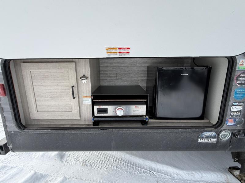 When you enjoy camping with your own accommodations and space for the whole crew, hitch this trailer up and head to the campgrounds! After loading everything easily thanks to the dual entry doors and all the interior and exterior storage, you will have no worries that you left anything behind. The electric awning is easy to set up, like the large slide out, and the awning offers multicolor LED lights to choose from by using the remote. When you are outside the cook might like to make a meal using the outside camper kitchen. The interior kitchen offers full amenities including a pantry, and everyone can enjoy the angled entertainment center. There are double-size bunks with a ladder for the kids and a walk-around queen for the owner to sleep on, plus furniture in the living area that doubles as additional sleeping space!