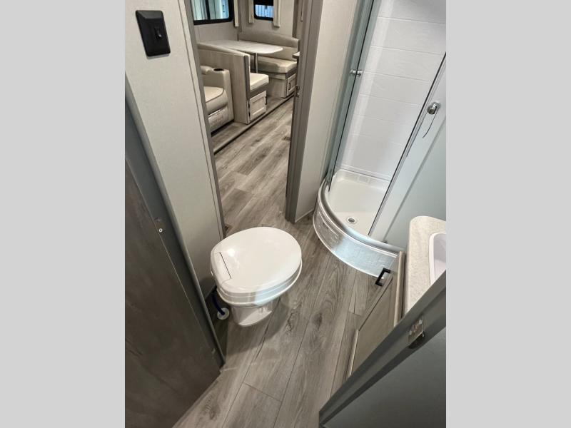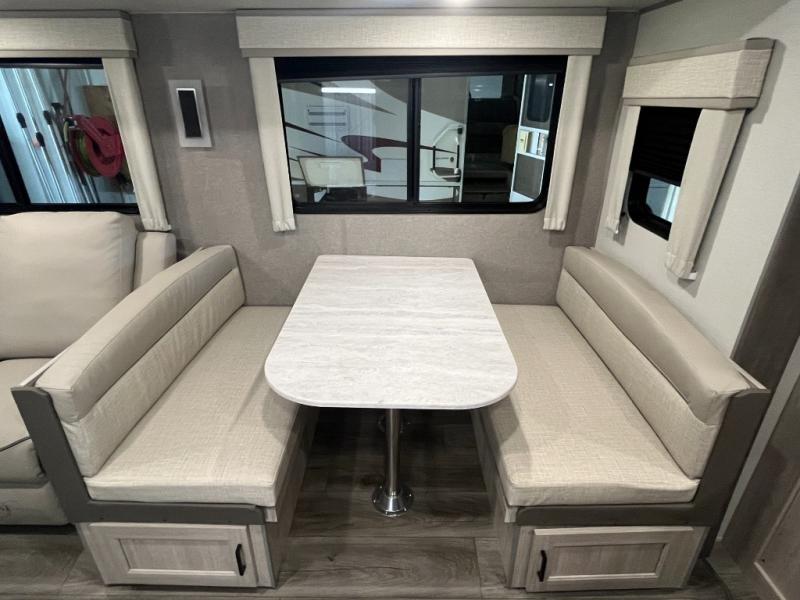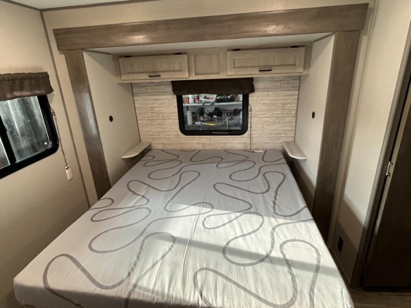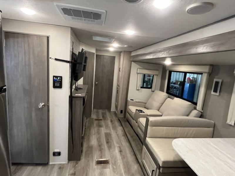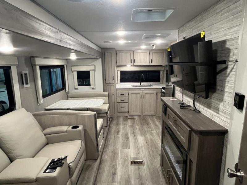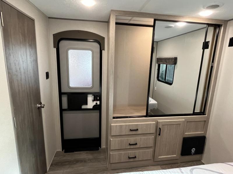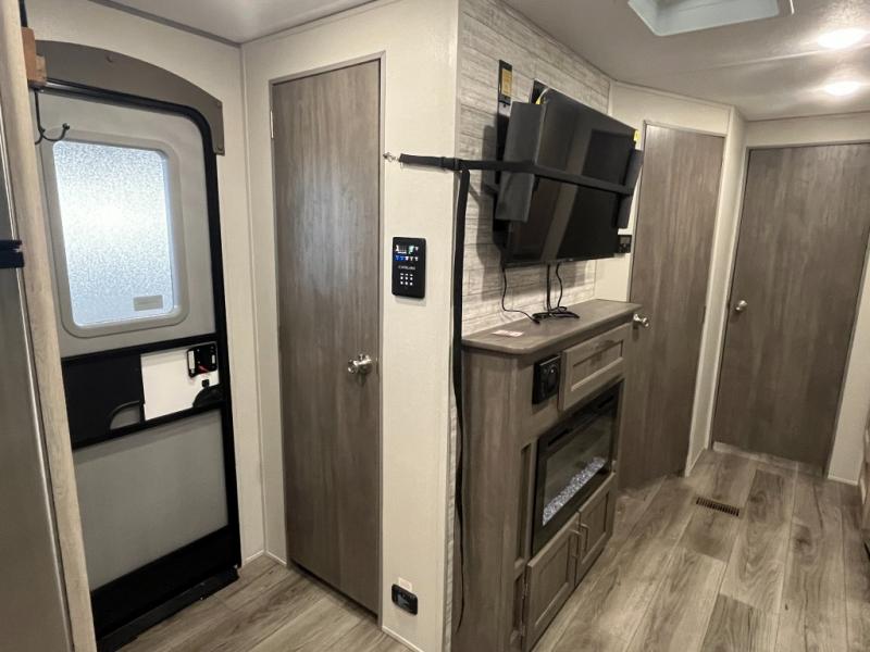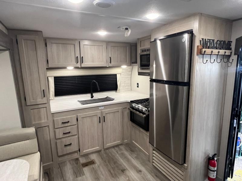 Step into comfort with this front kitchen travel trailer! You will love the amount of counter space you have to prep and cook meals. There is also an outdoor camper kitchen with a griddle and mini refrigerator for breakfast outdoors. There is plenty of storage space for all your belongings, including two kitchen pantries, overhead cabinets, a closet and a wardrobe, plus a pass-through storage. Your crew can get comfortable on the 70" sofa and booth dinette within the large slide out, and there is an entertainment center if you plan to bring your own TV. And don't overlook the rear master bedroom with a queen bed slide out, a wardrobe, plus its own exterior entry door!