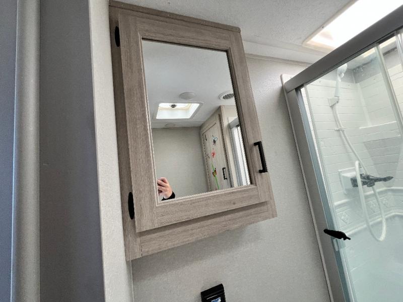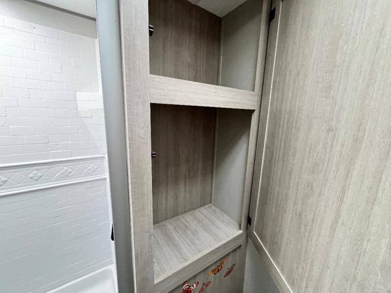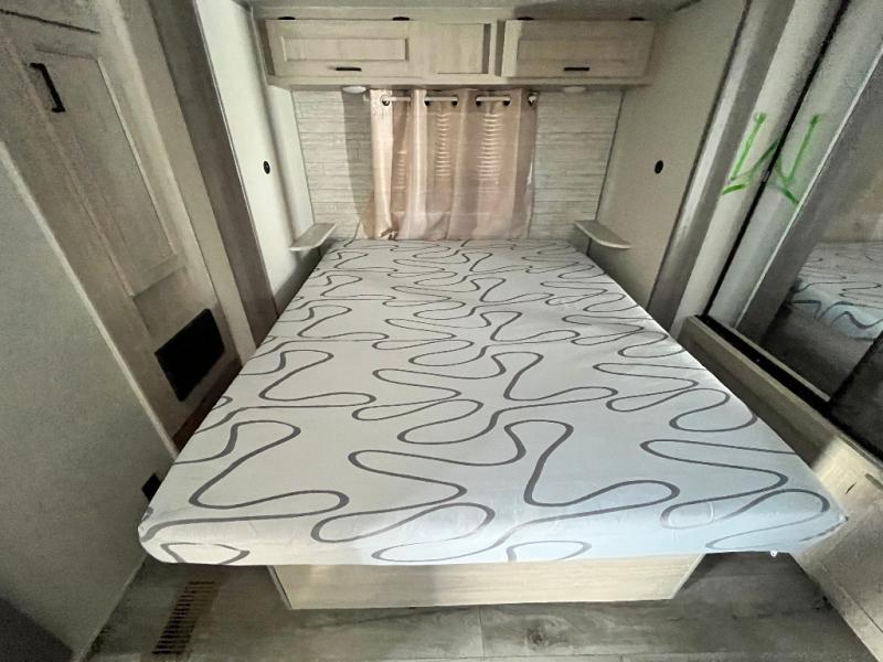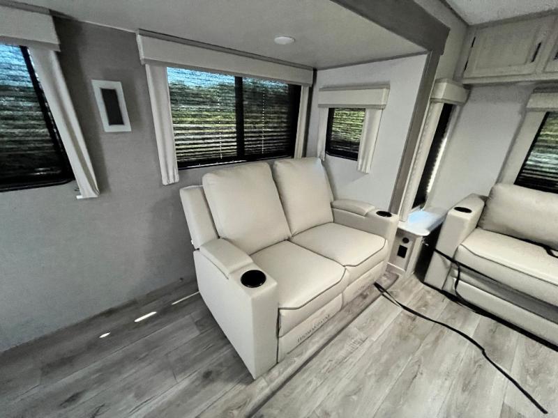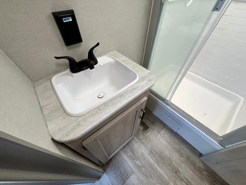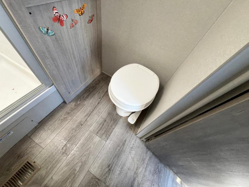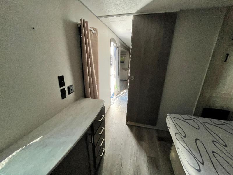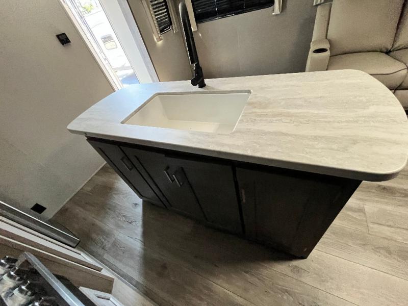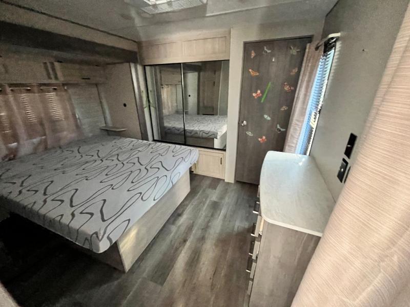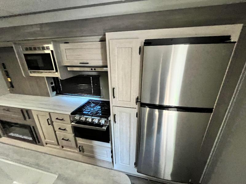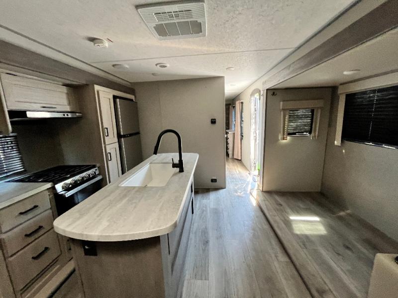 It's not hard to find comfort in this travel trailer with its triple slides, two lounge chairs, and spacious full bath. Once your crew is settled and unpacked, head outdoors to relax under the two power awnings with multicolored LED lights, or grab the fishing poles from the exterior storage and head to the water. If you'd rather spend your day inside you'll find all the comforts of home; dual lounge chairs, a sofa and booth dinette, plus a fully equipped kitchen, complete with a kitchen island! You will love having your own space in the front bedroom that includes a queen bed slide out, a dresser, plus two closets. There is even washer and dryer prep if you plan to go full-time!