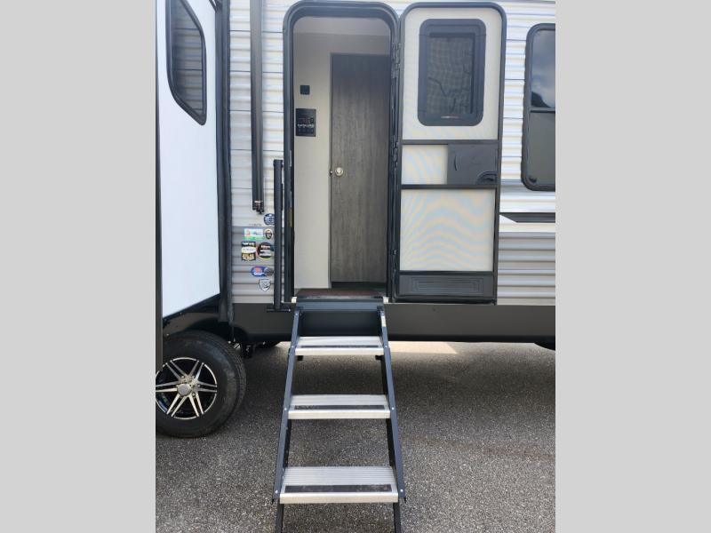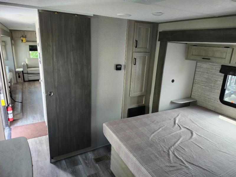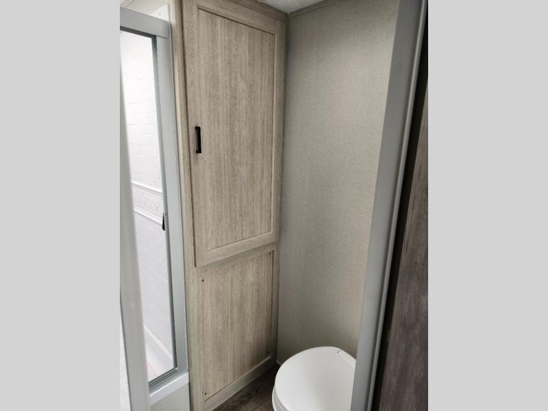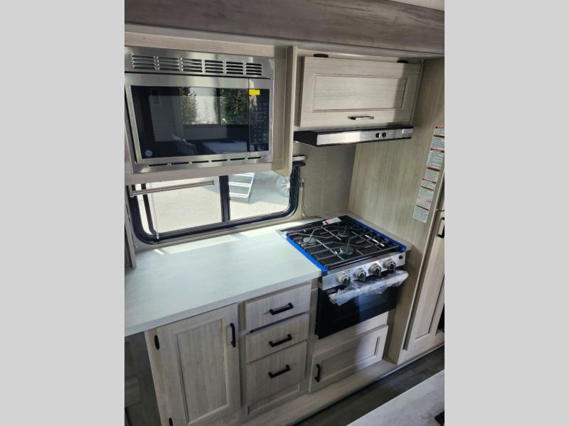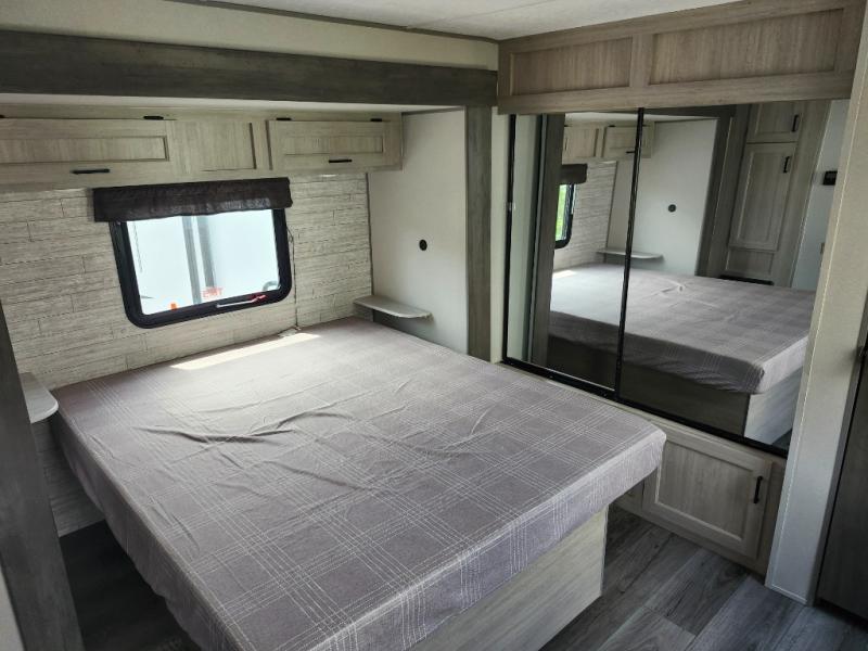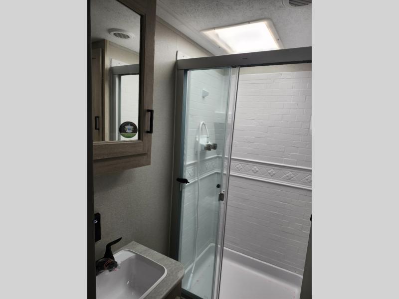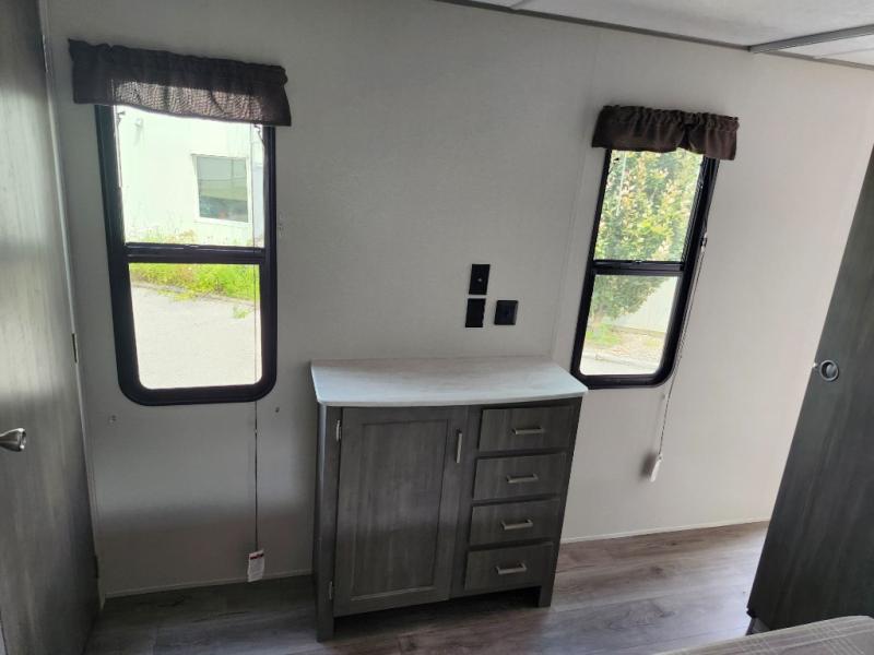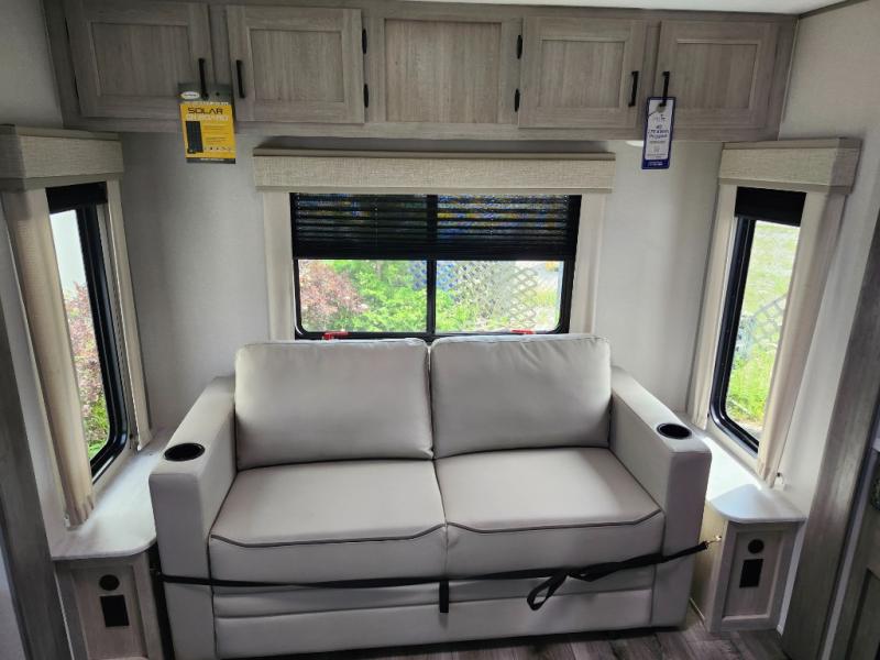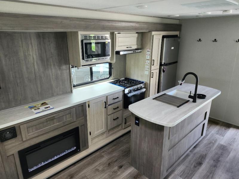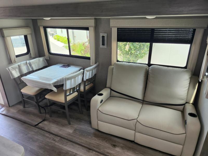 It's not hard to find comfort in this travel trailer with its triple slides, two lounge chairs, and spacious full bath. Once your crew is settled and unpacked, head outdoors to relax under the two power awnings with multicolored LED lights, or grab the fishing poles from the exterior storage and head to the water. If you'd rather spend your day inside you'll find all the comforts of home; dual lounge chairs, a sofa and booth dinette, plus a fully equipped kitchen, complete with a kitchen island! You will love having your own space in the front bedroom that includes a queen bed slide out, a dresser, plus two closets. There is even washer and dryer prep if you plan to go full-time!