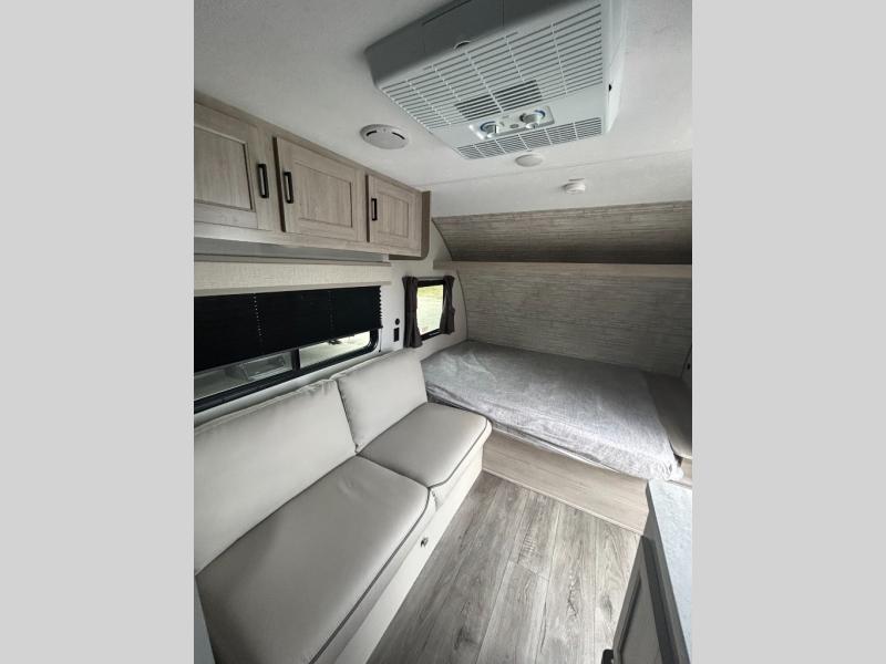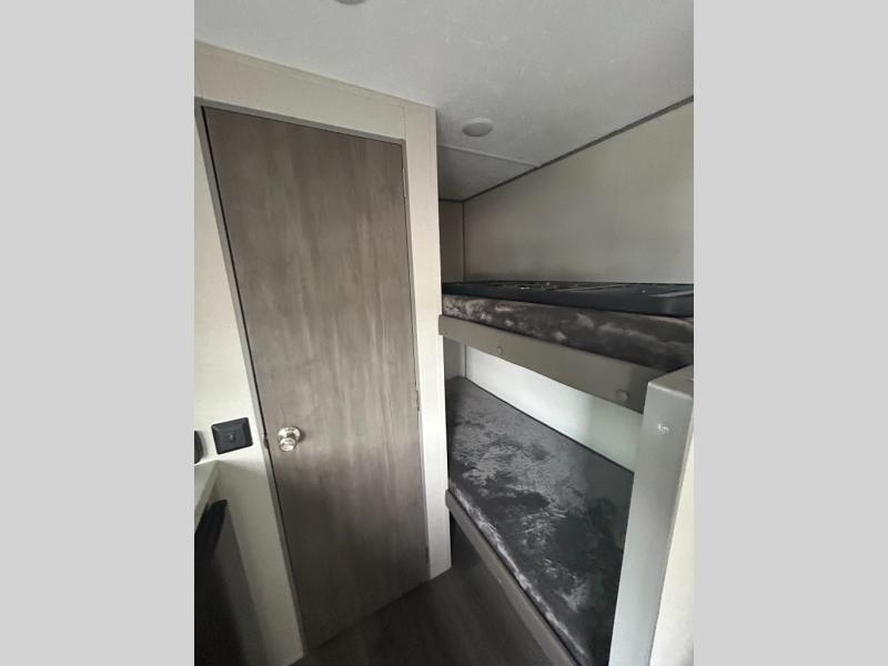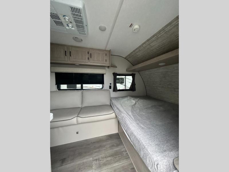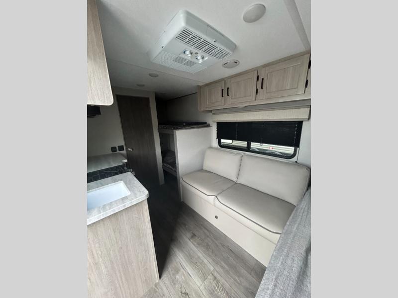 This travel trailers is perfect for a young family or smaller group. You can easily sleep four or more with the rear set of bunk beds and queen bed up front. There is also a 60" sofa for inside down-time, as well as complete kitchen and bath amenities so you can cook and stay clean while traveling. The rear corner bath features a toilet and 36" x 30" shower, and it's conveniently located next to the bunk beds which is great for little ones at night. Cooking inside will be easy with a GE stainless two-burner cooktop and single sink, plus there is also a GE microwave oven for snacks and things that you can easily warm up. If you plan to spend most of your time outdoors, you will find plenty of storage space in the front exterior storage compartment, and there is also plenty of storage inside as well.