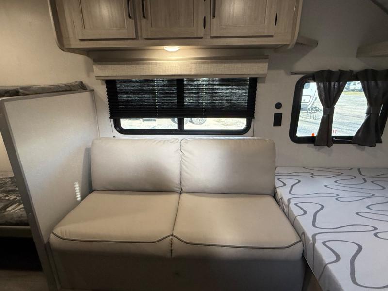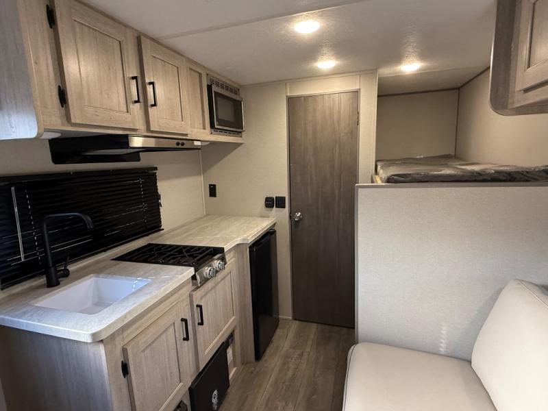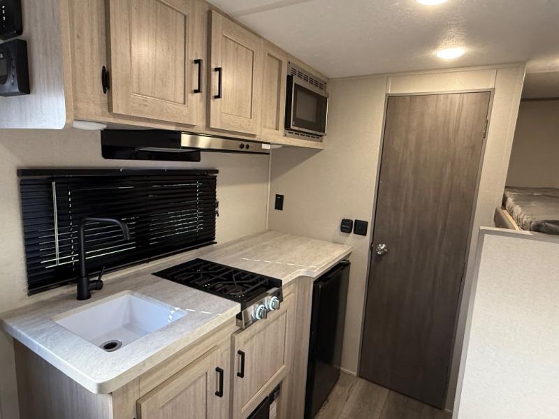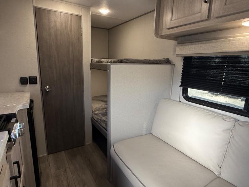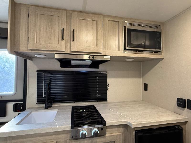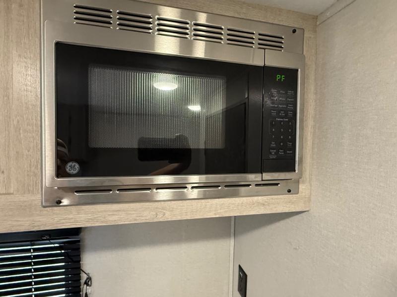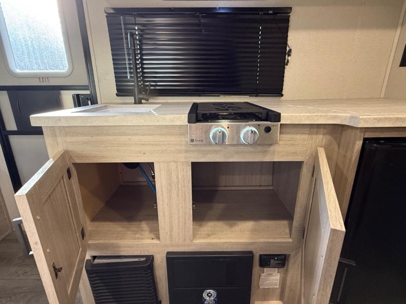 This travel trailers is perfect for a young family or smaller group. You can easily sleep four or more with the rear set of bunk beds and queen bed up front. There is also a 60" sofa for inside down-time, as well as complete kitchen and bath amenities so you can cook and stay clean while traveling. The rear corner bath features a toilet and 36" x 30" shower, and it's conveniently located next to the bunk beds which is great for little ones at night. Cooking inside will be easy with a GE stainless two-burner cooktop and single sink, plus there is also a GE microwave oven for snacks and things that you can easily warm up. If you plan to spend most of your time outdoors, you will find plenty of storage space in the front exterior storage compartment, and there is also plenty of storage inside as well.