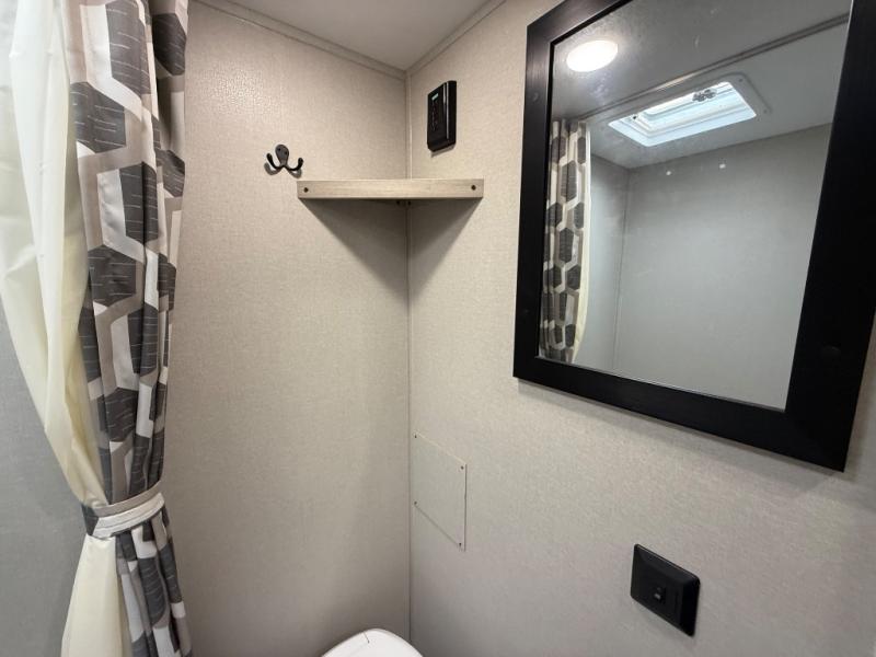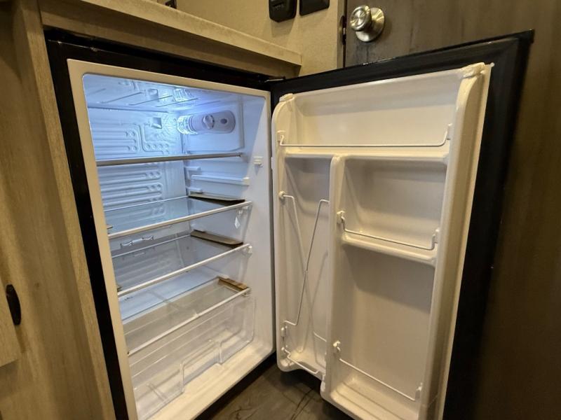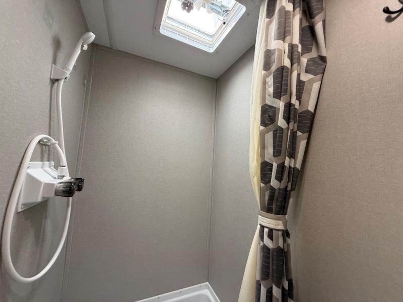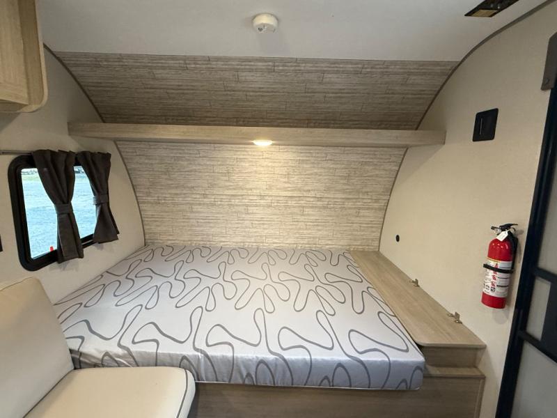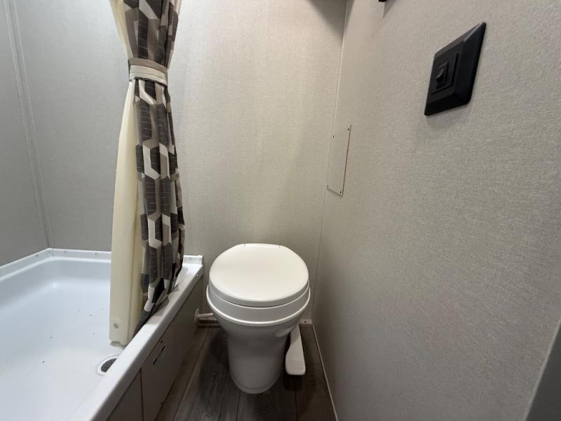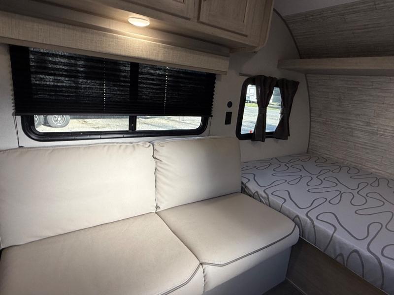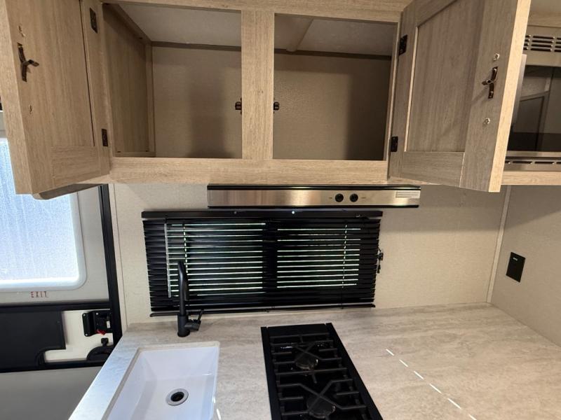 This travel trailers is perfect for a young family or smaller group. You can easily sleep four or more with the rear set of bunk beds and queen bed up front. There is also a 60" sofa for inside down-time, as well as complete kitchen and bath amenities so you can cook and stay clean while traveling. The rear corner bath features a toilet and 36" x 30" shower, and it's conveniently located next to the bunk beds which is great for little ones at night. Cooking inside will be easy with a GE stainless two-burner cooktop and single sink, plus there is also a GE microwave oven for snacks and things that you can easily warm up. If you plan to spend most of your time outdoors, you will find plenty of storage space in the front exterior storage compartment, and there is also plenty of storage inside as well.