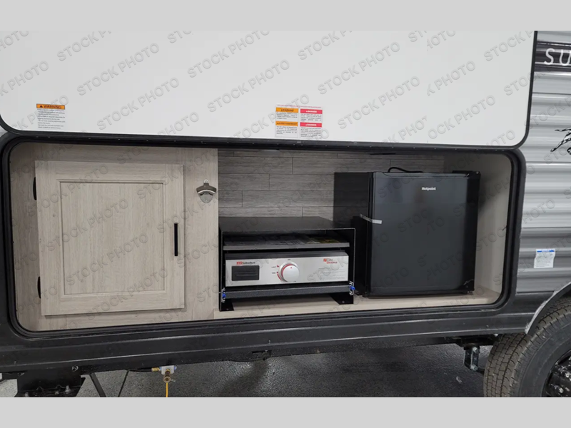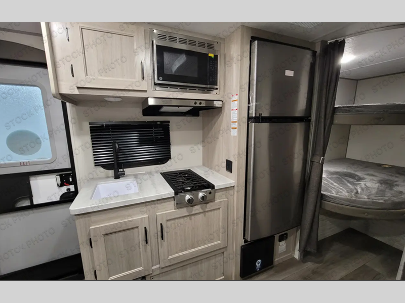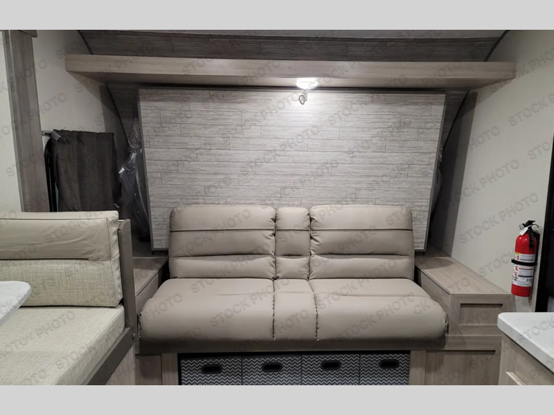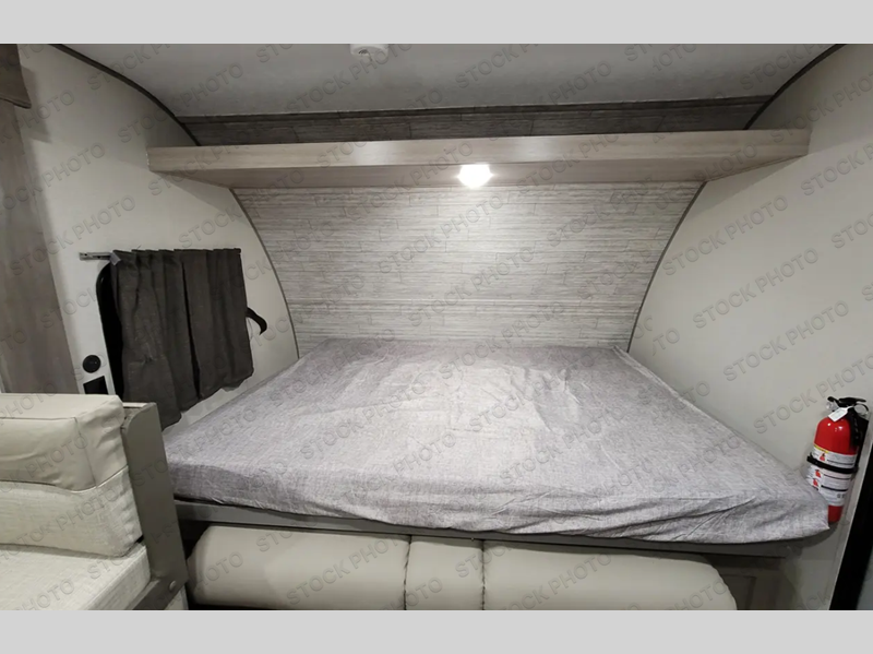 This trailer is easy to tow, store, and maneuver at campgrounds into parking spots! After a day of exploring, everyone can enjoy napping or falling asleep on the double-size bunks next to the full bathroom, or on the Murphy bed up front. There is also under-bunk storage for lake gear or extra luggage! This front multi-use space offers both a living area and bedroom depending on the time of day. The U-shaped dinette gives everyone a place to dine inside, or you can head outside to grab your camping chairs from the pass-through storage and dine under the 15' power awning with multicolor LED lights. There is much more to enjoy inside and outside, and you might like to add the optional camper kitchen as well.