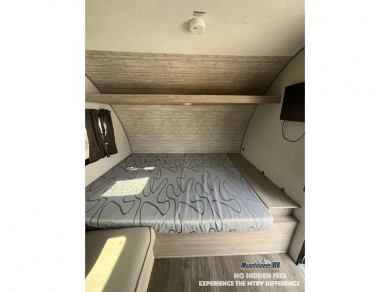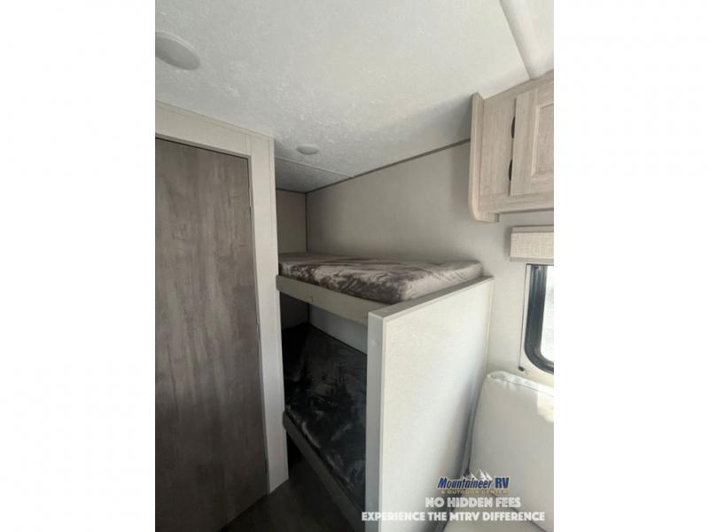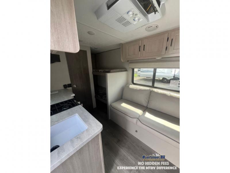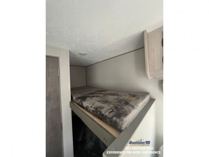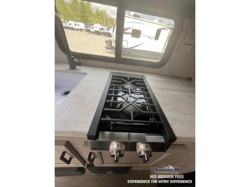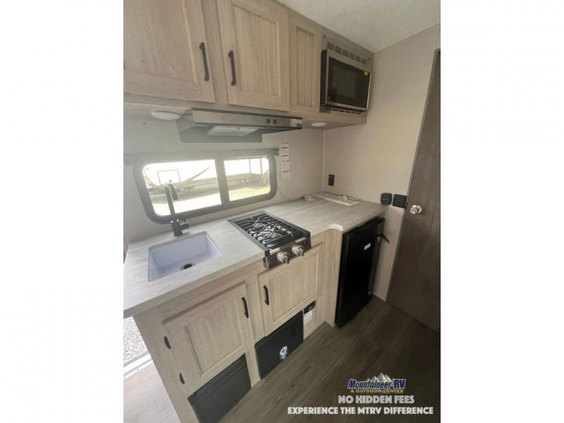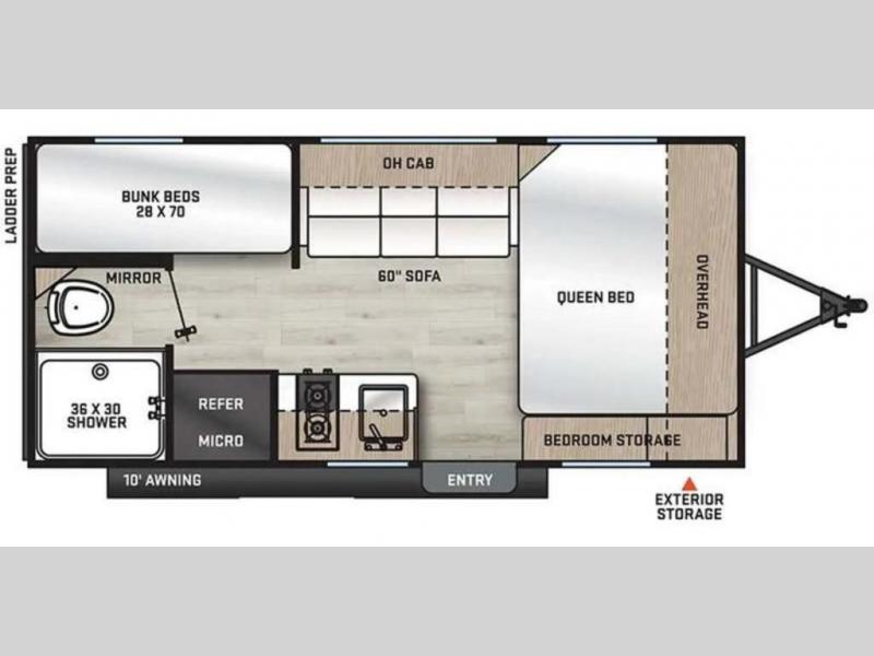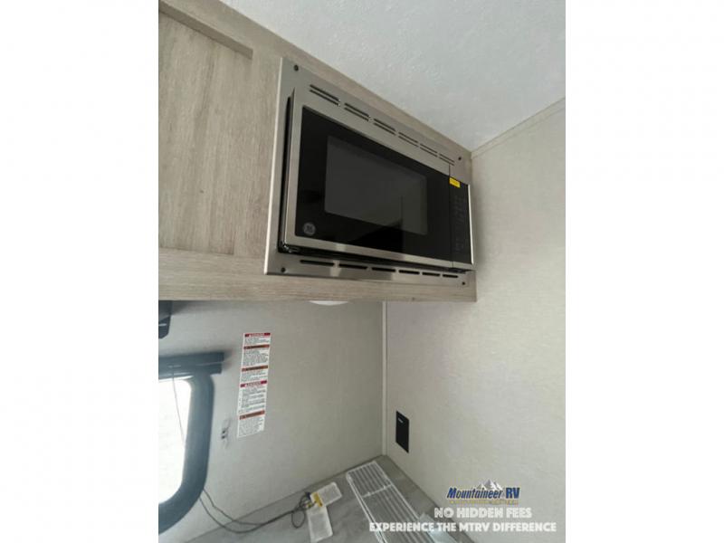 This travel trailers is perfect for a young family or smaller group. You can easily sleep four or more with the rear set of bunk beds and queen bed up front. There is also a 60" sofa for inside down-time, as well as complete kitchen and bath amenities so you can cook and stay clean while traveling. The rear corner bath features a toilet and 36" x 30" shower, and it's conveniently located next to the bunk beds which is great for little ones at night. Cooking inside will be easy with a GE stainless two-burner cooktop and single sink, plus there is also a GE microwave oven for snacks and things that you can easily warm up. If you plan to spend most of your time outdoors, you will find plenty of storage space in the front exterior storage compartment, and there is also plenty of storage inside as well.