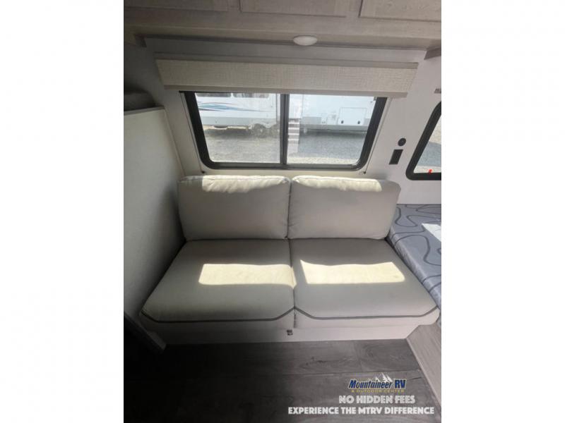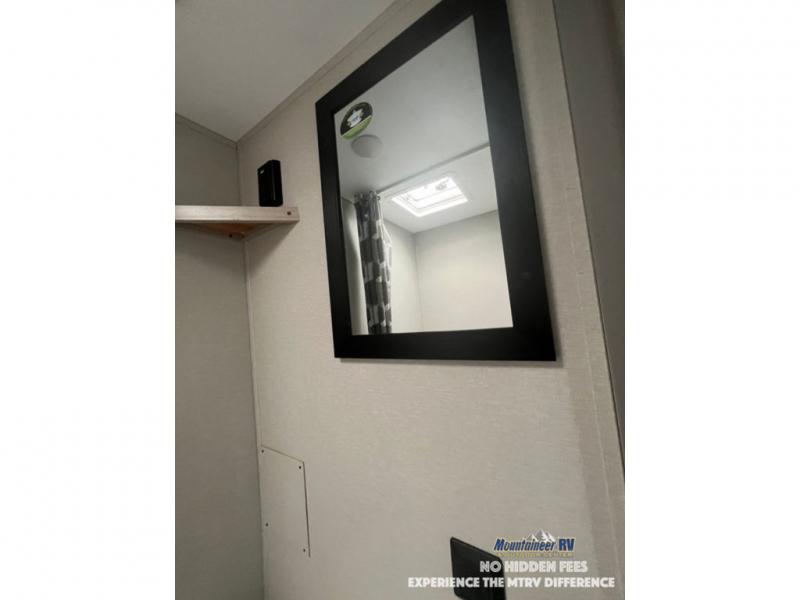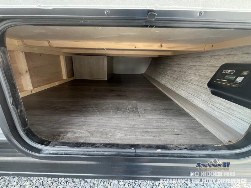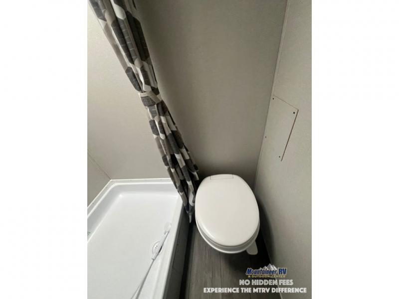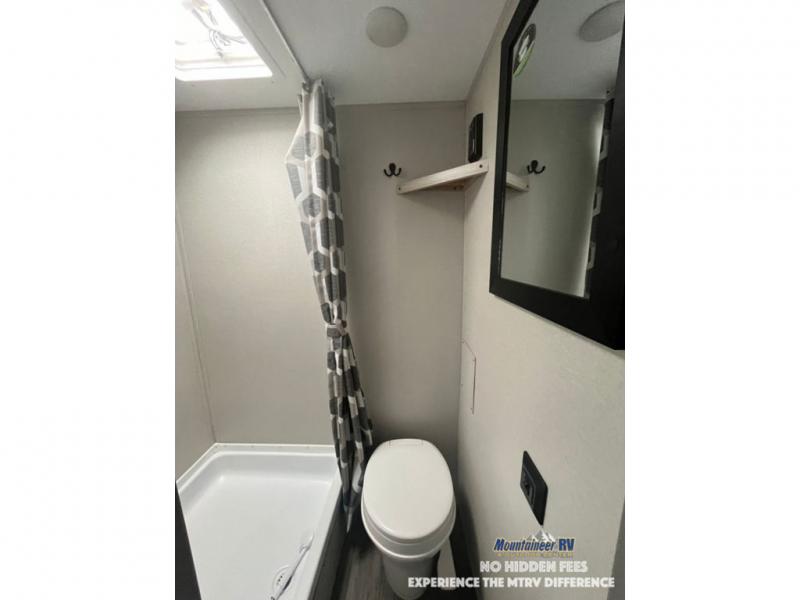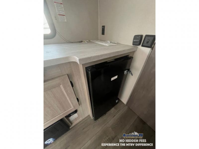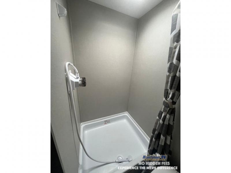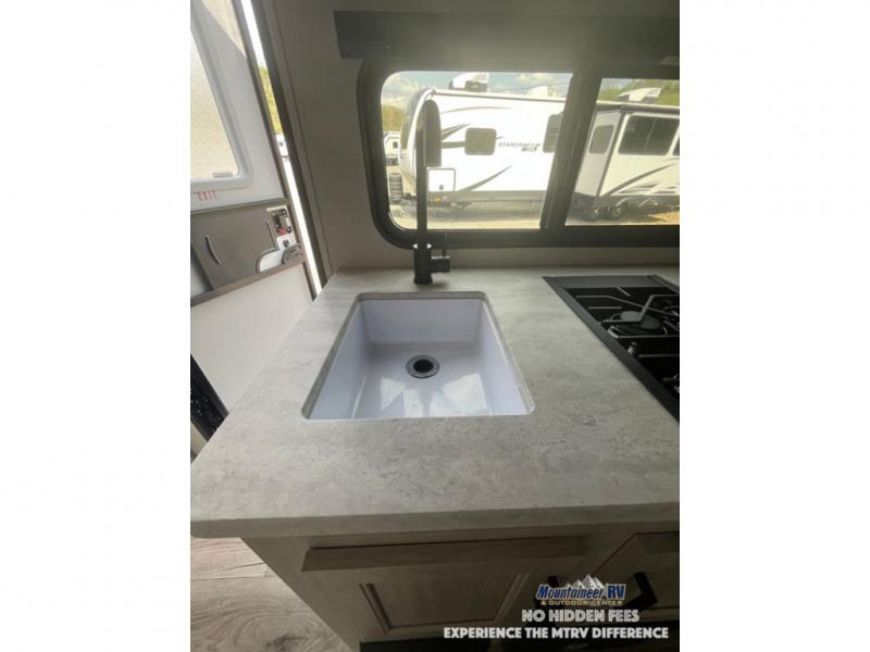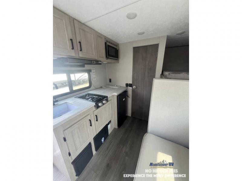 This travel trailers is perfect for a young family or smaller group. You can easily sleep four or more with the rear set of bunk beds and queen bed up front. There is also a 60" sofa for inside down-time, as well as complete kitchen and bath amenities so you can cook and stay clean while traveling. The rear corner bath features a toilet and 36" x 30" shower, and it's conveniently located next to the bunk beds which is great for little ones at night. Cooking inside will be easy with a GE stainless two-burner cooktop and single sink, plus there is also a GE microwave oven for snacks and things that you can easily warm up. If you plan to spend most of your time outdoors, you will find plenty of storage space in the front exterior storage compartment, and there is also plenty of storage inside as well.