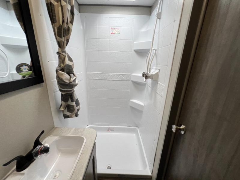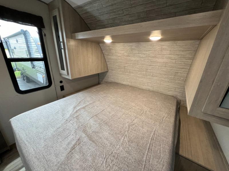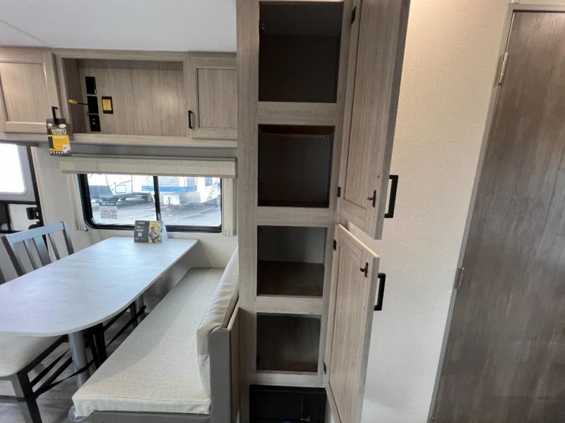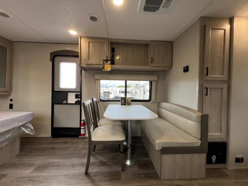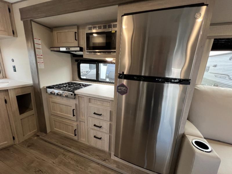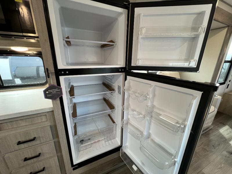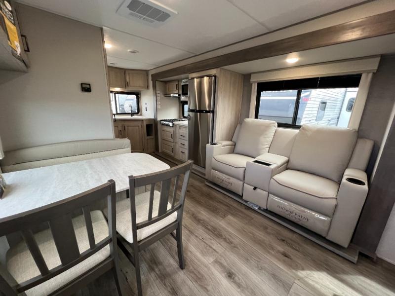 This is the perfect travel trailer for a couple who wants to escape the hustle and bustle of everyday life! The front queen bed offers a comfortable place to rest your head at night with wardrobes on either side to store your clothes. The 68" theater seating is great for relaxing after a day at the beach, and the dinette with two chairs on one side and bench seating on the other will be perfect to dine around or play games at. The fully equipped kitchen offers all the appliances needed to make all your meals, such as a GE stainless three burner cooktop, a GE stainless microwave, plus a GE stainless 10.7 cu. ft. 12V refrigerator. You can also freshen up in the rear corner bathroom with the 36" x 30 shower!