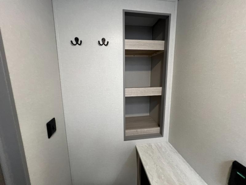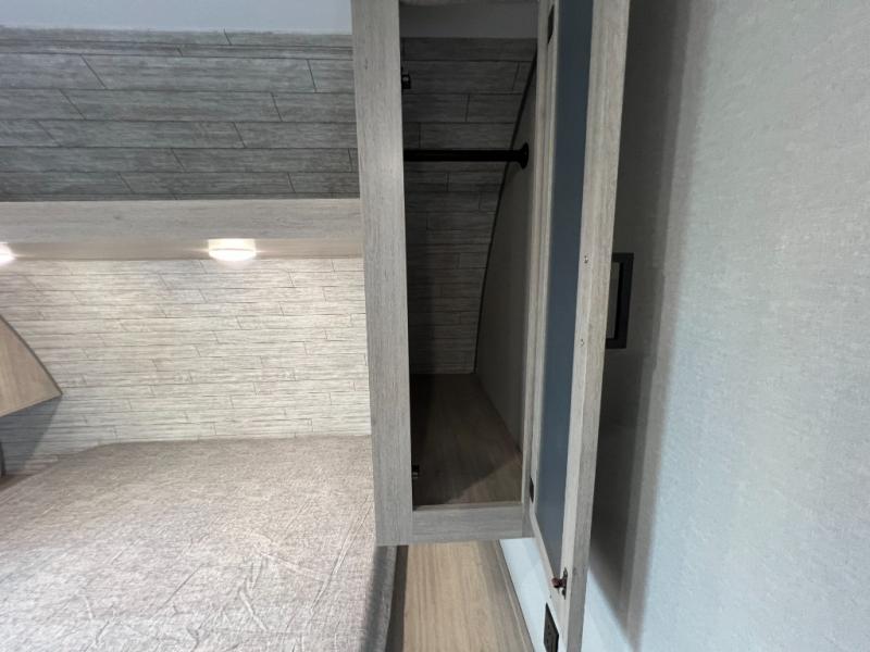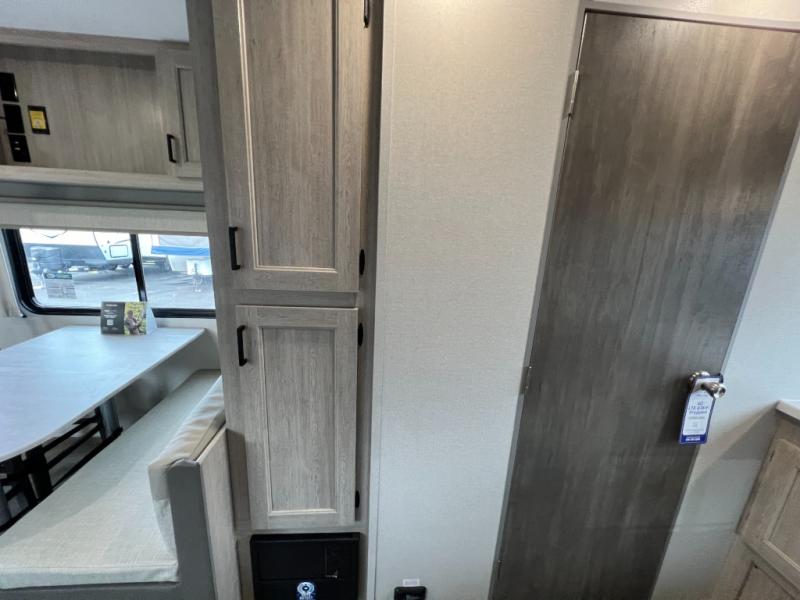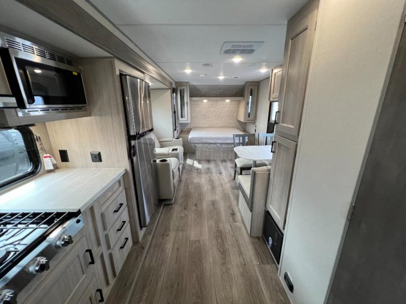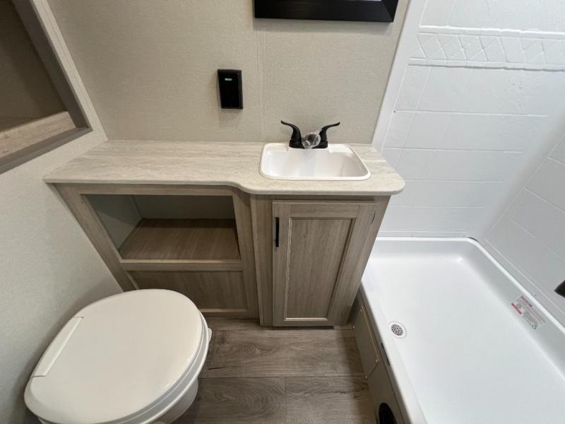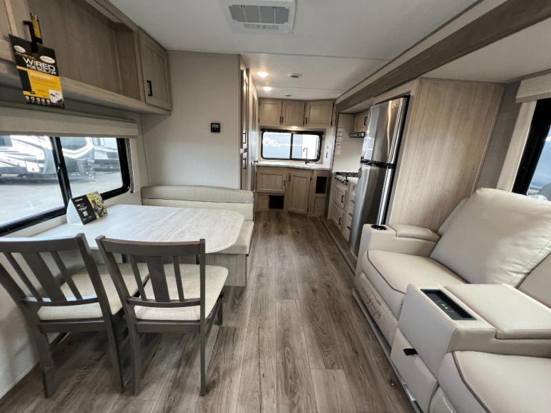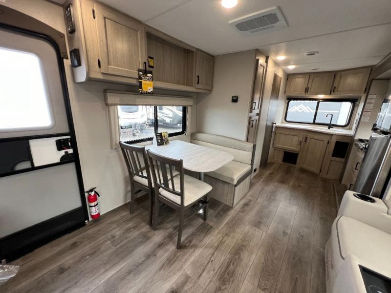 This is the perfect travel trailer for a couple who wants to escape the hustle and bustle of everyday life! The front queen bed offers a comfortable place to rest your head at night with wardrobes on either side to store your clothes. The 68" theater seating is great for relaxing after a day at the beach, and the dinette with two chairs on one side and bench seating on the other will be perfect to dine around or play games at. The fully equipped kitchen offers all the appliances needed to make all your meals, such as a GE stainless three burner cooktop, a GE stainless microwave, plus a GE stainless 10.7 cu. ft. 12V refrigerator. You can also freshen up in the rear corner bathroom with the 36" x 30 shower!
