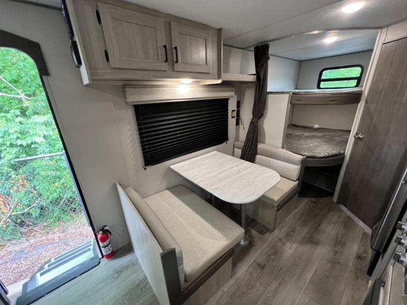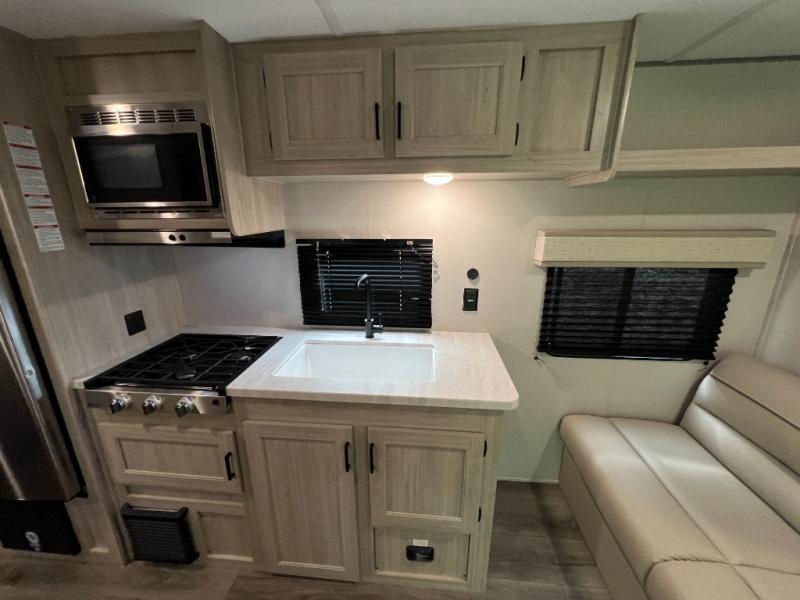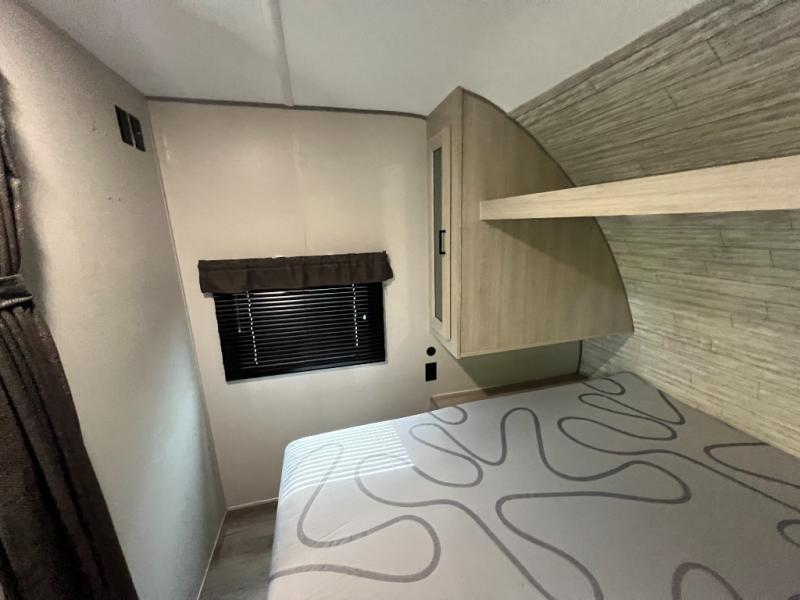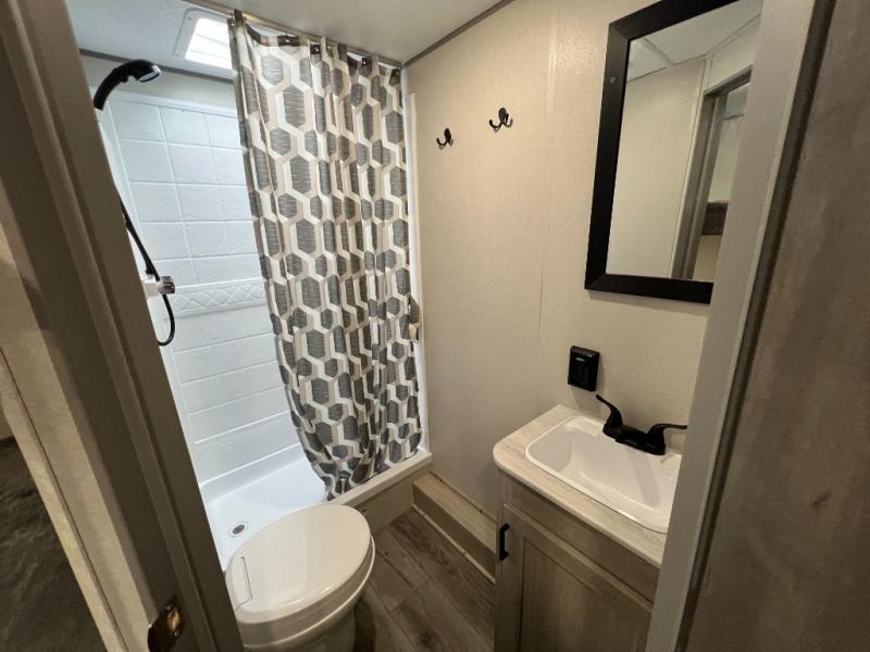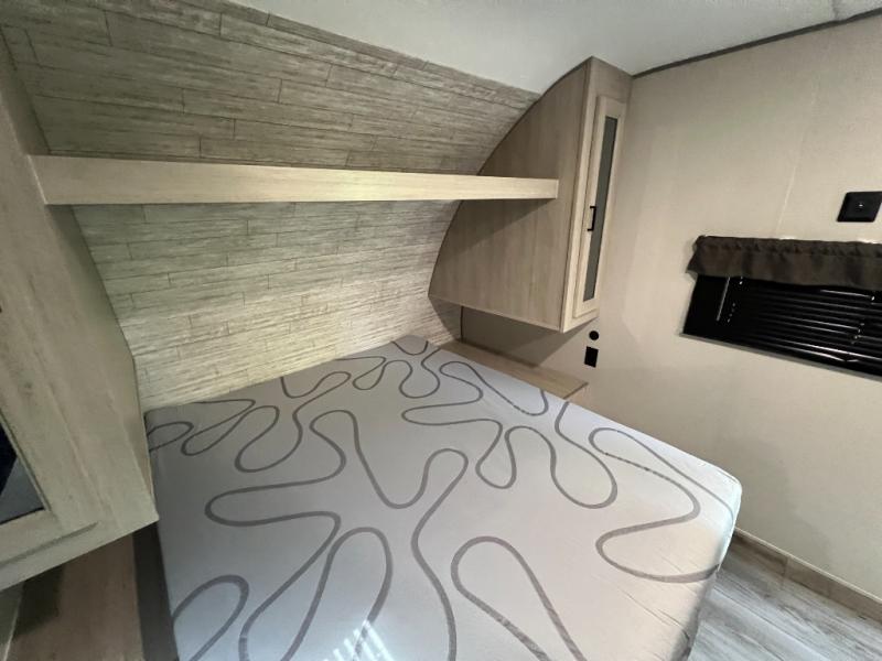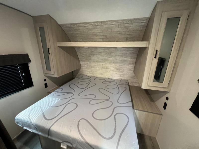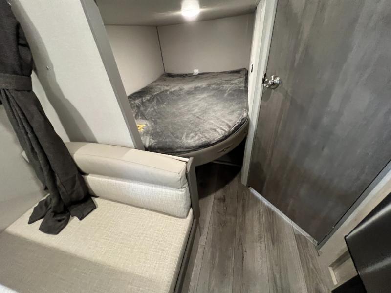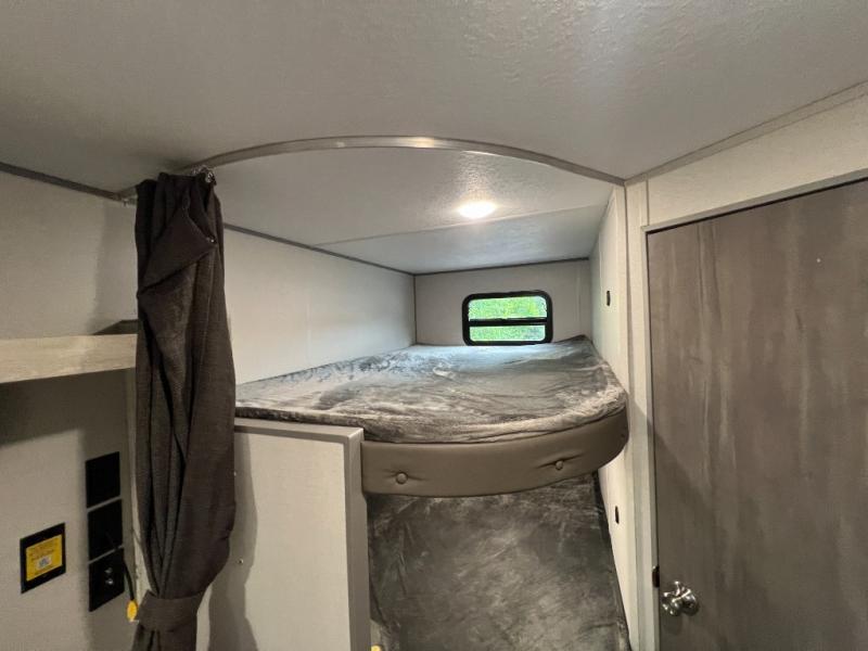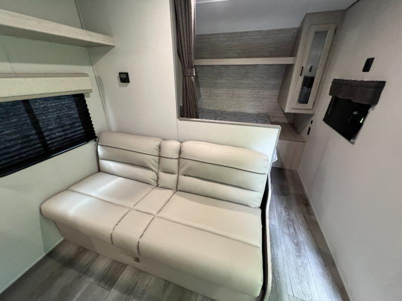 You get to choose to sit at the sofa or at the booth dinette when you are relaxing inside. There is a shelf with storage totes above the sofa for your belongings, and an additional overhead cabinet above the dinette for games. Maybe you want to rest on your own queen bed in the front semi-private bedroom before you make a meal in the kitchen or take a hike through the trails around the lake. The 15' electric awning with multi-color LED lights and a remote offers an outdoor living area where you can visit with other RVers. The kids will love their own double-size bunks that they can share with a friend or two, and the full bathroom is nearby as an added convenience.