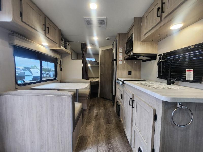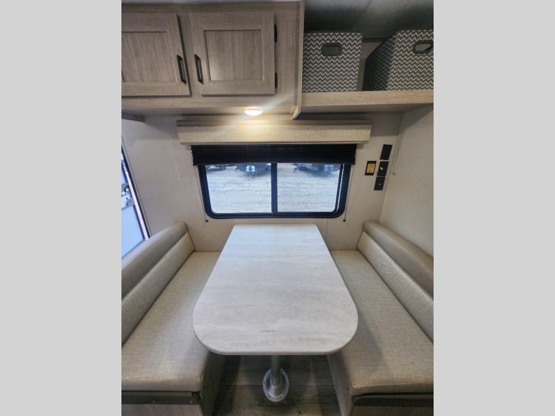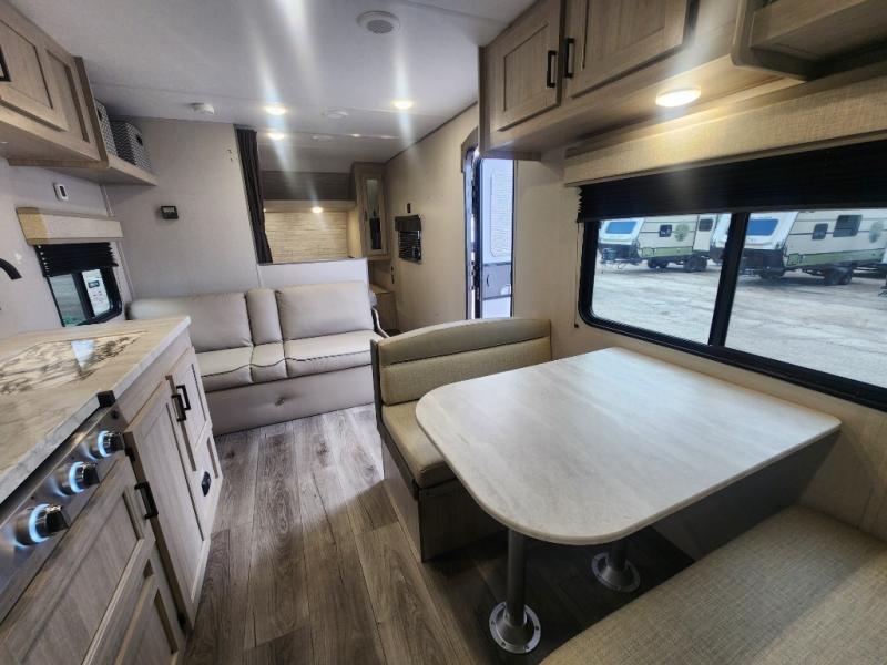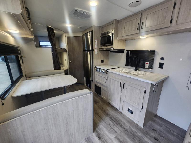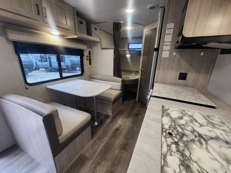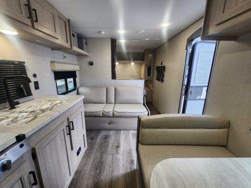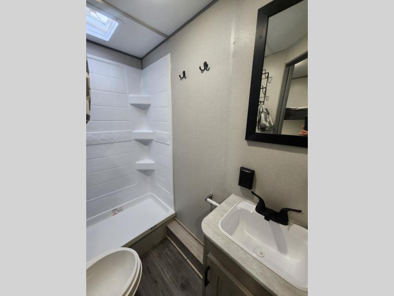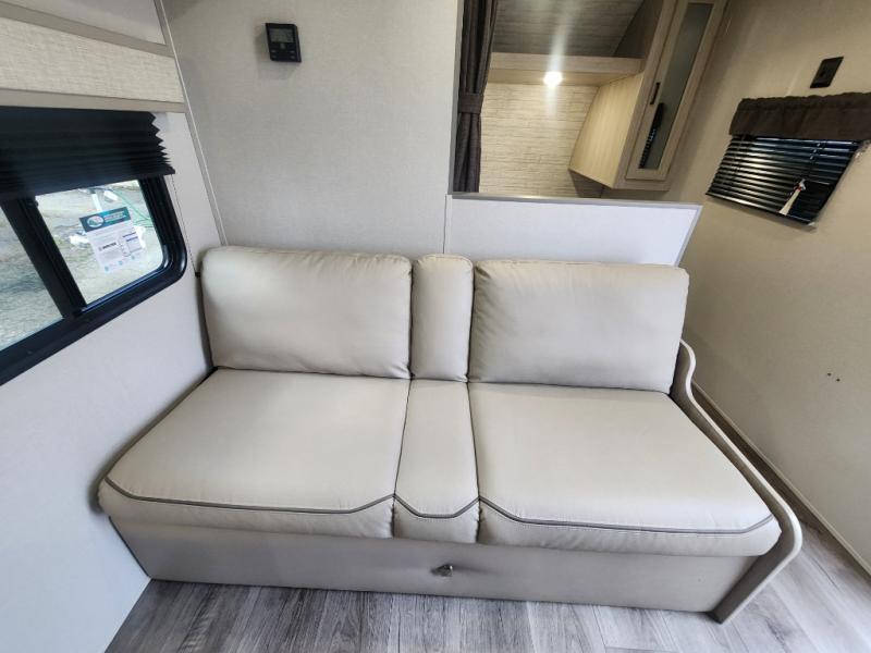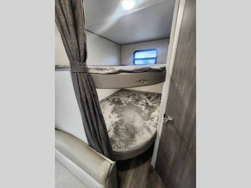 You get to choose to sit at the sofa or at the booth dinette when you are relaxing inside. There is a shelf with storage totes above the sofa for your belongings, and an additional overhead cabinet above the dinette for games. Maybe you want to rest on your own queen bed in the front semi-private bedroom before you make a meal in the kitchen or take a hike through the trails around the lake. The 15' electric awning with multi-color LED lights and a remote offers an outdoor living area where you can visit with other RVers. The kids will love their own double-size bunks that they can share with a friend or two, and the full bathroom is nearby as an added convenience.