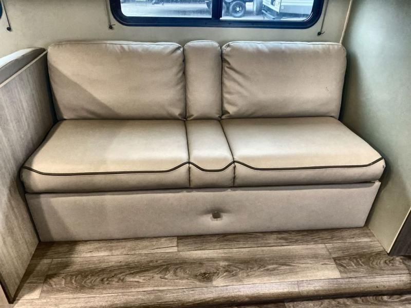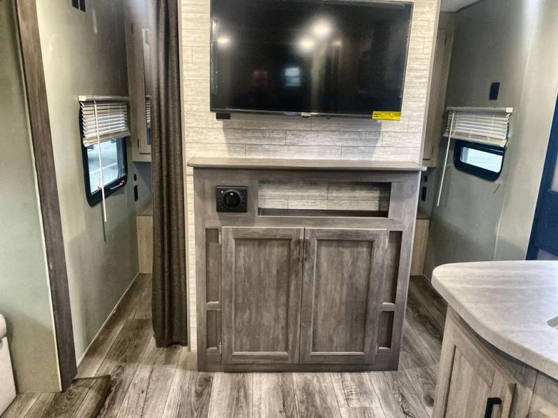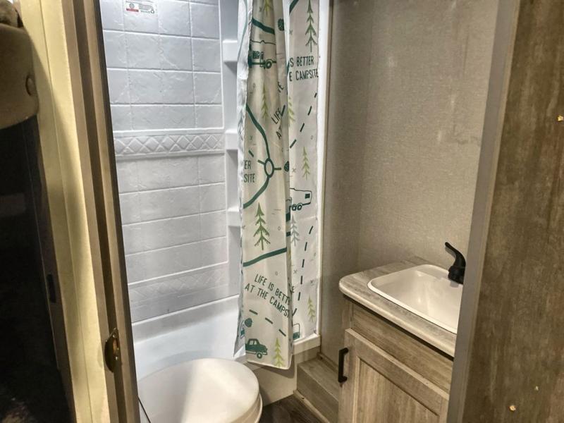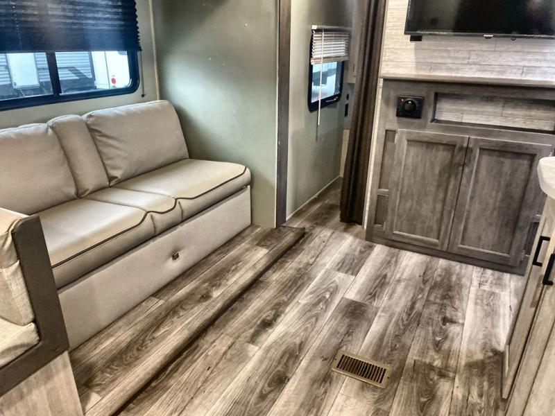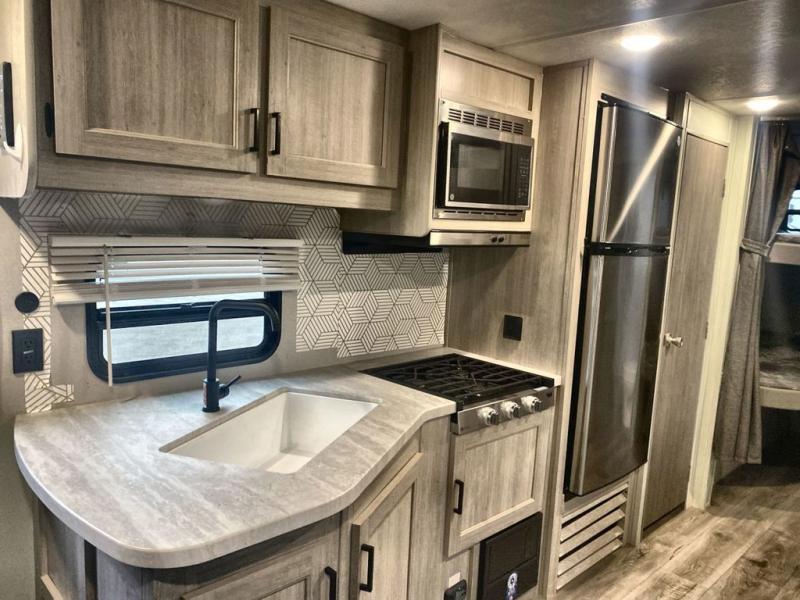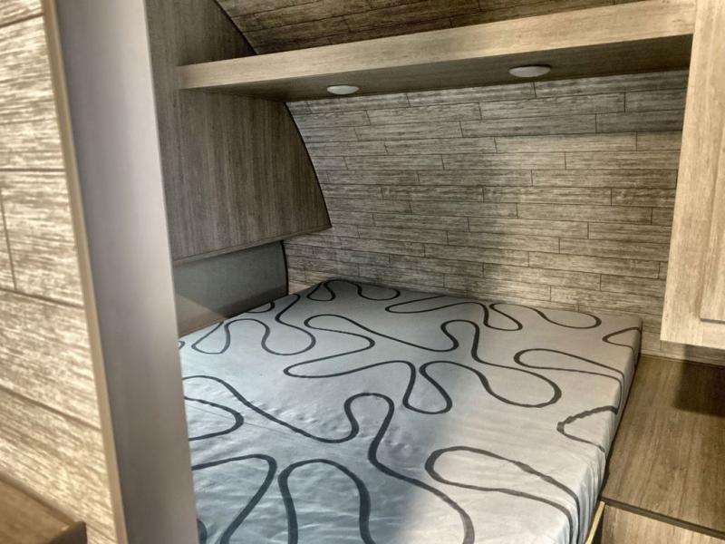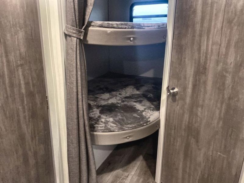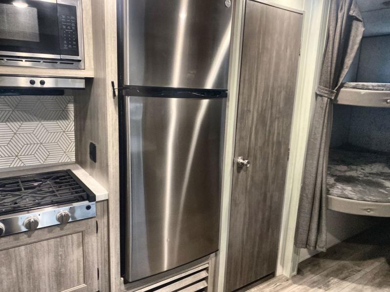 This is the perfect mid-size travel trailer for you and your family! The 46" x 74" double-size bunk beds with lower interior storage offer a comfortable sleeping space for the kids and you will have your own private sleeping space with the 60" x 74" queen bed in the front private bedroom. Freshen up each morning in the rear corner bathroom with the tub/shower and a mirror to get ready each morning. You can prepare your best home cooked meals with the GE stainless three burner cooktop and GE stainless 10.7 cu. ft. 12V refrigerator, then enjoy them together at the booth dinette. The sofa is near the entertainment center for a relaxing movie night. Don't leave any of your outdoor gear behind either thanks to the front pass-through storage area and the exterior outside storage area. You could even add the optional outside camper kitchen to grill the catch of the day on the pull out griddle!
