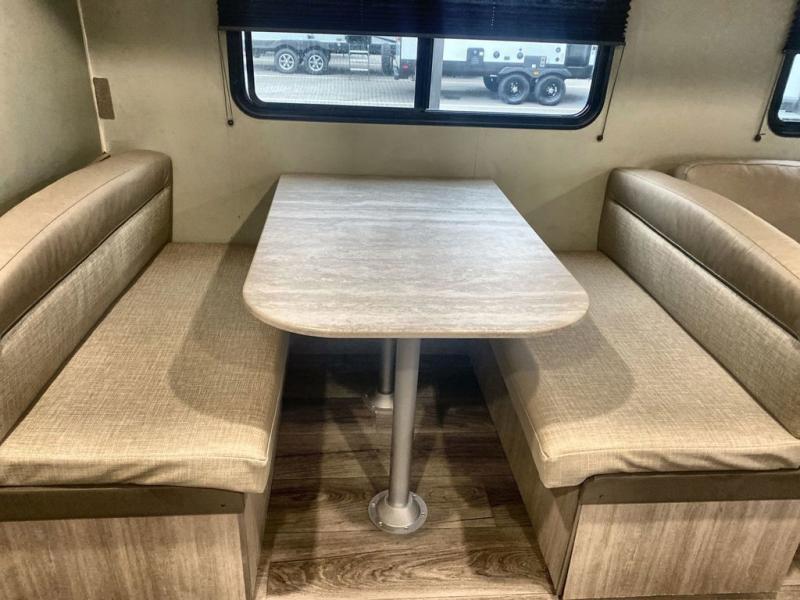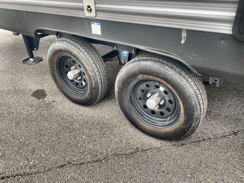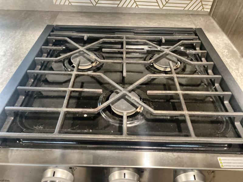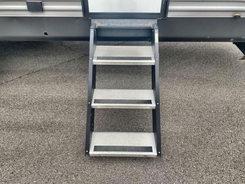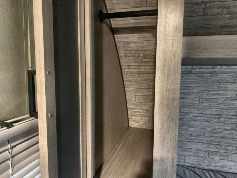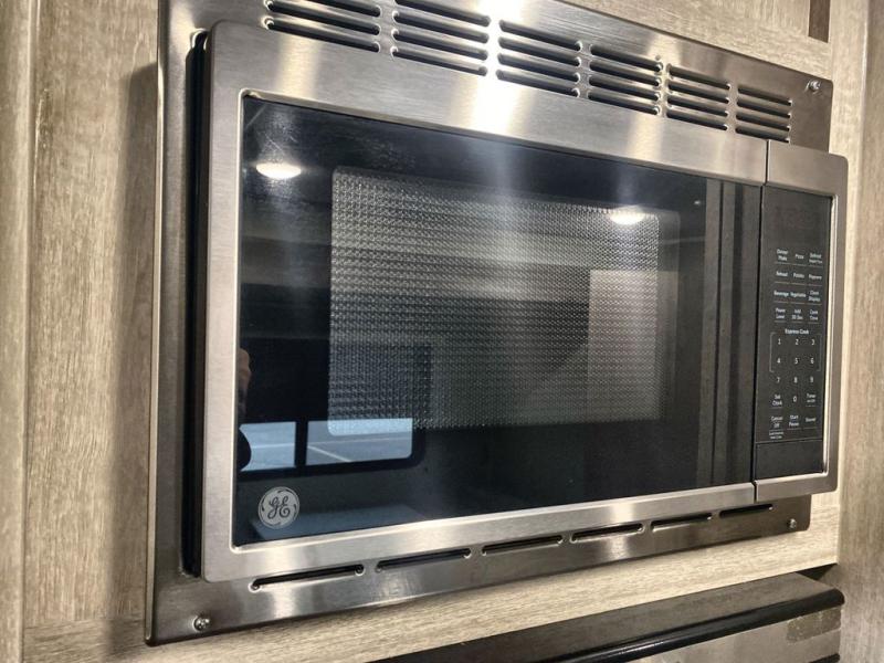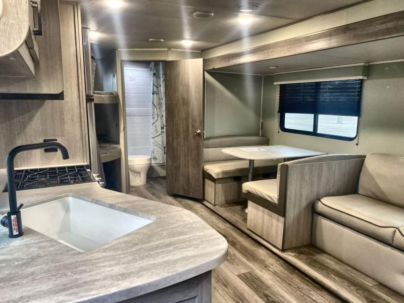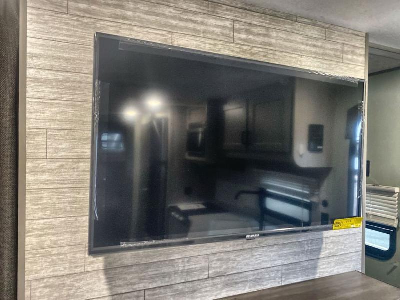 This is the perfect mid-size travel trailer for you and your family! The 46" x 74" double-size bunk beds with lower interior storage offer a comfortable sleeping space for the kids and you will have your own private sleeping space with the 60" x 74" queen bed in the front private bedroom. Freshen up each morning in the rear corner bathroom with the tub/shower and a mirror to get ready each morning. You can prepare your best home cooked meals with the GE stainless three burner cooktop and GE stainless 10.7 cu. ft. 12V refrigerator, then enjoy them together at the booth dinette. The sofa is near the entertainment center for a relaxing movie night. Don't leave any of your outdoor gear behind either thanks to the front pass-through storage area and the exterior outside storage area. You could even add the optional outside camper kitchen to grill the catch of the day on the pull out griddle!