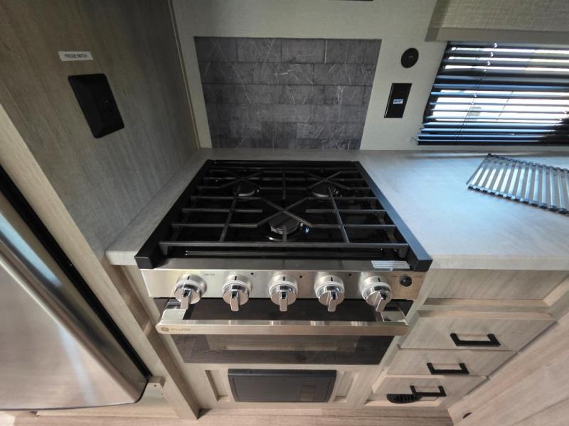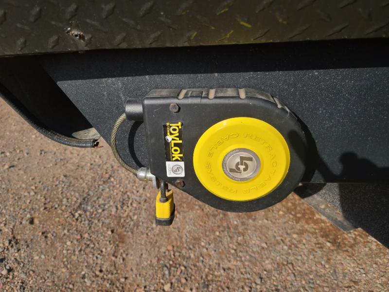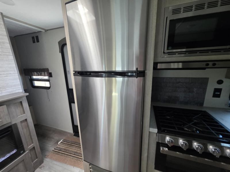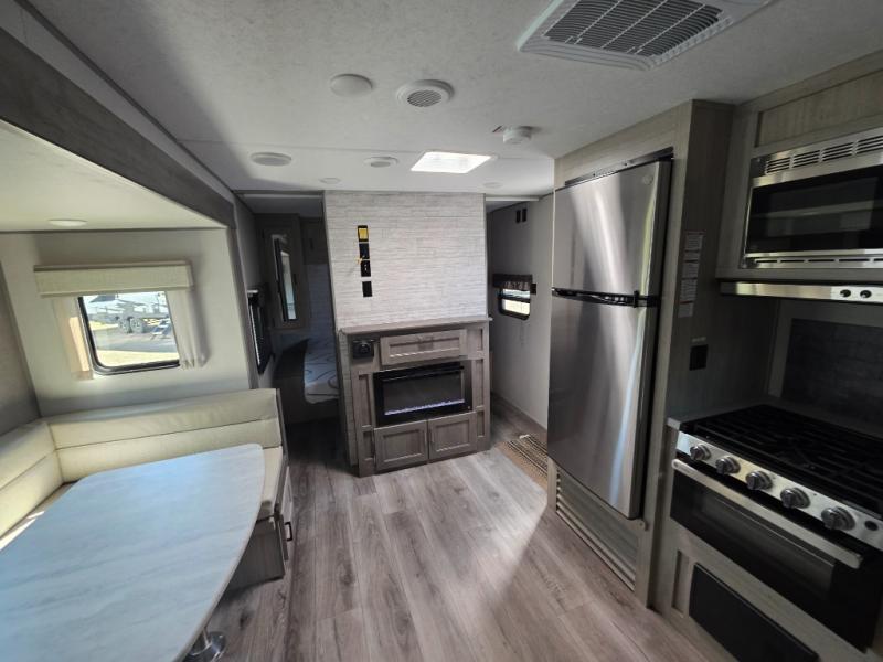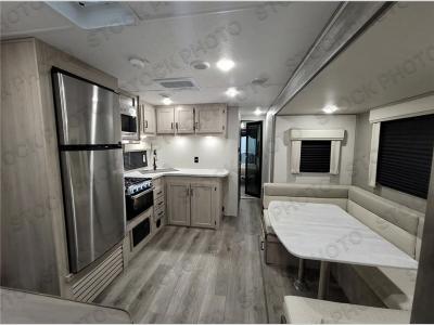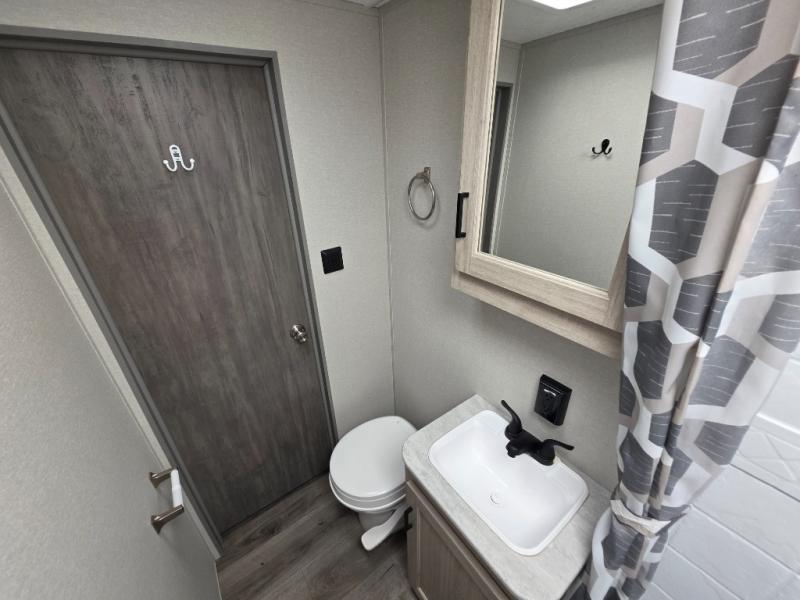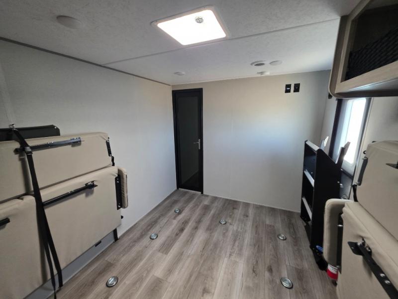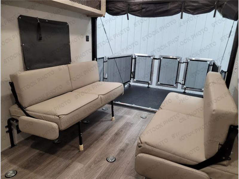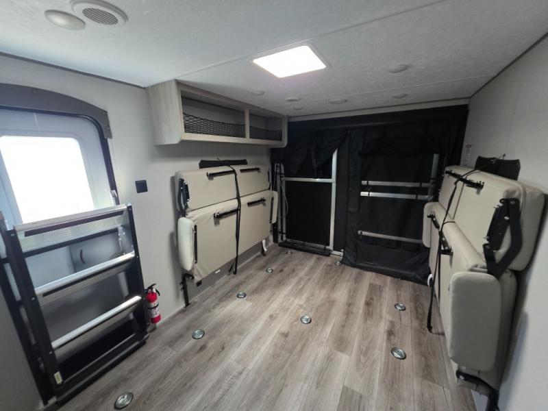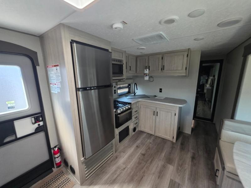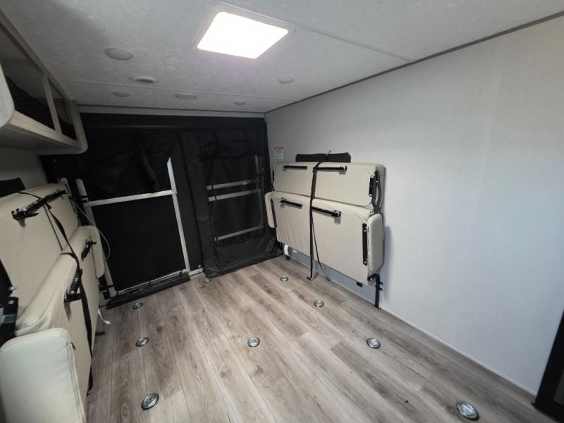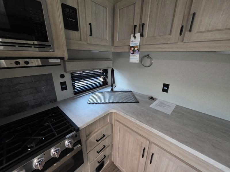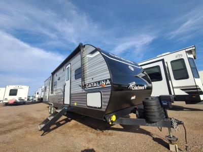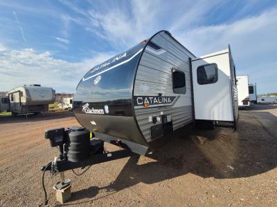 The best looking, most affordable toy hauler is found in the Catalina Trailer Blazer by Coachmen. Each one is constructed with a seamless alpha roof membrane, an enclosed and fully sealed underbelly, and a cambered structural steel I-beam frame for added support. There is a rear loading cargo door with a 3,000 lb. capacity, a black out screen wall with a zip walk-thru and windows, plus 500 lb. tie-downs to secure your toys. You'll love the interior with its Congoleum woodplank linoleum flooring and LED interior lighting. Head outside to find an electric awning with multicolored LED lights and a remote, a 15' Toy Loc cable, a "Leash Link" quick hookup D-ring for pets, and upgraded aluminum wheels. The Catalina Trail Blazer also comes with RV-LINK 4G LTE connectivity with a WiFi booster and extender, a JBL Aura Cube media center, plus premium JBL interior speakers for your pleasure!