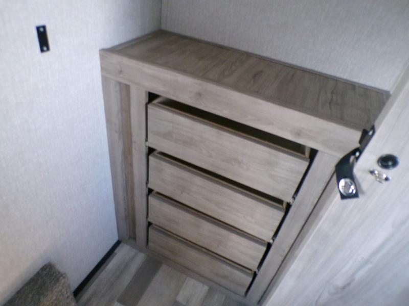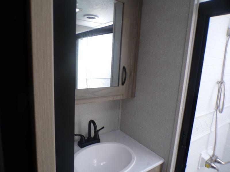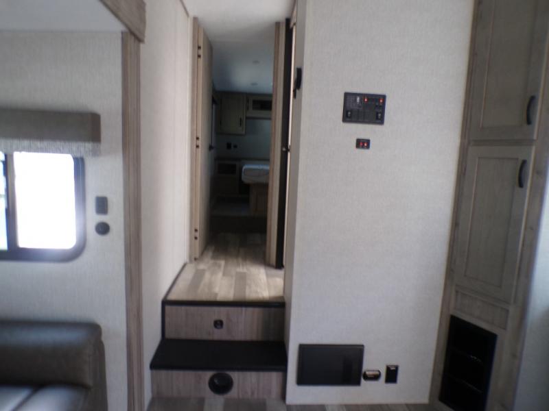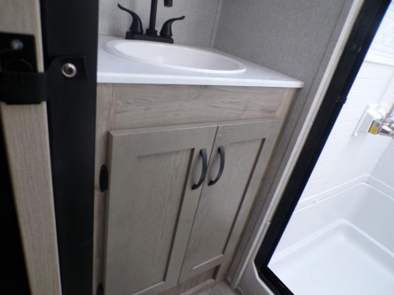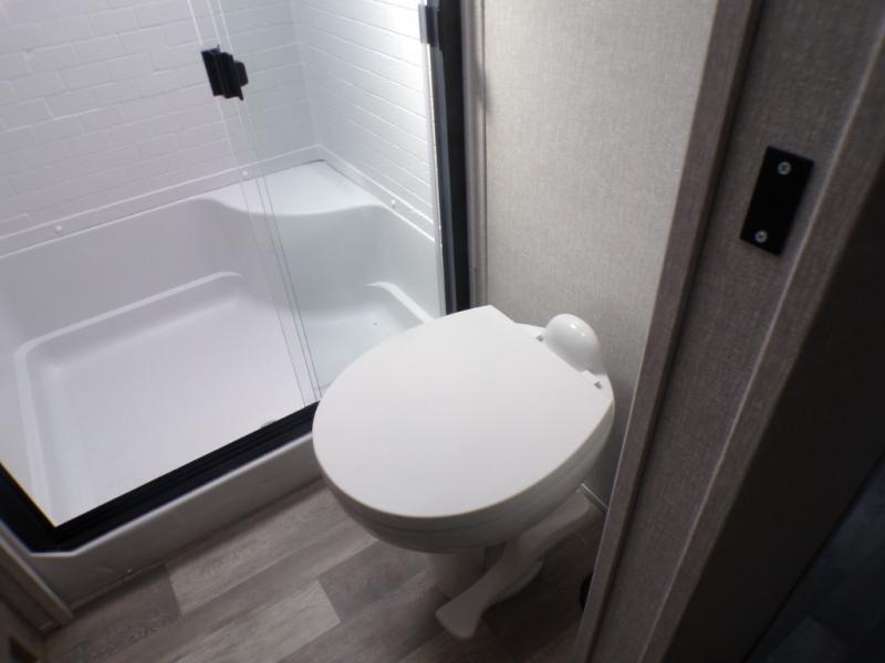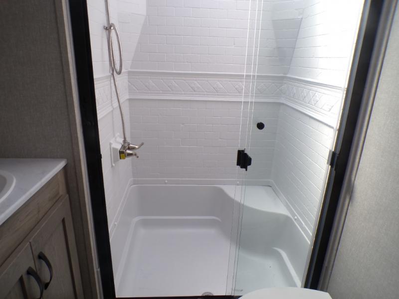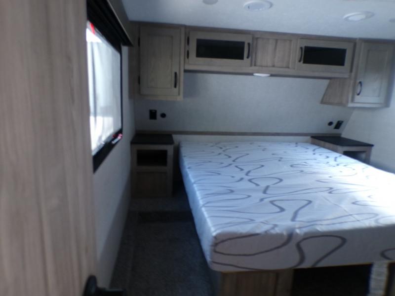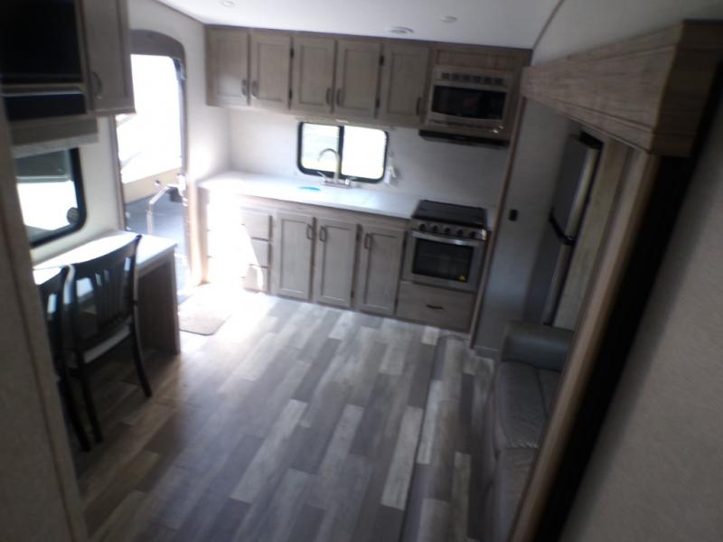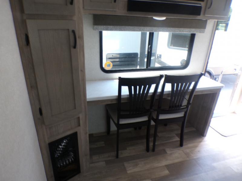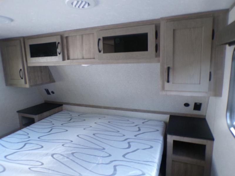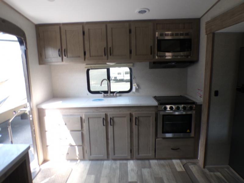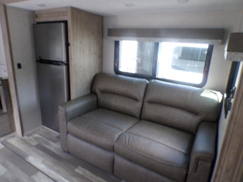 You'll love the space you have in this rear kitchen travel trailer thanks to the slide out in the main living area/kitchen. You can relax on the hide-a-bed sofa or on the two lounge chairs, or head outdoors to sit under the power awning with LED lights. The full bathroom includes a large shower with sliding glass doors for some added luxury, and the front private bedroom is close by for convenience. Here, you'll find a queen bed with dual nightstands for your things and a wardrobe to keep your clothes wrinkle-free. After you've worked up an appetite after hiking, head to the rear kitchen to prepare lunch on the residential cooktop, and leftovers can go in the 10.7 cu. ft. 12V refrigerator!