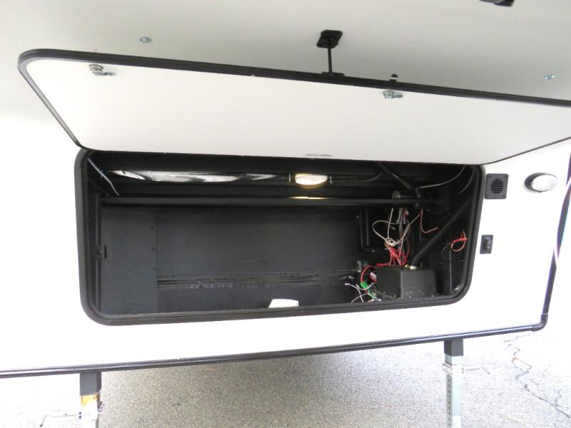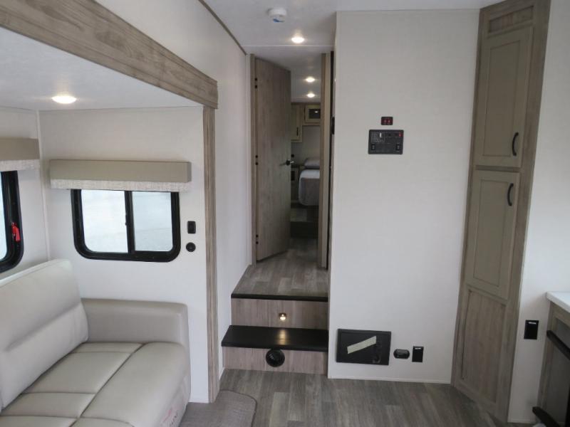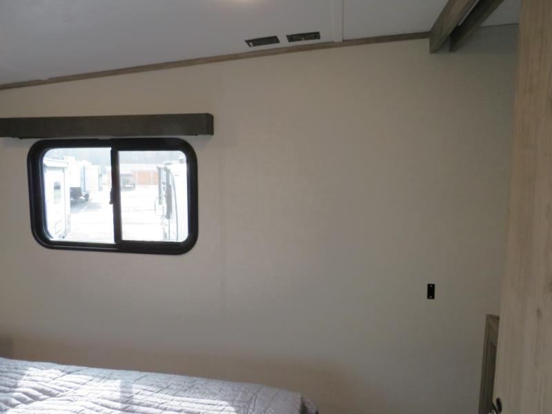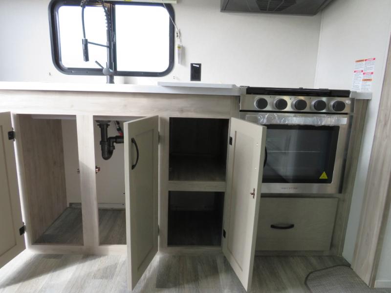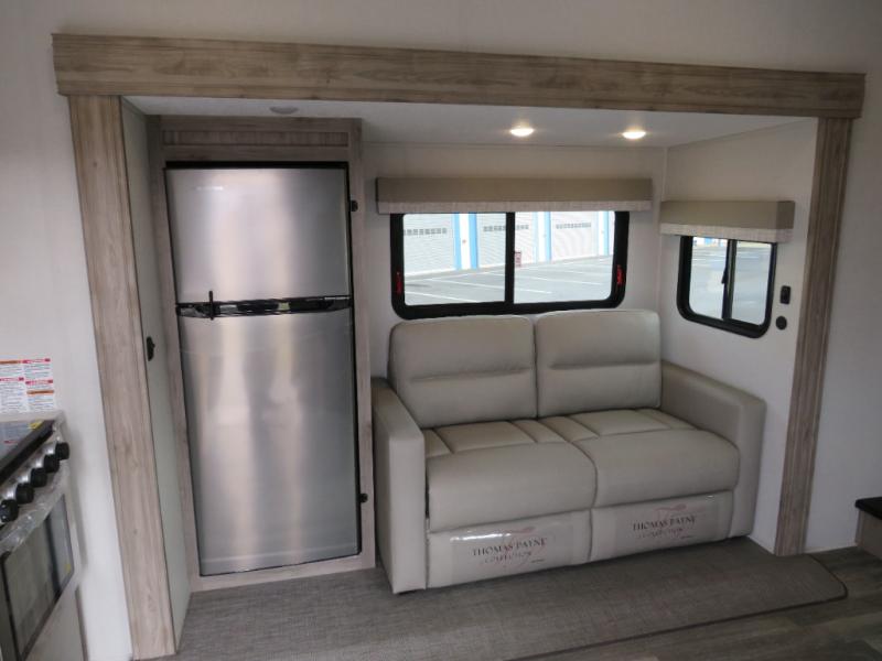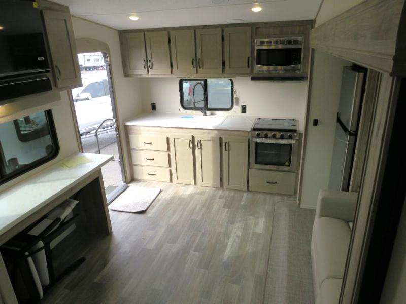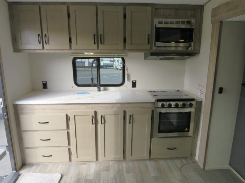 You'll love the space you have in this rear kitchen travel trailer thanks to the slide out in the main living area/kitchen. You can relax on the hide-a-bed sofa or on the two lounge chairs, or head outdoors to sit under the power awning with LED lights. The full bathroom includes a large shower with sliding glass doors for some added luxury, and the front private bedroom is close by for convenience. Here, you'll find a queen bed with dual nightstands for your things and a wardrobe to keep your clothes wrinkle-free. After you've worked up an appetite after hiking, head to the rear kitchen to prepare lunch on the residential cooktop, and leftovers can go in the 10.7 cu. ft. 12V refrigerator!