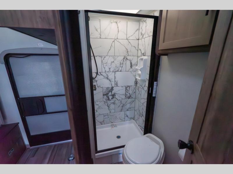 When you enjoy relaxing indoors this coach offers two areas; the rear corner with a double-size Murphy bed, and a J-lounge behind the driver's seat that includes an 18" extension. In the morning, you can prepare eggs and bacon on the two burner induction cooktop, or make instant oatmeal in the microwave oven. The 14' power awning will provide much wanted shade during the day when relaxing outdoors, and the rear corner full bath will allow you to clean up just like you would at home.