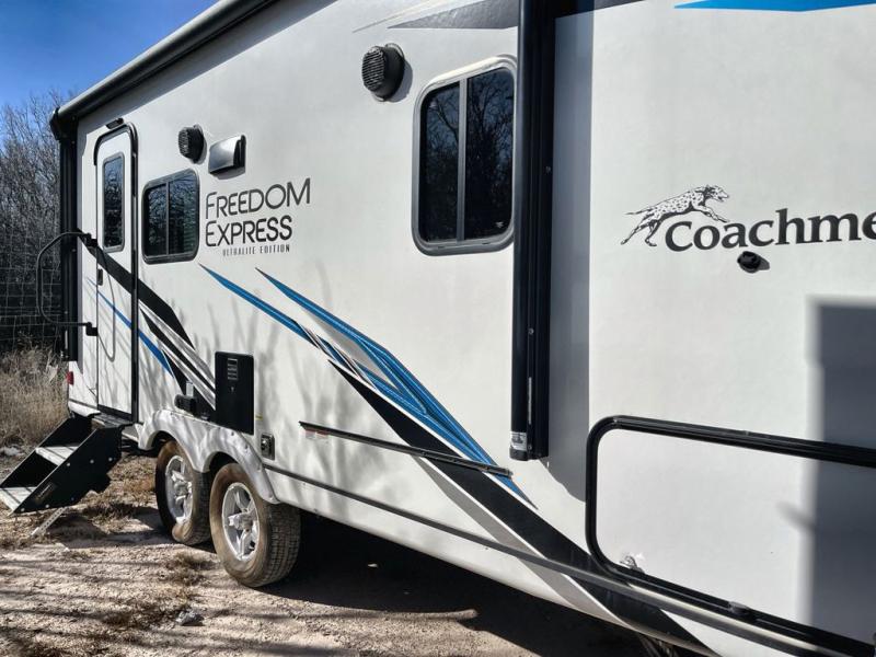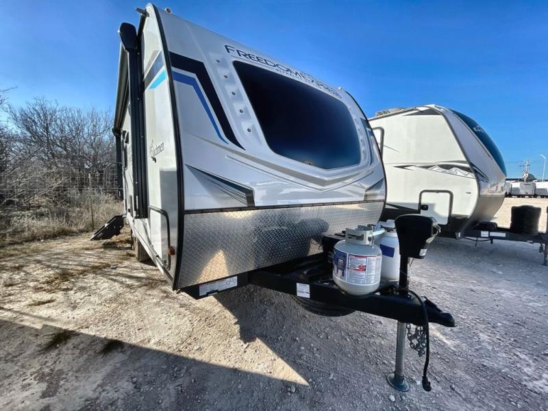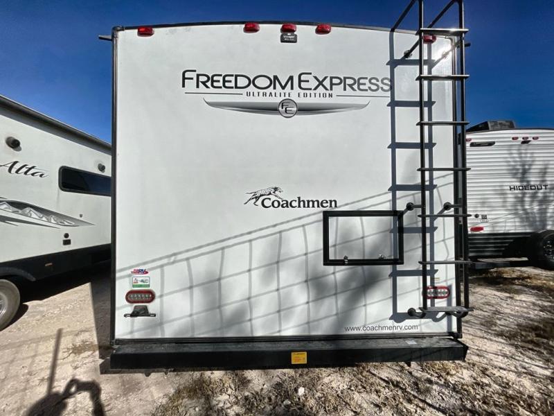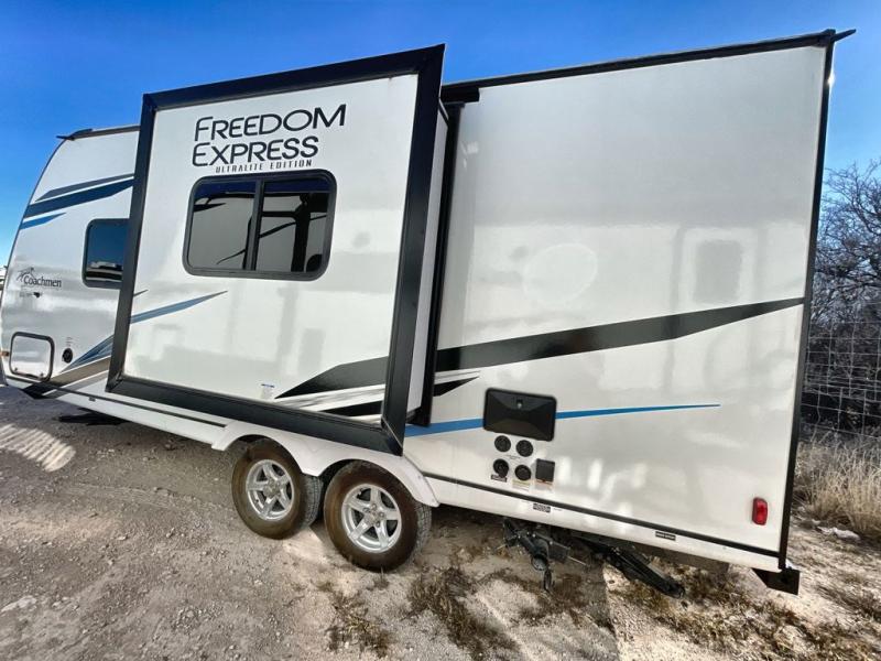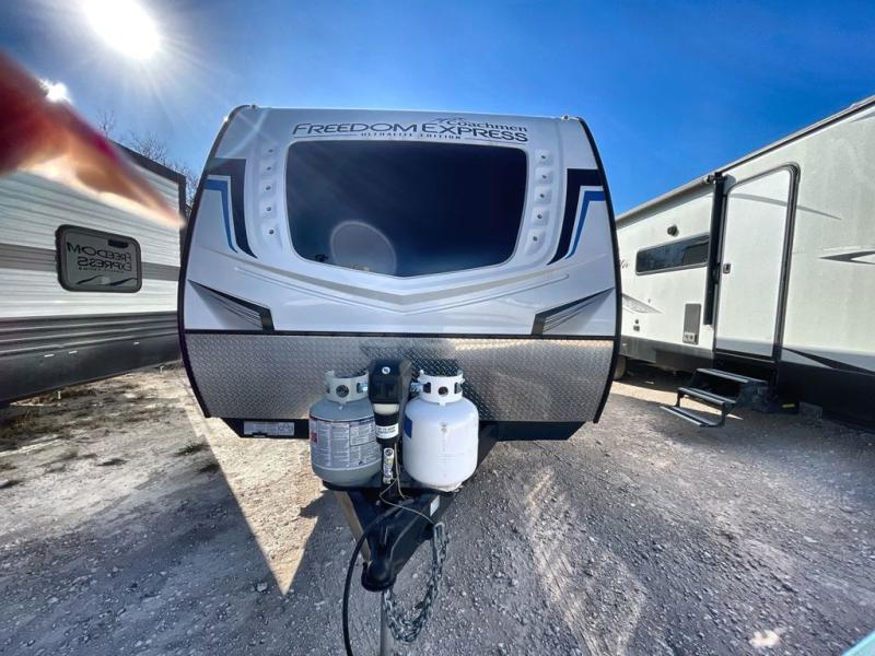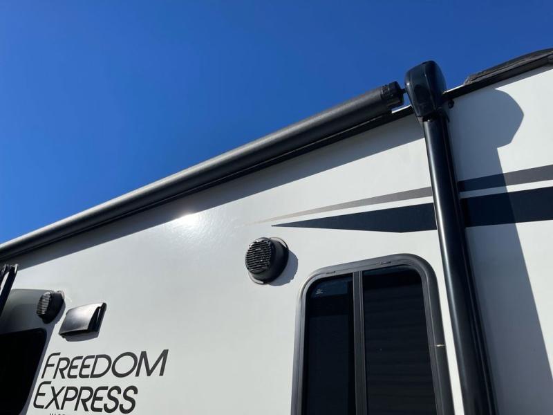 With any Freedom Express Ultra Lite travel trailer by Coachmen you will appreciate quality construction materials, such as vacuum bonded walls with Azdel composite, a 3/4 gel coated fiberglass cap with an automotive glass windshield, and a heated enclosed underbelly. Each model also features Tufflex PVC roofing, front rock guard, and E-Z Lube axles for smooth towing. Inside, you'll find kitchen backsplash, hidden hinge cabinetry, and wear-resistant vinyl flooring throughout. The power tongue jack included with the Ultra Lite Express Package will make set-up a breeze, and each model includes back-up camera prep and they are Freedom solar ready if you plan to go off-grid. Enjoy lightweight camping with a Freedom Express Ultra Lite travel trailer today!