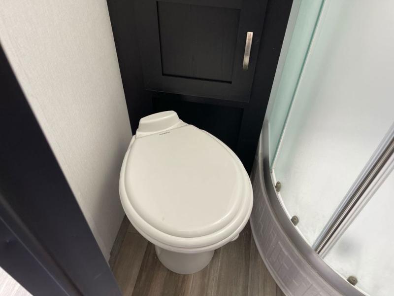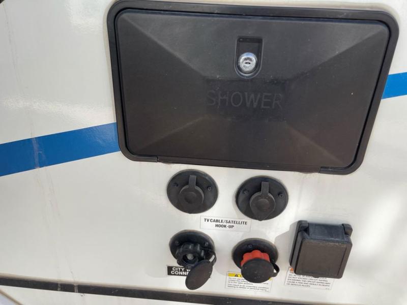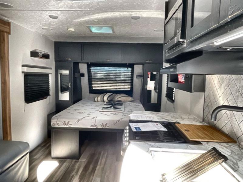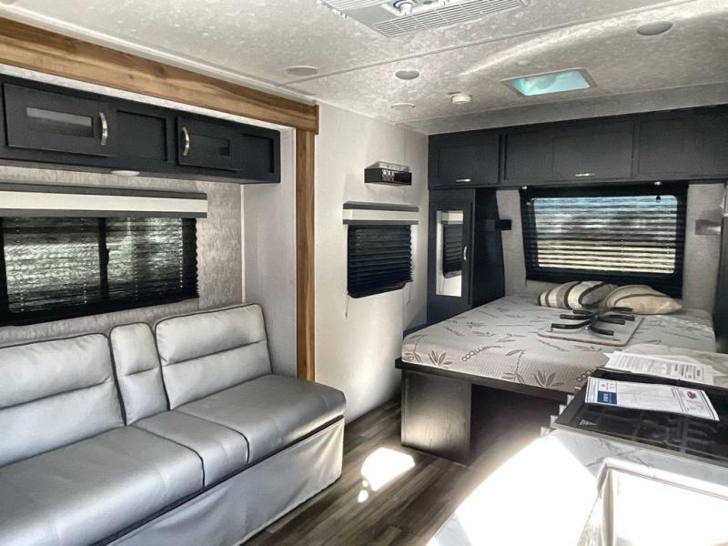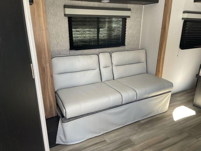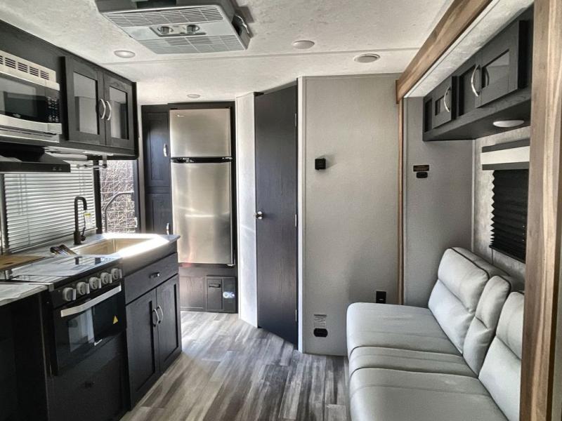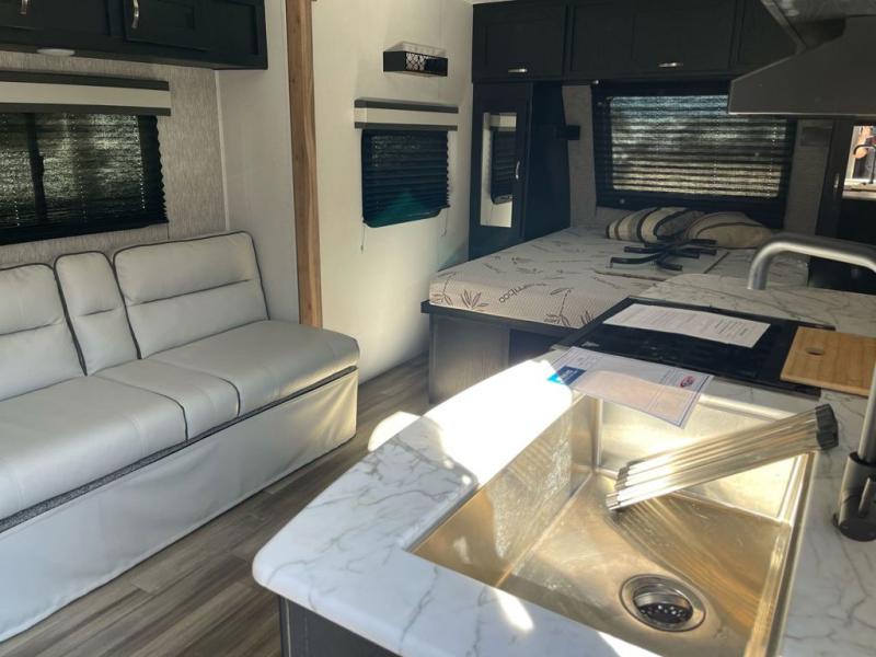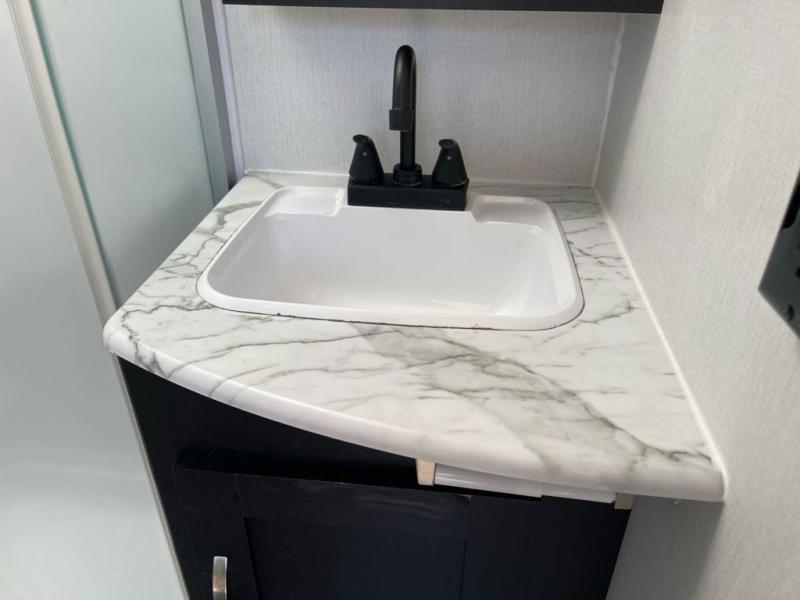 This is the perfect couple's trailer to take to the lake every other weekend. You will enjoy your own queen bed up front that includes vaulted under-bed storage for your luggage. The sofa slide out with a free-standing table provides a place to relax and dine together, and if you have an overnight guest, they can sleep here. The chef can prepare meals on the three burner cooktop or in the microwave oven, and there is a stainless steel sink for easy clean up. This model also includes a full bath with a linen closet for clean towels, and a 32" radius shower with a skylight for more standing space.
