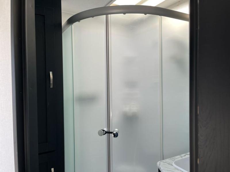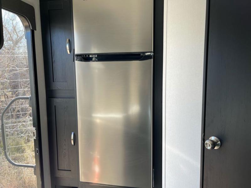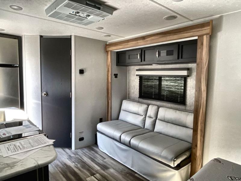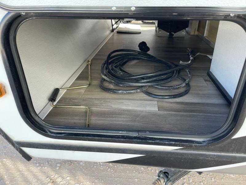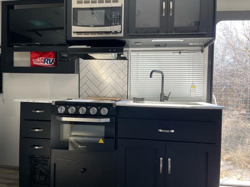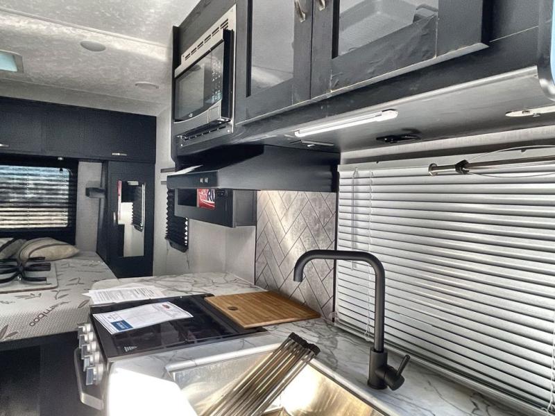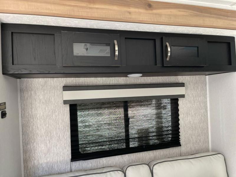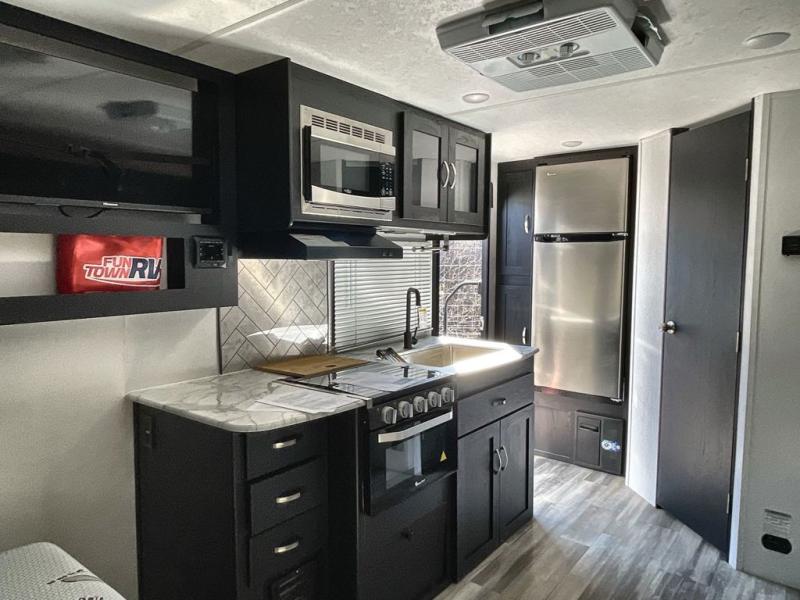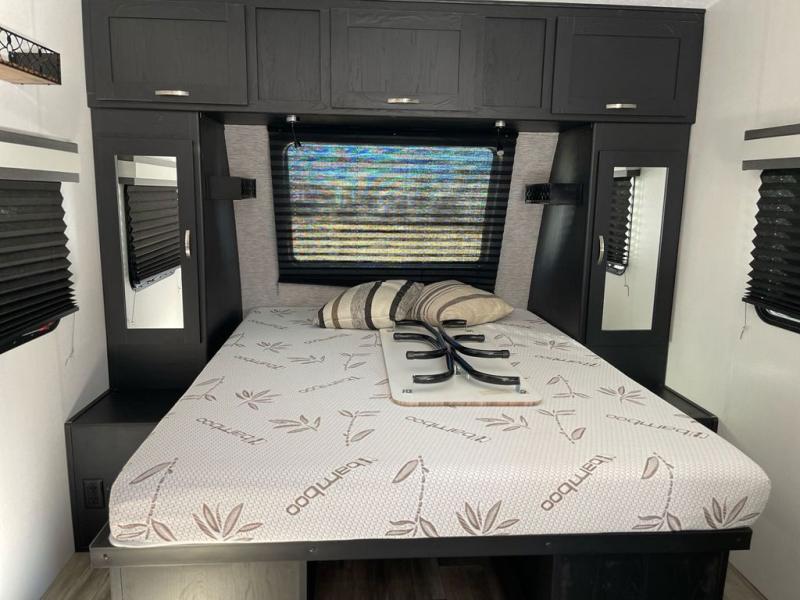 This is the perfect couple's trailer to take to the lake every other weekend. You will enjoy your own queen bed up front that includes vaulted under-bed storage for your luggage. The sofa slide out with a free-standing table provides a place to relax and dine together, and if you have an overnight guest, they can sleep here. The chef can prepare meals on the three burner cooktop or in the microwave oven, and there is a stainless steel sink for easy clean up. This model also includes a full bath with a linen closet for clean towels, and a 32" radius shower with a skylight for more standing space.