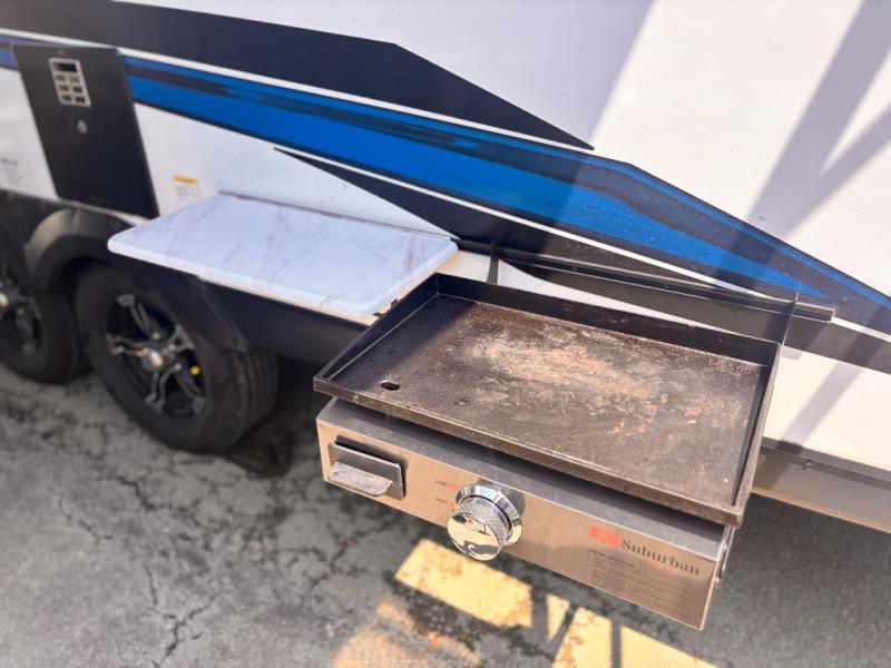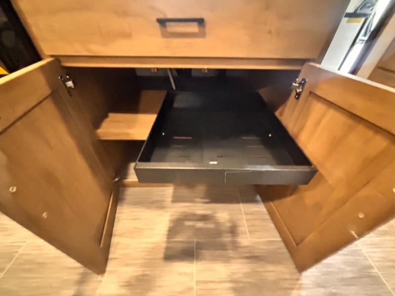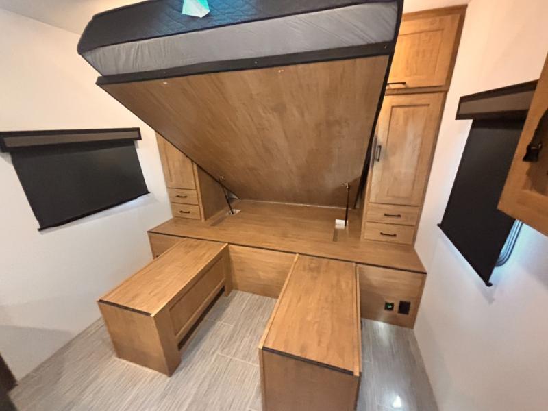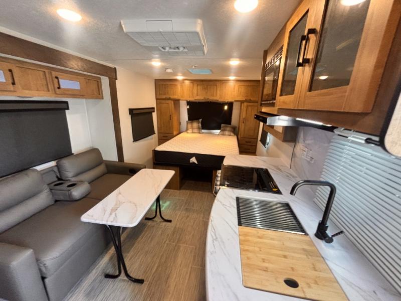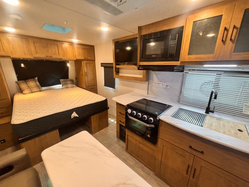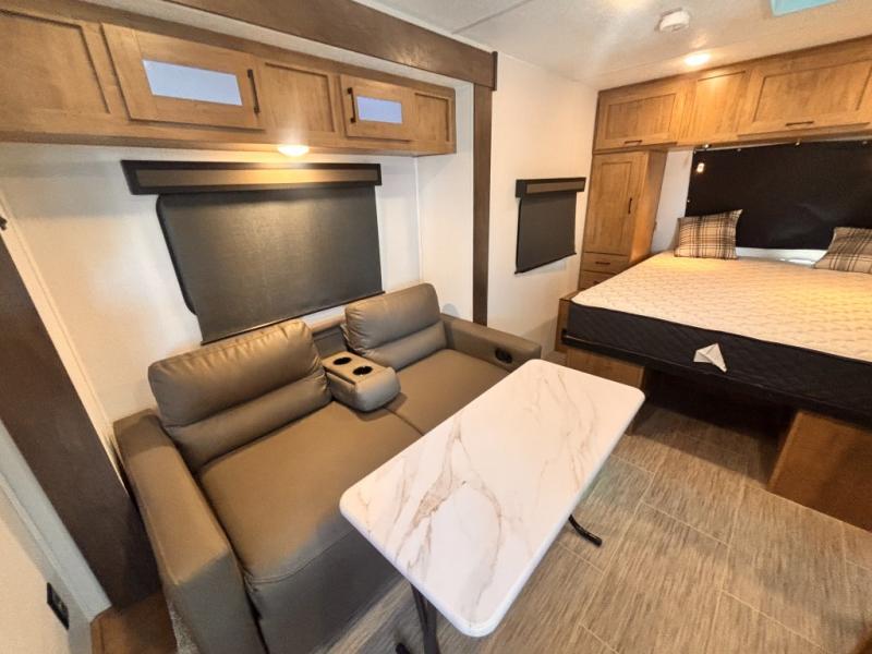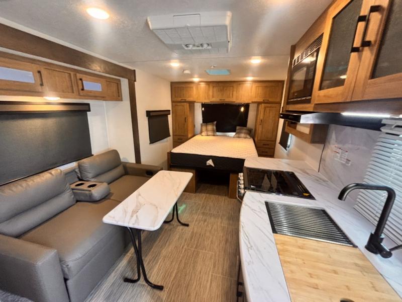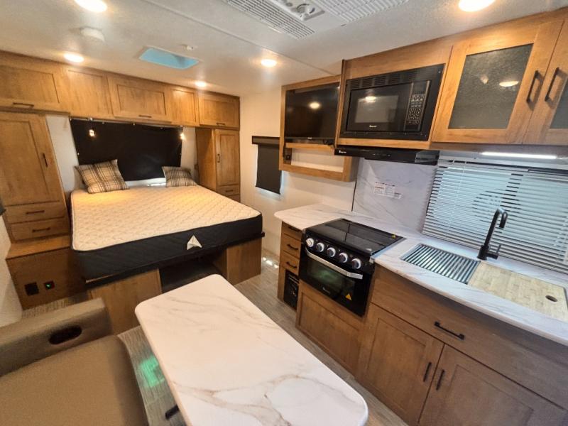 This is the perfect couple's trailer to take to the lake every other weekend. You will enjoy your own queen bed up front that includes vaulted under-bed storage for your luggage. The sofa slide out with a free-standing table provides a place to relax and dine together, and if you have an overnight guest, they can sleep here. The chef can prepare meals on the three burner cooktop or in the microwave oven, and there is a stainless steel sink for easy clean up. This model also includes a full bath with a linen closet for clean towels, and a 32" radius shower with a skylight for more standing space.