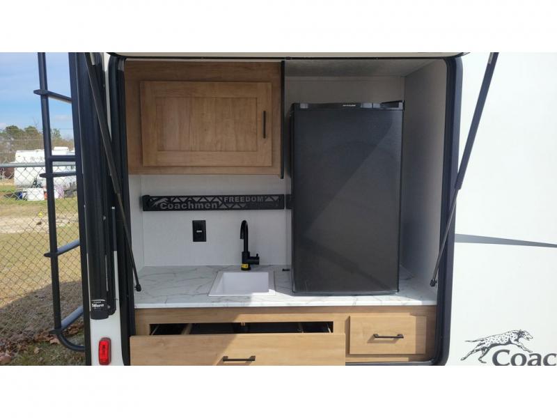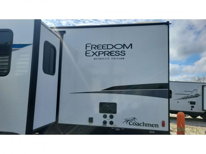 With any Freedom Express Ultra Lite travel trailer by Coachmen you will appreciate quality construction materials, such as vacuum bonded walls with Azdel composite, a 3/4 gel coated fiberglass cap with an automotive glass windshield, and a heated enclosed underbelly. Each model also features Tufflex PVC roofing, front rock guard, and E-Z Lube axles for smooth towing. Inside, you'll find kitchen backsplash, hidden hinge cabinetry, and wear-resistant vinyl flooring throughout. The power tongue jack included with the Ultra Lite Express Package will make set-up a breeze, and each model includes back-up camera prep and they are Freedom solar ready if you plan to go off-grid. Enjoy lightweight camping with a Freedom Express Ultra Lite travel trailer today!