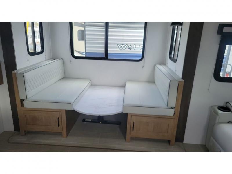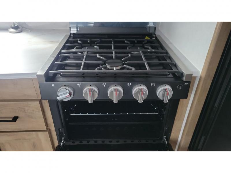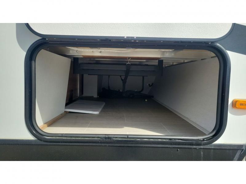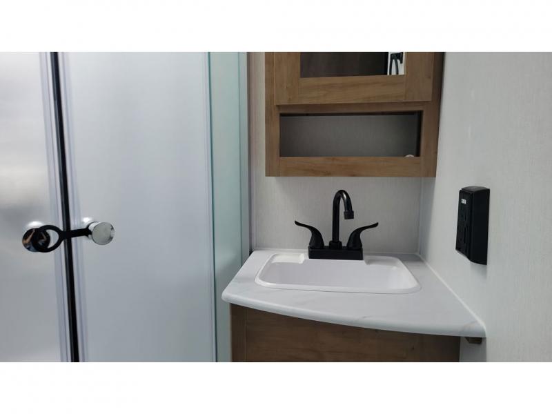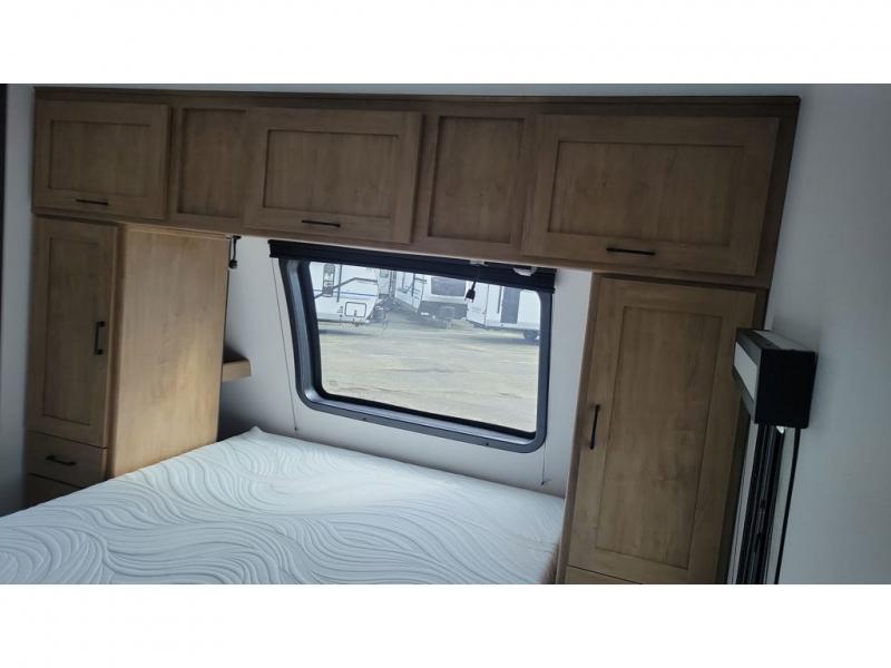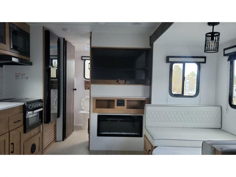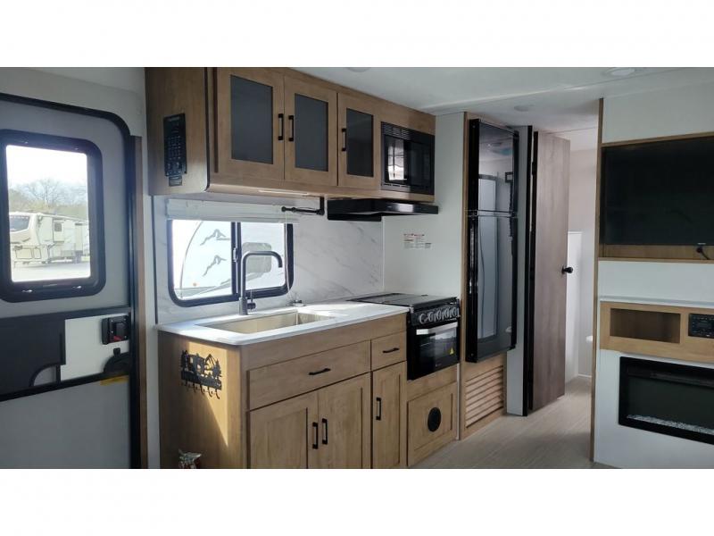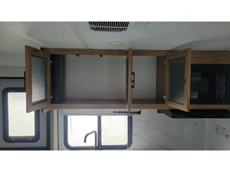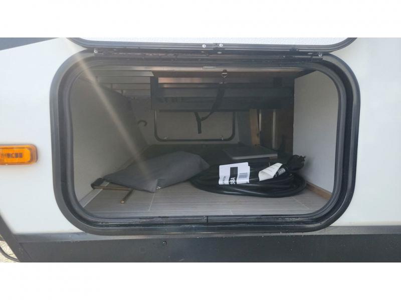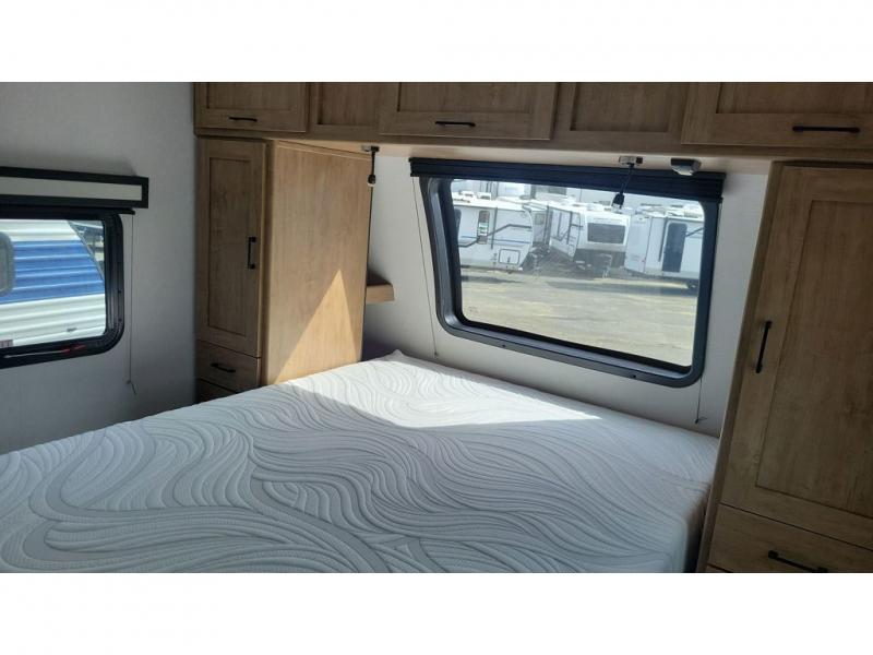 This travel trailer will feel just like home with its private bedroom and spacious full rear bath. You will appreciate the vaulted under-bed storage for extra blankets, shoes, and luggage, plus there are dual wardrobes on either side of the bed for your book and glasses. Get comfortable in the main living area on the sofa or at the booth dinette, or you can choose the optional theater seat or optional hide-a-bed sofa in place of the standard sofa. The chef of your group can prepare meals indoors or outdoors on the full camp kitchen, and check out the large 20' power awning with LED lights that will provide protection from the elements.