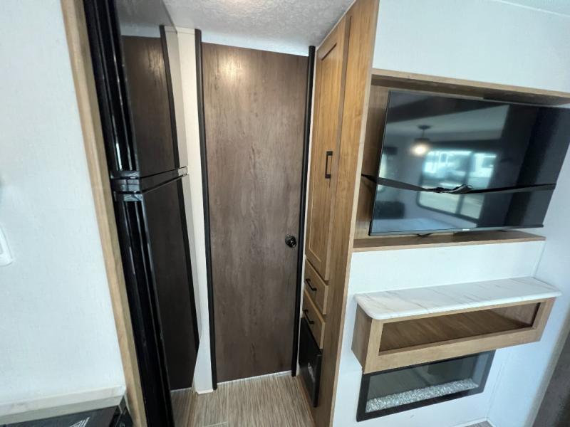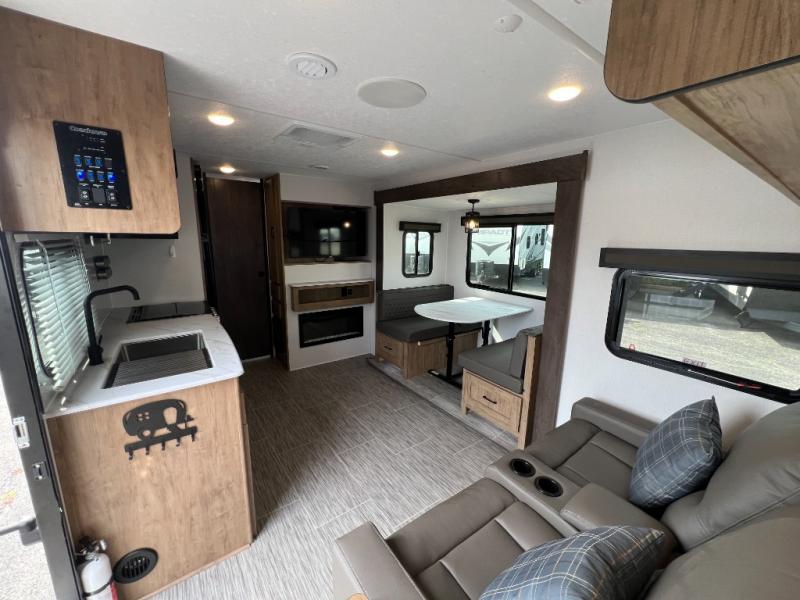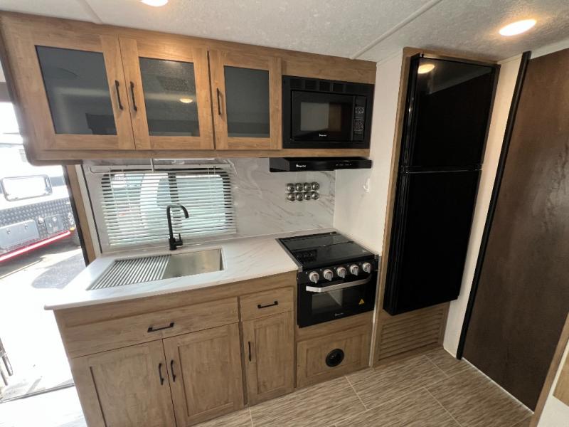 This travel trailer will feel just like home with its private bedroom and spacious full rear bath. You will appreciate the vaulted under-bed storage for extra blankets, shoes, and luggage, plus there are dual wardrobes on either side of the bed for your book and glasses. Get comfortable in the main living area on the sofa or at the booth dinette, or you can choose the optional theater seat or optional hide-a-bed sofa in place of the standard sofa. The chef of your group can prepare meals indoors or outdoors on the full camp kitchen, and check out the large 20' power awning with LED lights that will provide protection from the elements.