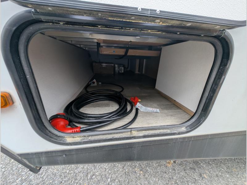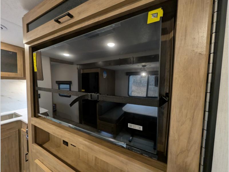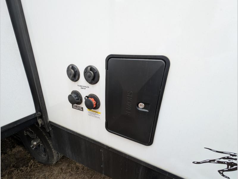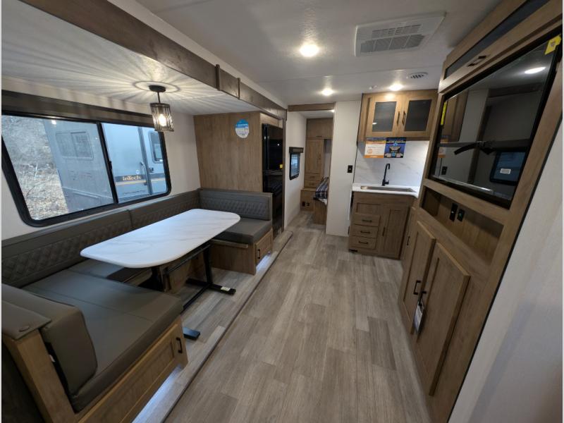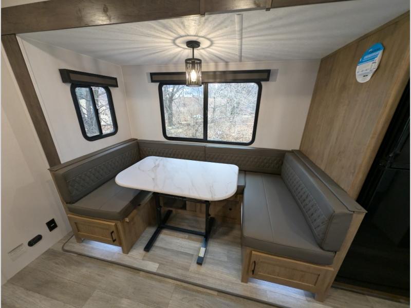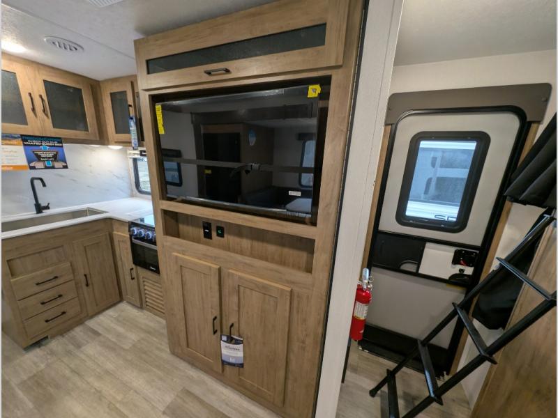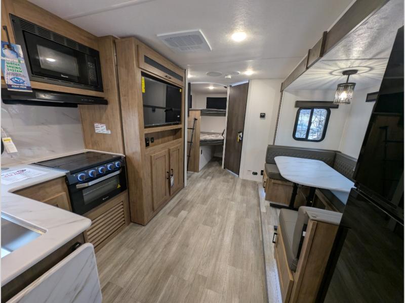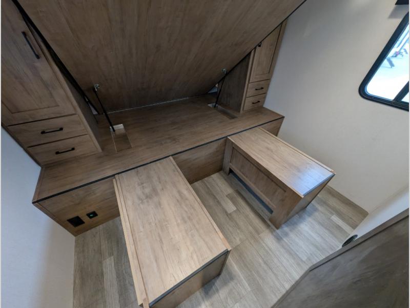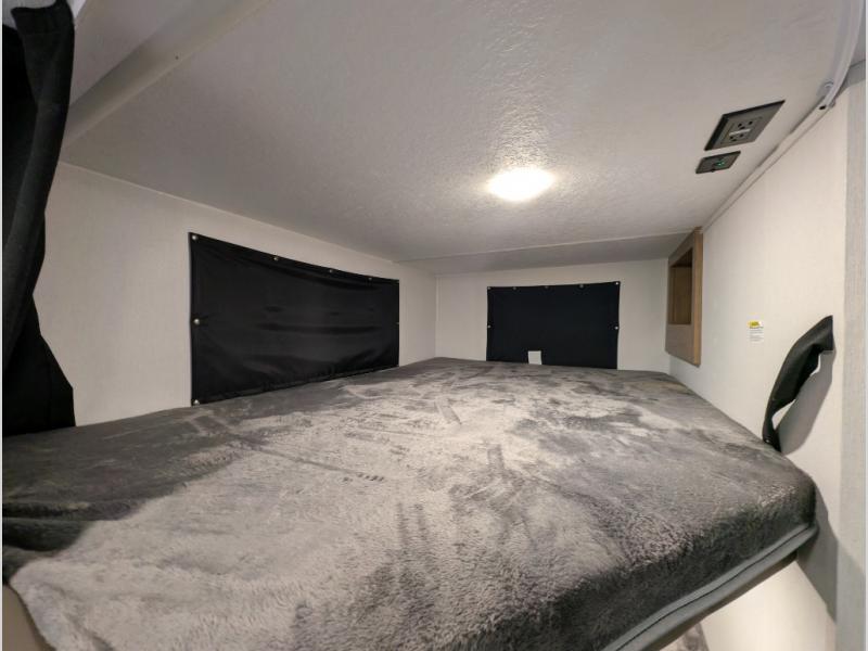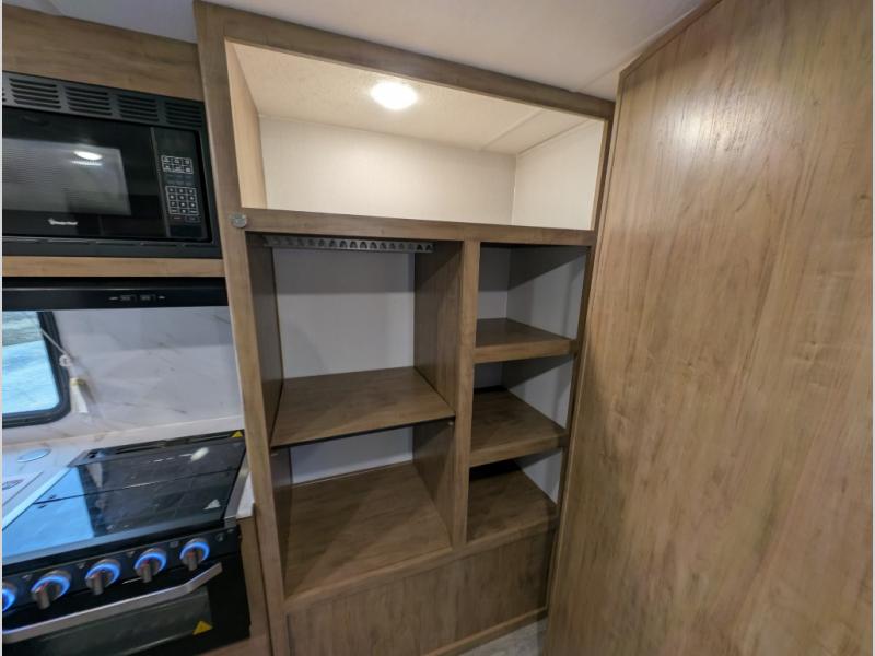 This is a great unit for a larger family to enjoy! With double-size bunks in the rear campside corner you can easily sleep seven or eight in this unit depending on size. A large slide offers ample space in the main living area and it features a u-dinette and refrigerator. Opposite the slide behind the Smart TV there is a huge hinged hidden storage pantry! You can easily cook both inside and out with all the appliances inside to create delicious home cooked meals, plus an outside camp kitchen and griddle so you can cook in the great outdoors on a beautiful day. A rear corner bath features a shower, toilet, and corner vanity with sink, plus medicine cabinet for your things. In front, a private master bedroom with queen bed including wardrobes and inset shelves along the side of the head of the bed, plus overhead storage as well.