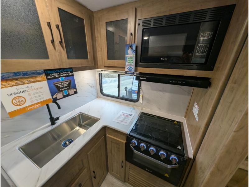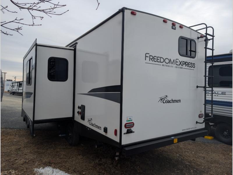 With any Freedom Express Ultra Lite travel trailer by Coachmen you will appreciate quality construction materials, such as vacuum bonded walls with Azdel composite, a 3/4 gel coated fiberglass cap with an automotive glass windshield, and a heated enclosed underbelly. Each model also features Tufflex PVC roofing, front rock guard, and E-Z Lube axles for smooth towing. Inside, you'll find kitchen backsplash, hidden hinge cabinetry, and wear-resistant vinyl flooring throughout. The power tongue jack included with the Ultra Lite Express Package will make set-up a breeze, and each model includes back-up camera prep and they are Freedom solar ready if you plan to go off-grid. Enjoy lightweight camping with a Freedom Express Ultra Lite travel trailer today!