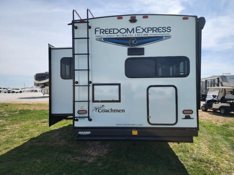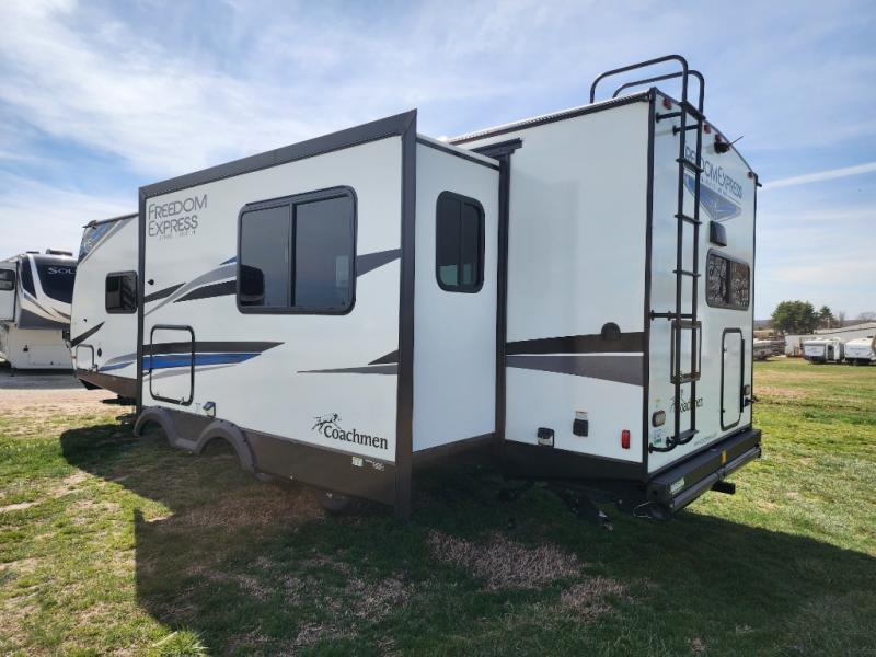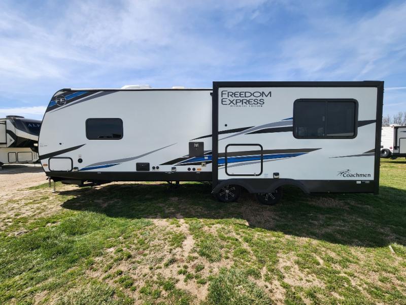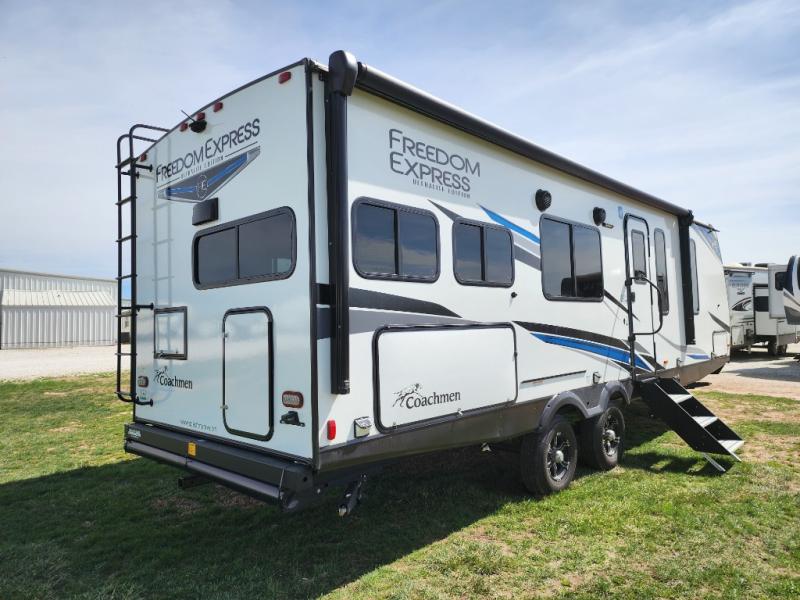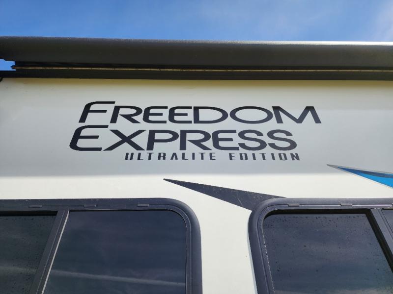 With any Freedom Express Ultra Lite travel trailer by Coachmen you will appreciate quality construction materials, such as vacuum bonded walls with Azdel composite, a 3/4 gel coated fiberglass cap with an automotive glass windshield, and a heated enclosed underbelly. Each model also features Tufflex PVC roofing, front rock guard, and E-Z Lube axles for smooth towing. Inside, you'll find kitchen backsplash, hidden hinge cabinetry, and wear-resistant vinyl flooring throughout. The power tongue jack included with the Ultra Lite Express Package will make set-up a breeze, and each model includes back-up camera prep and they are Freedom solar ready if you plan to go off-grid. Enjoy lightweight camping with a Freedom Express Ultra Lite travel trailer today!