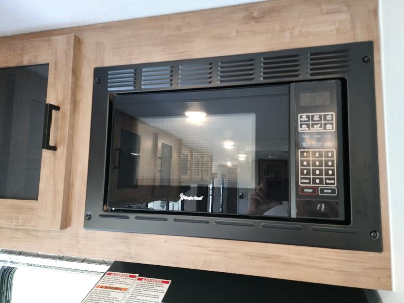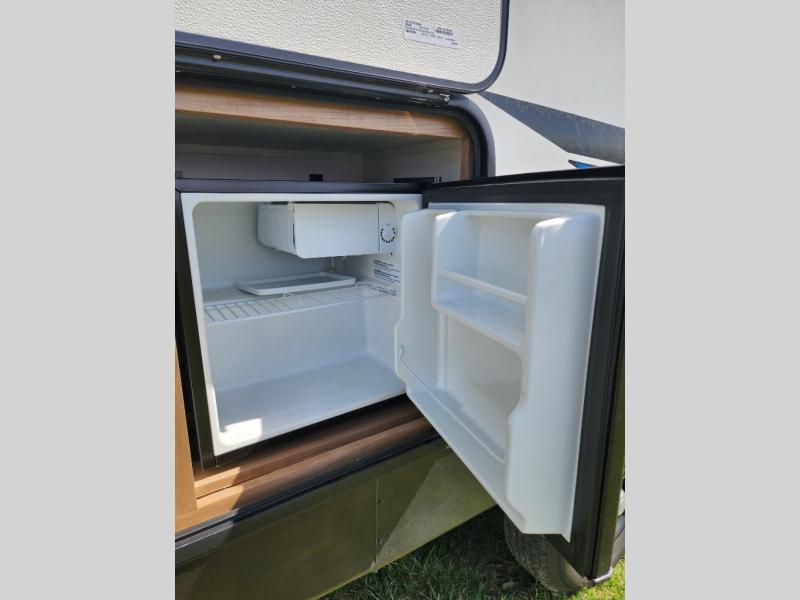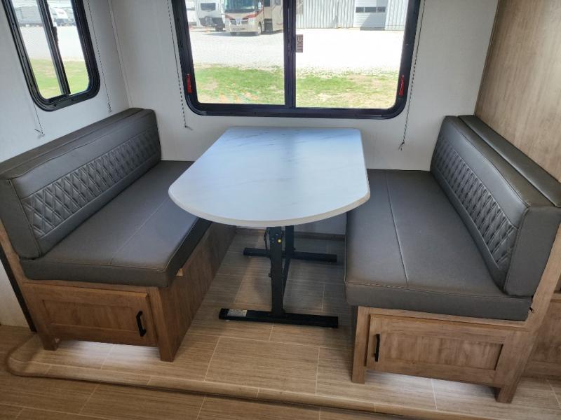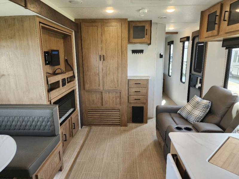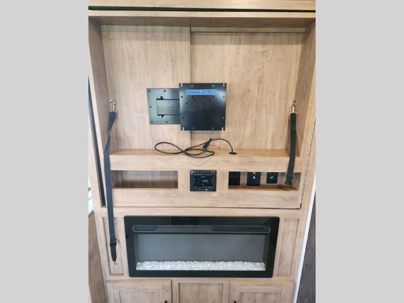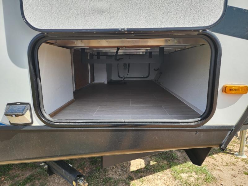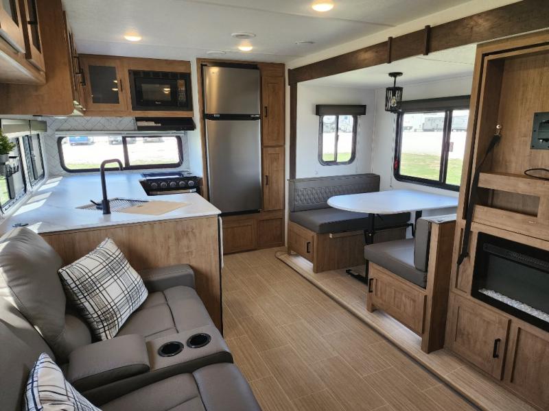 Are you looking for a travel trailer that will feel more like home? Look no further than this model that features a private bedroom up front, a full bath, plus a spacious rear kitchen. You will love to relax on the theatre sofa/hide-a-bed sofa across from the Smart TV and fireplace, and there is a booth dinette for dining. This model also includes a hidden pantry behind the TV for smart storage solutions. If the weather is nice you may just want to sit outdoors under the 18' power awning with LED lights. The chef of your group can prepare a meal on the pull-out camp kitchen, and the kids can grab their scooters from the pass-through storage.