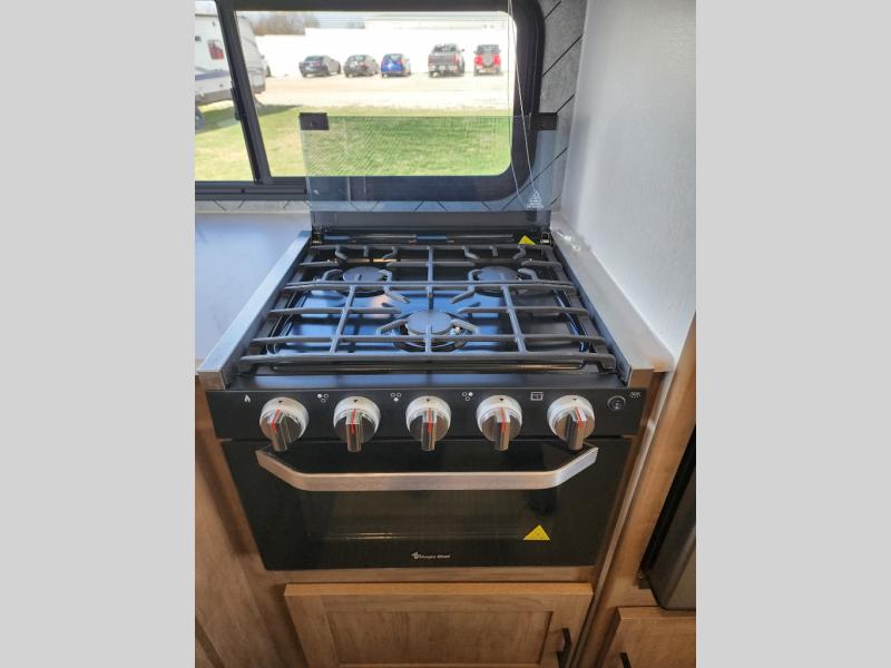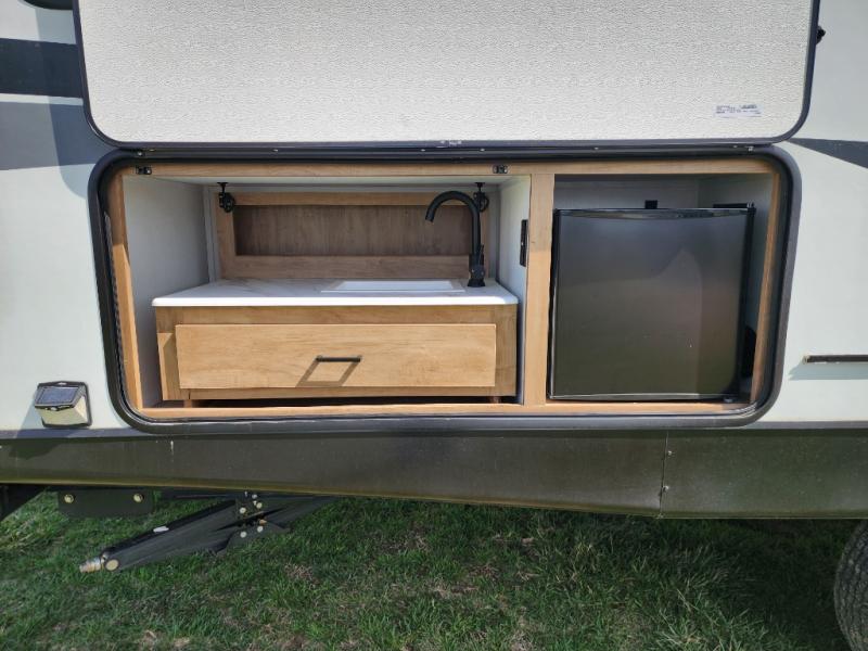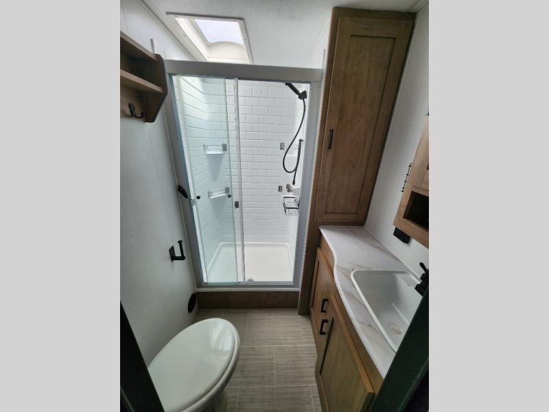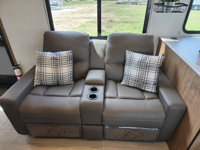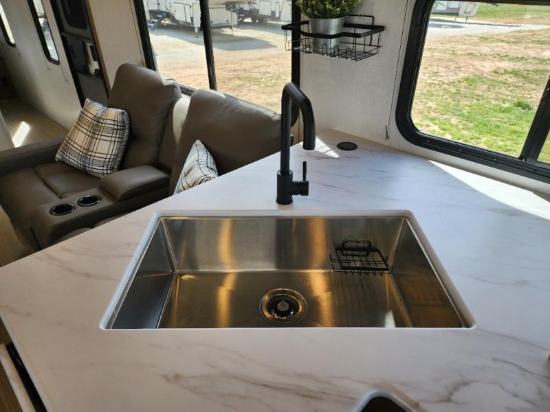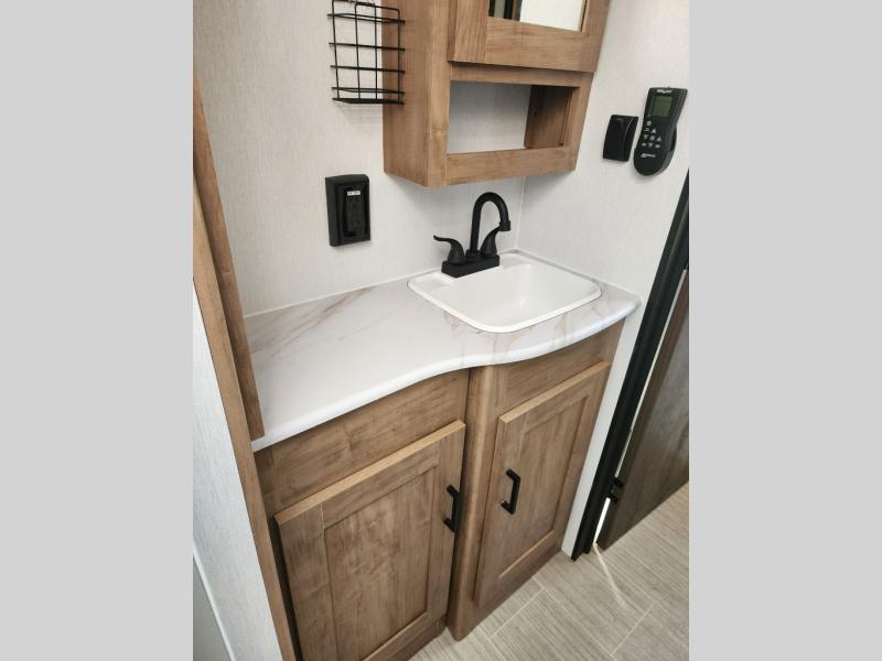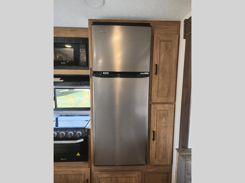 Are you looking for a travel trailer that will feel more like home? Look no further than this model that features a private bedroom up front, a full bath, plus a spacious rear kitchen. You will love to relax on the theatre sofa/hide-a-bed sofa across from the Smart TV and fireplace, and there is a booth dinette for dining. This model also includes a hidden pantry behind the TV for smart storage solutions. If the weather is nice you may just want to sit outdoors under the 18' power awning with LED lights. The chef of your group can prepare a meal on the pull-out camp kitchen, and the kids can grab their scooters from the pass-through storage.