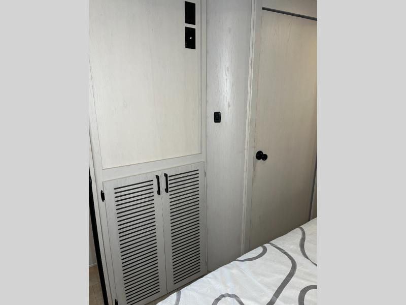 Enjoy many fun trips in this spacious motorhome! Step up to the rear private bedroom with a 72” x 80 king bed, and stow all your clothes in the wardrobe. Adjacent to the bedroom is a rear corner bath with a linen closet which even has room for an optional washer and dryer. The center kitchen has an angled countertop with an extension to allow for maximum cooking space, and a 12V refrigerator stows all your snacks. You’ll enjoy those meals on the J-Lounge or relax on the facing sofa. Overhead you’ll find plentiful cabinets for storage plus a TV. Outside under the power awning is an exterior entertainment center. This model also includes the CRV Supersprings Ride with heavy duty stabilizer bars, chassis electronic stability control, SumoSprings front shock absorbers, and more!
