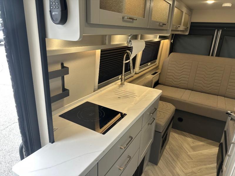 Grab your honey and head to your favorite camping spot in this cozy camper van. Once you park for the day, you can swivel the captain's seats around and enjoy coffee at the removable cockpit table. Lunch can be made on the induction cooktop, and the cold ingredients can go back in the 7.3 cu. ft. refrigerator. The convenient wet bath allows you to freshen up after a hike, and the rear lay-flat power sofa will provide comfortable sleeping space when you're ready to turn in for the night. There are also two jump seats and a lagun table if you want to say up and play a game of cards!
