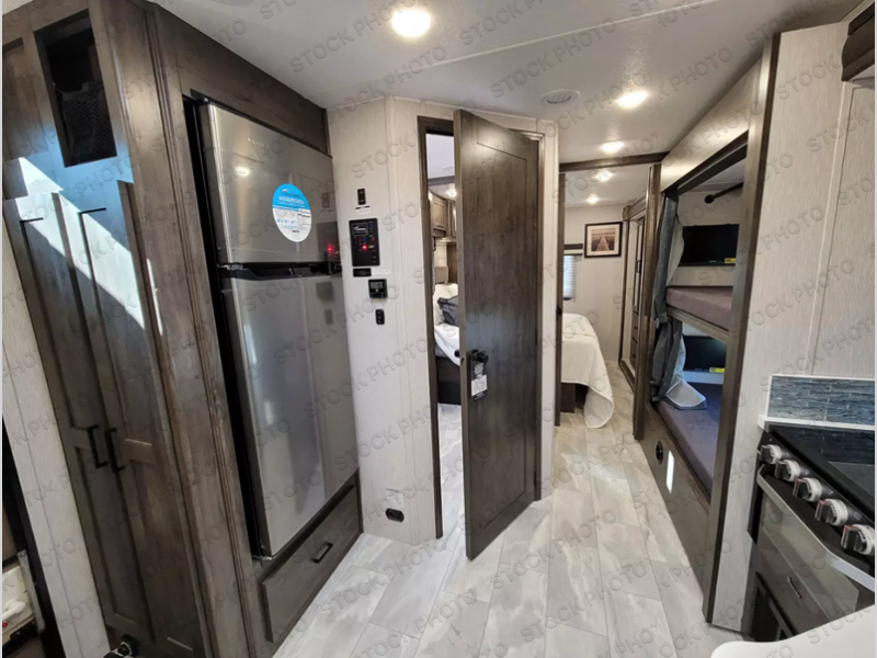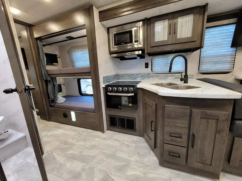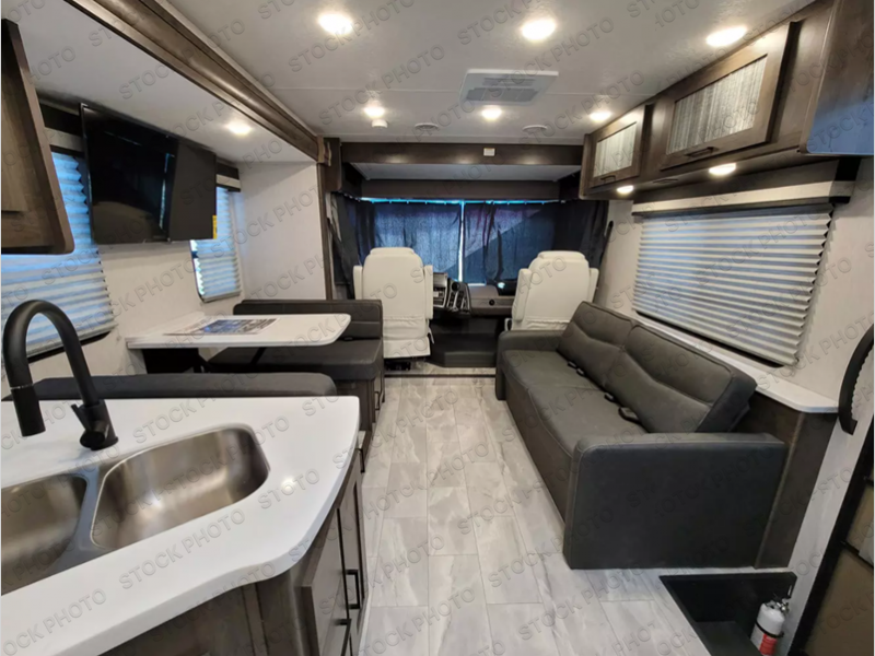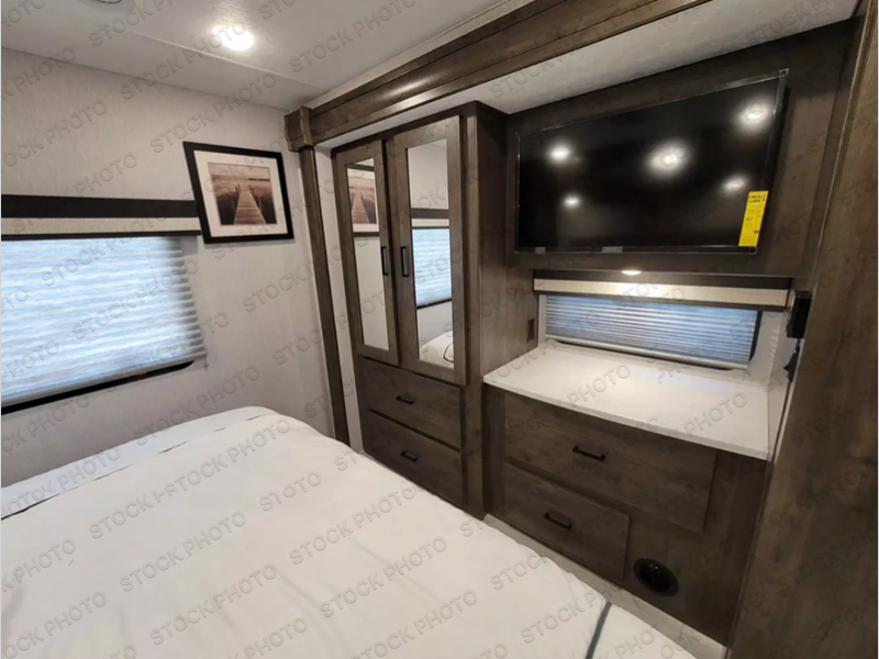 The whole family can join in on the fun with this motorhome! The kiddos can sleep on the set of bunk beds and the drop down bunk over the cab, or you can convert the bunks into a wardrobe if you're not needing the extra sleeping space. You will appreciate having your own privacy with a rear private bedroom including a 70" x 74" king bed that has a CPAP station above it and across from it there is a wardrobe, an LED TV, and storage. You even have an entrance into the dual entry bathroom which has a 32" x 32" radius shower with a skylight for added head room and natural lighting. Keep everyone's bellies full with the stainless steel three burner cooktop and store any leftovers in the 12V stainless steel double door 10 cu. ft. refrigerator. If you need more sleeping space then you can transform the 42" x 68" booth dinette and 68" sofa with storage into extra sleeping spaces. There is even an exterior LED TV to watch the big game outdoors!
