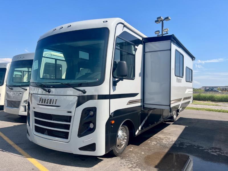 Pursue big dreams with one of these Coachmen RV Pursuit Class A gas motorhomes! The high gloss dove grey sidewalls with Azdel superlight composite, fiberglass front cap, and crowned, laminated TPO roof will hold up for years to come. A Ford F53 7.3L V8 engine propels your unit with an abundance of power to each destination. Stay warm in the cooler months with a 30,000 BTU furnace and stay cool in the warmer months with a single 15,000 BTU A/C or dual15,000 BTU A/C units, depending on the model you choose. All of your extra gear can easily be stored in the spacious exterior storage compartments to keep from taking up space on the inside. The exterior propane hook-up will come in handy and some models even have an outside entertainment center with a TV. Come find the right one for you today!