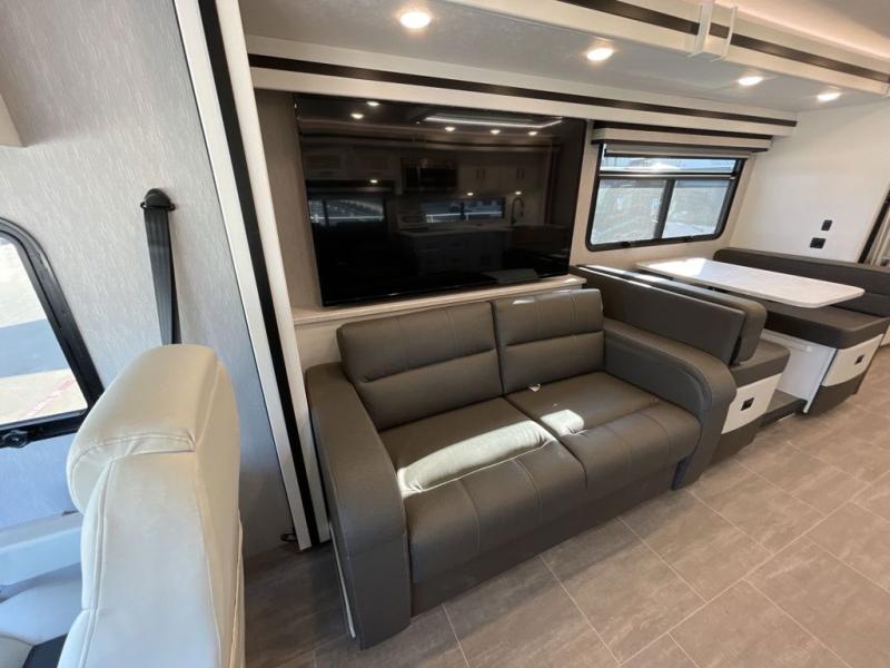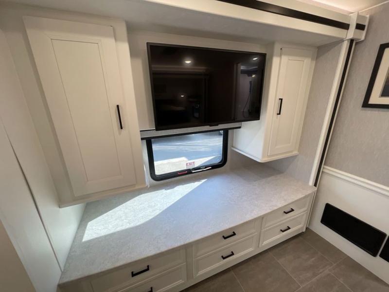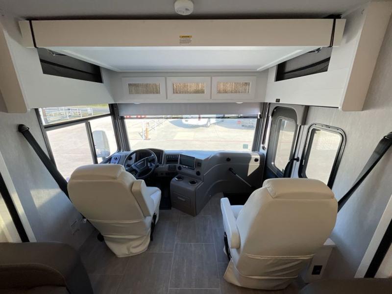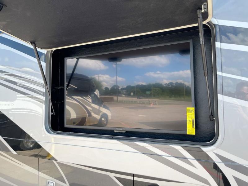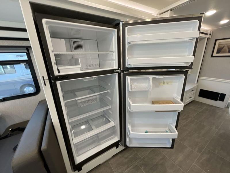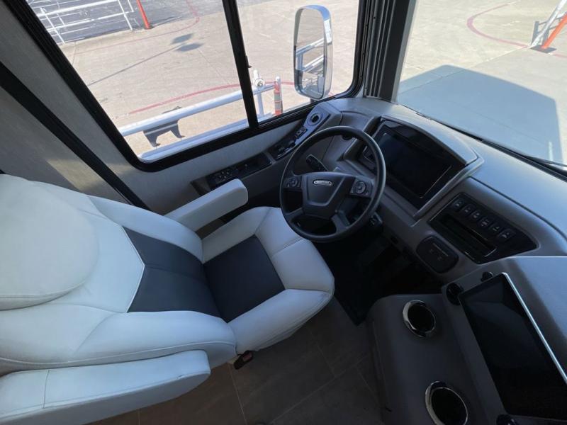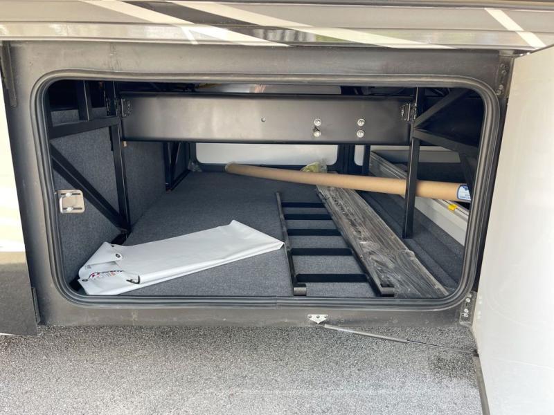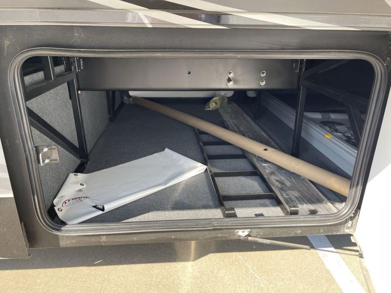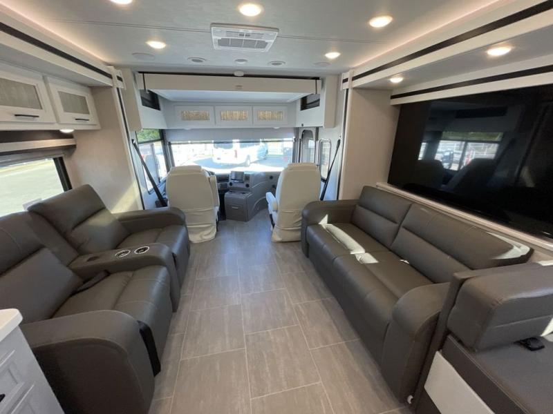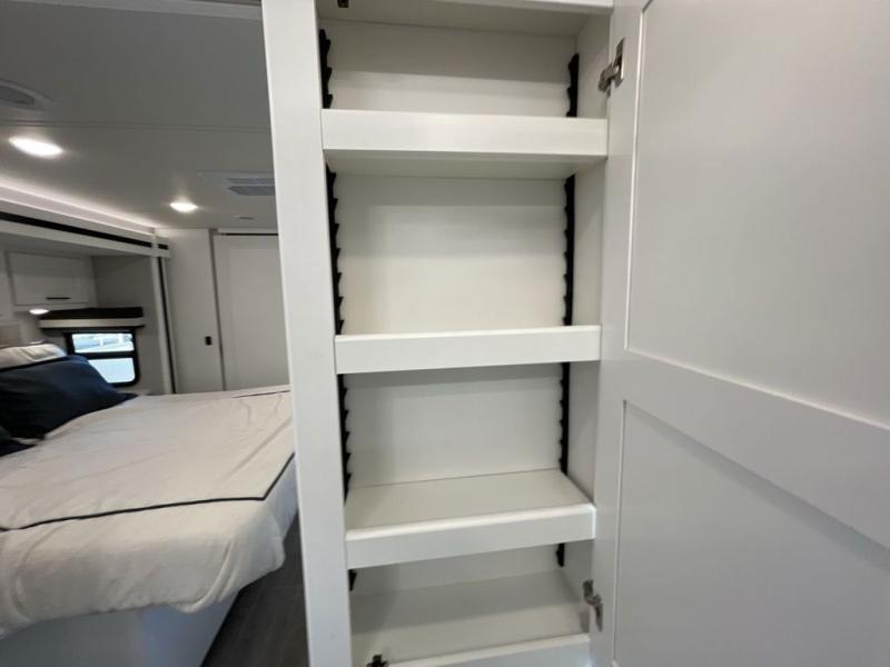 You won't believe all that this motorhome has to offer! Starting with the full rear bathroom which has a 38" x 26" shower to clean up in, a linen closet, and a pantry with washer/dryer option, plus it leads directly into the master suite. Here you will find a king bed slide with a CPAP station above it and across from a dresser with wardrobes on either side and a 32" LED TV to watch your movies in true relaxation. The convenient half bathroom is centrally located so guests can easily use it when needed. At night, you can either relax on the 68" sofa or the theater seating across from the LED TV, and if you need more sleeping space, the drop-down overhead bunk is sure to be a big hit
