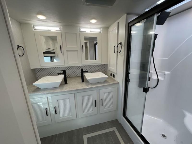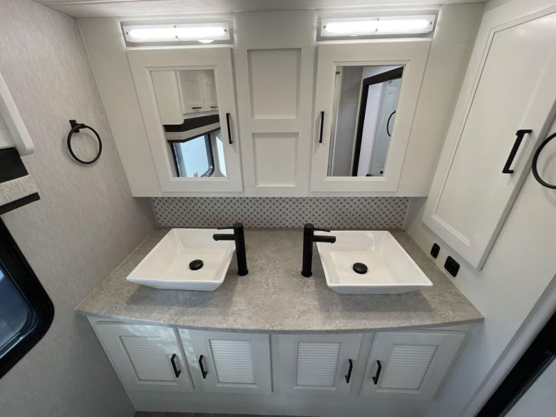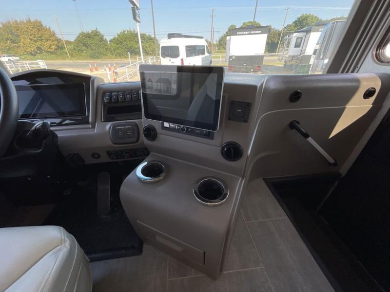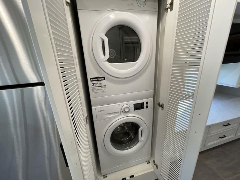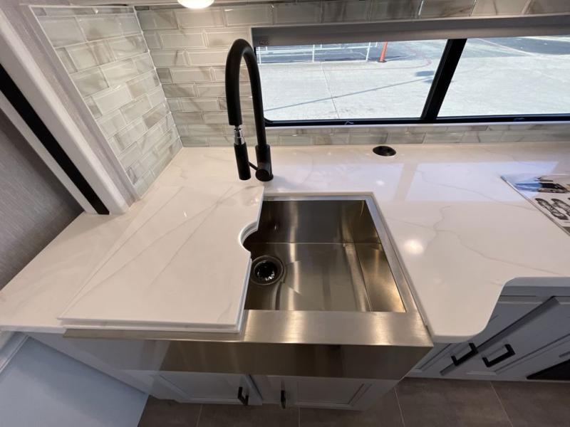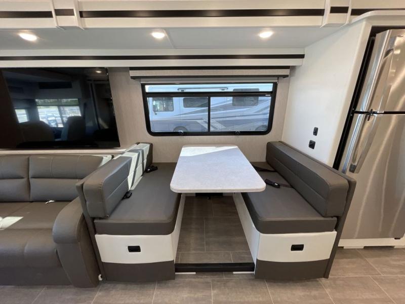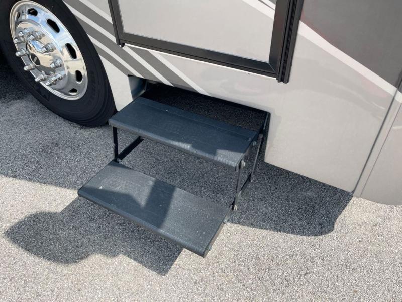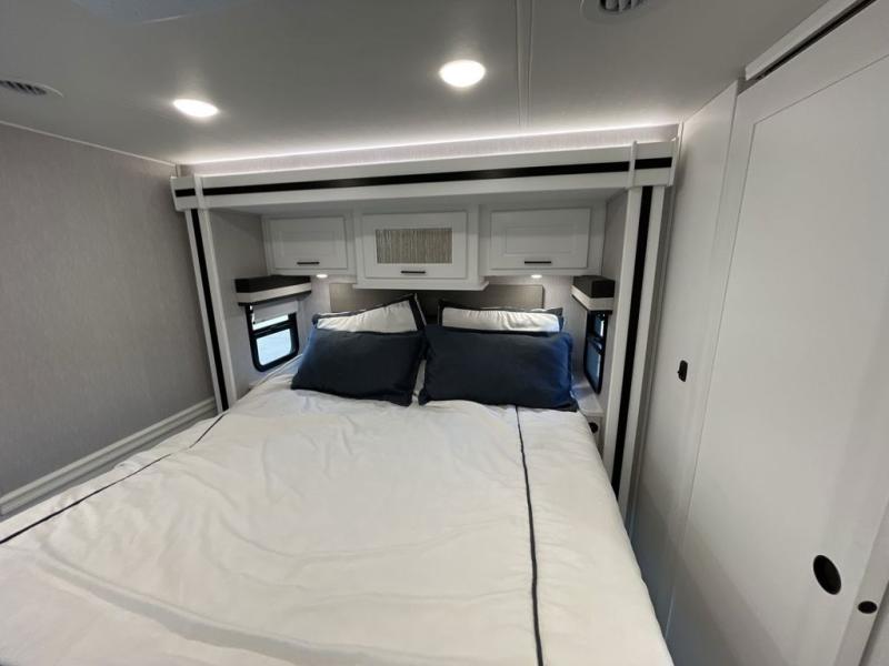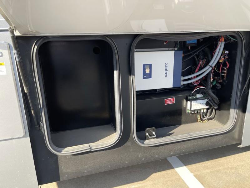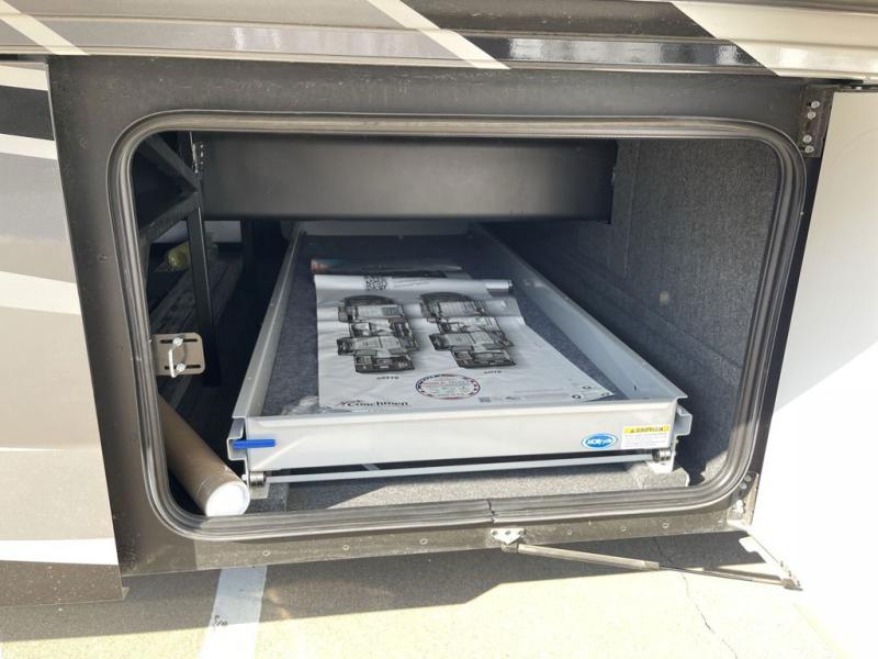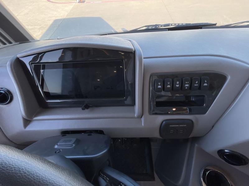 You won't believe all that this motorhome has to offer! Starting with the full rear bathroom which has a 38" x 26" shower to clean up in, a linen closet, and a pantry with washer/dryer option, plus it leads directly into the master suite. Here you will find a king bed slide with a CPAP station above it and across from a dresser with wardrobes on either side and a 32" LED TV to watch your movies in true relaxation. The convenient half bathroom is centrally located so guests can easily use it when needed. At night, you can either relax on the 68" sofa or the theater seating across from the LED TV, and if you need more sleeping space, the drop-down overhead bunk is sure to be a big hit