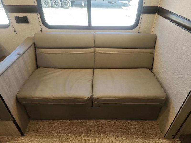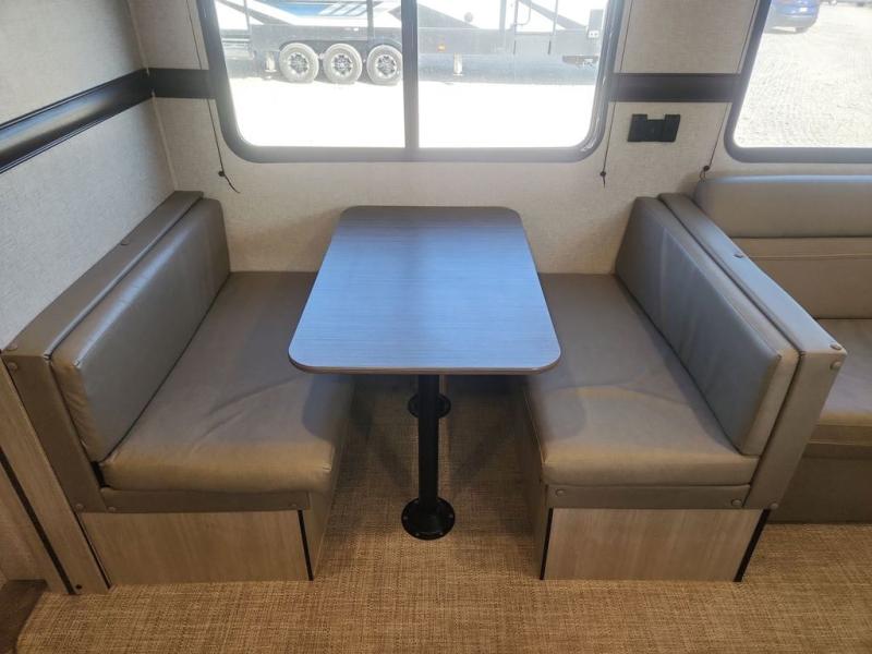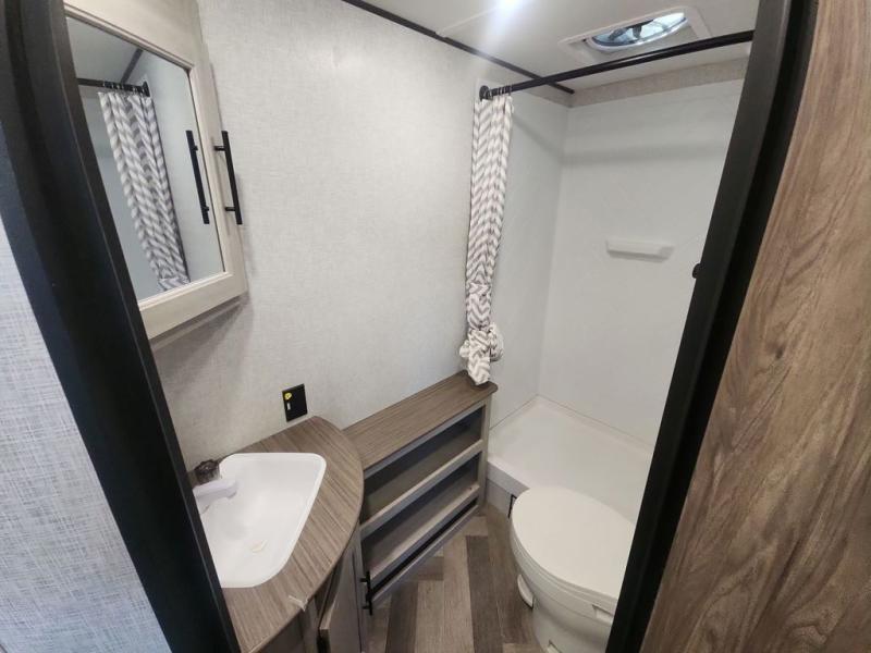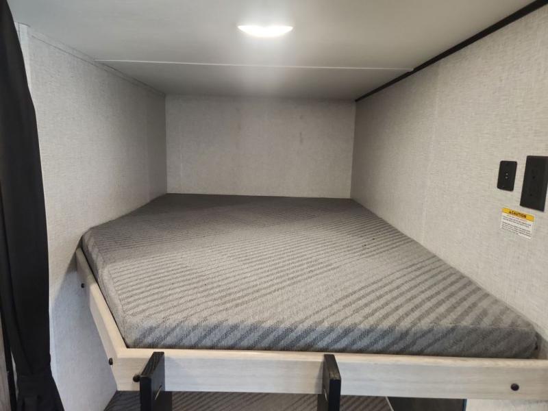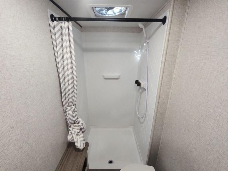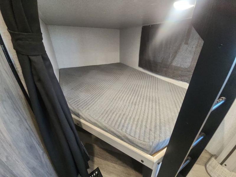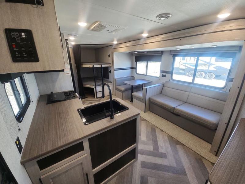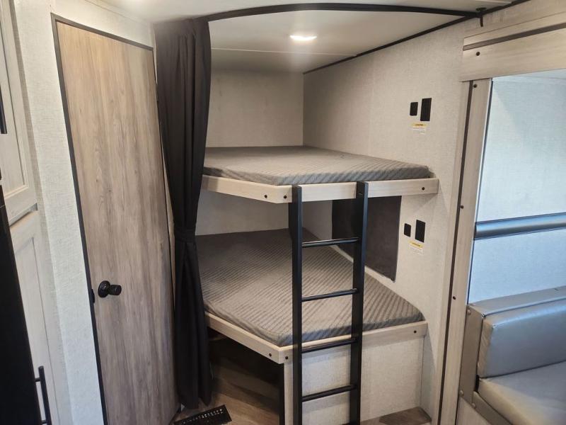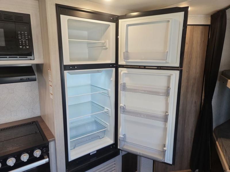 If you've been searching for a travel trailer that can sleep more campers and give you more interior space, this is the one! There are double-size bunks with a ladder for the little ones, an RV queen bed in the front bedroom, plus a jackknife sofa and booth dinette that will double as seating and sleeping space. You will be able to make home cooked meals for your crew since there is a three burner range with a glass top and LED lit knobs, and the 10 cu. ft. 12V refrigerator can keep your food fresh. This model also includes a full bath with a 30" x 36 shower, a foot flush toilet, and a medicine cabinet to keep items organized.
