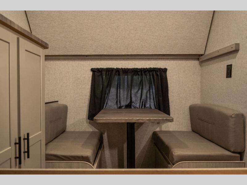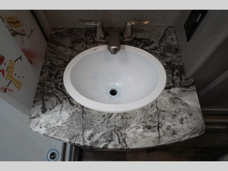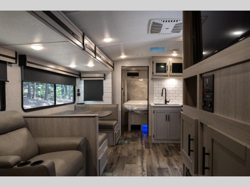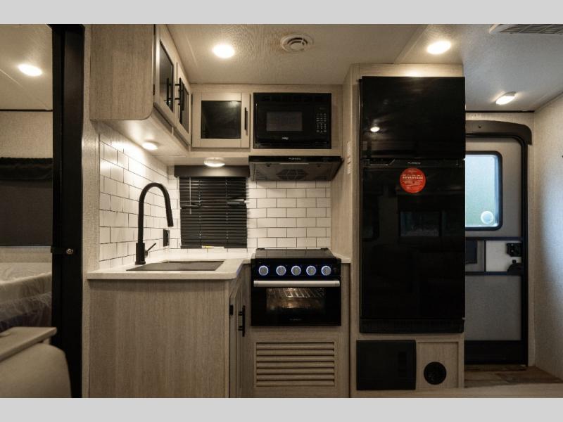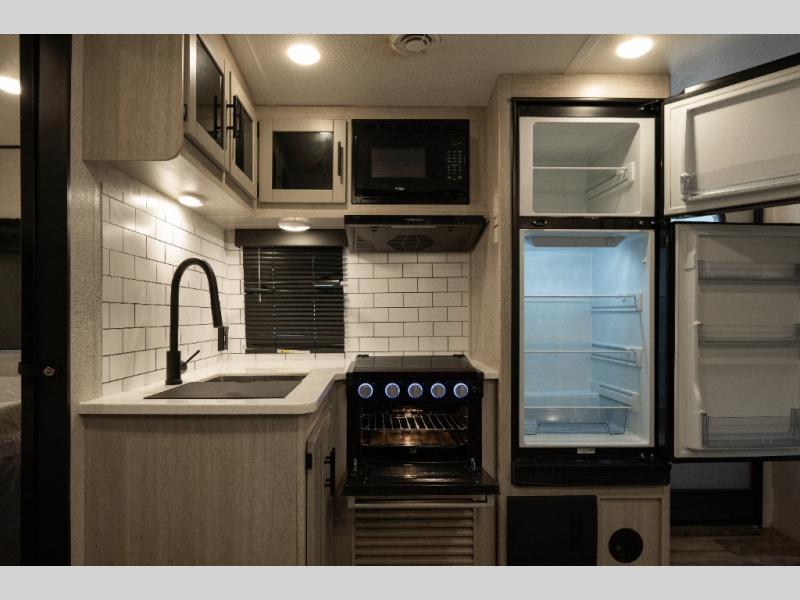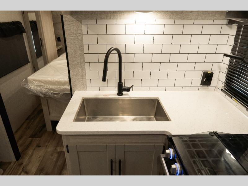 With any Sunset Trail travel trailer by CrossRoads RV, the interior offers a stainless steel farmhouse sink with a cover, solid surface kitchen countertops, and a docking station with 12 Volt, USB Port, and 110 Outlets. Also included is a 13,500 BTU air conditioner plus upgraded insulation with roof and floor reflective foil for added comfort, plus sturdy construction elements like a plywood bed board with strut assist, residential wood window trim, and hardwood cabinet doors. Make your lightweight and comfortable RV decision today!