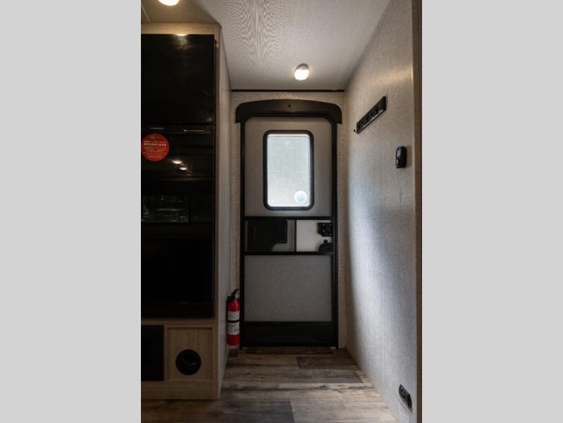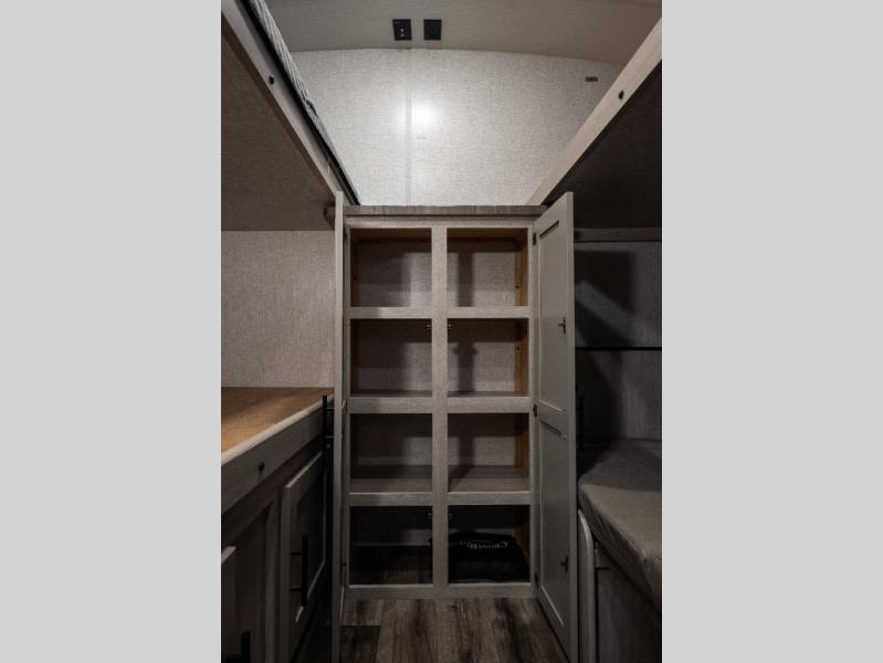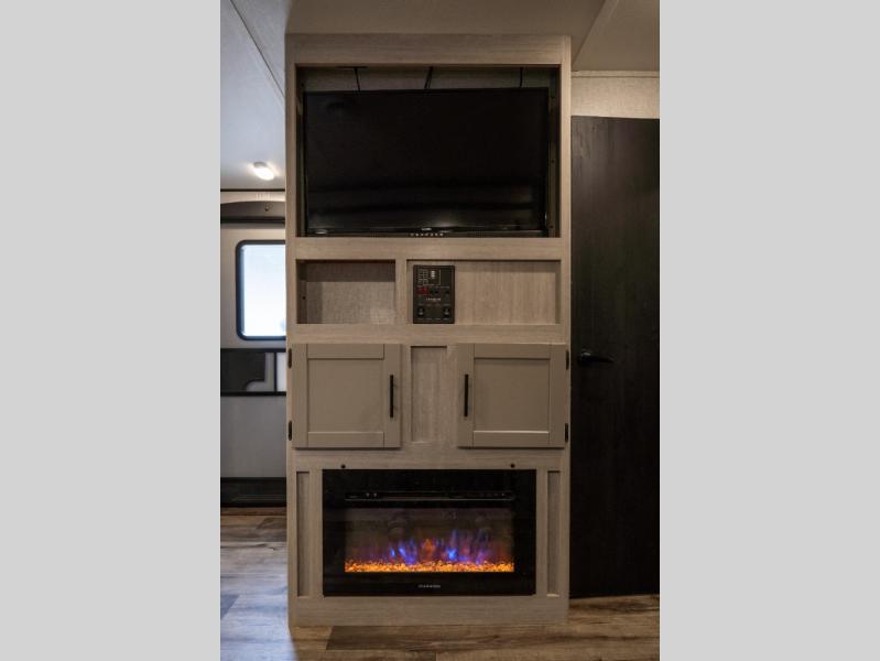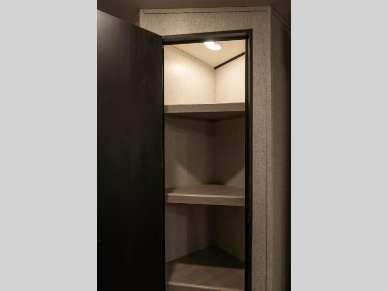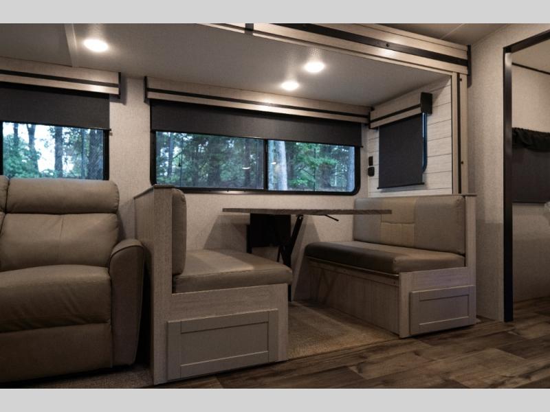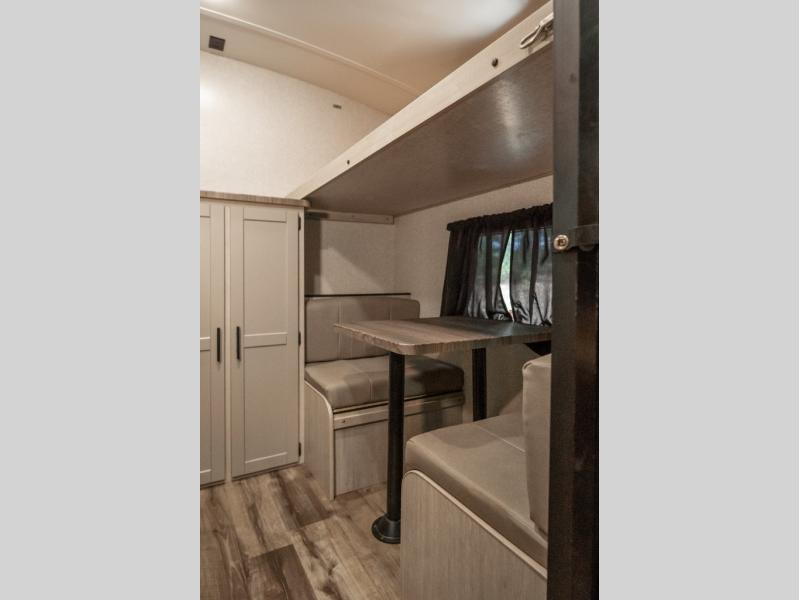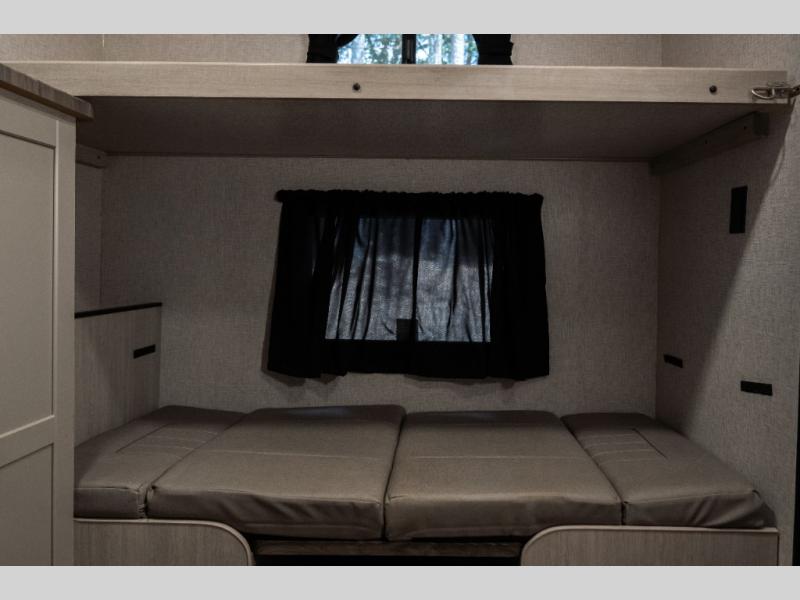 Everyone will have a great time camping in this travel trailer! There is a rear private bunkhouse with a 60" fold-up sofa below a 28" x 64" flip-up bunk, a set of 28" x 74" bunk beds, and a wardrobe to the outside kitchen which even has a refrigerator to keep your beverage cold while you cook. There is also a front private bedroom with a king bed that has wardrobes on either side and an overhead cabinet above it to store your items. The kids can even bring a friend or two along to sleep on the 80" x 42" XL booth dinette and the tri-fold sofa. The full bathroom has a 30" x 36" shower and a linen closet so everyone can stay squeaky clean!