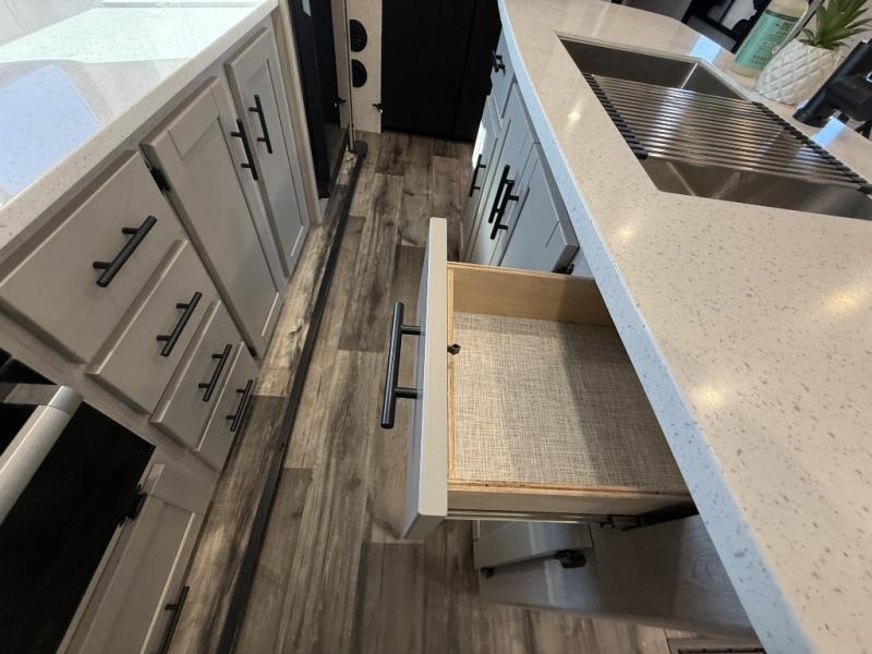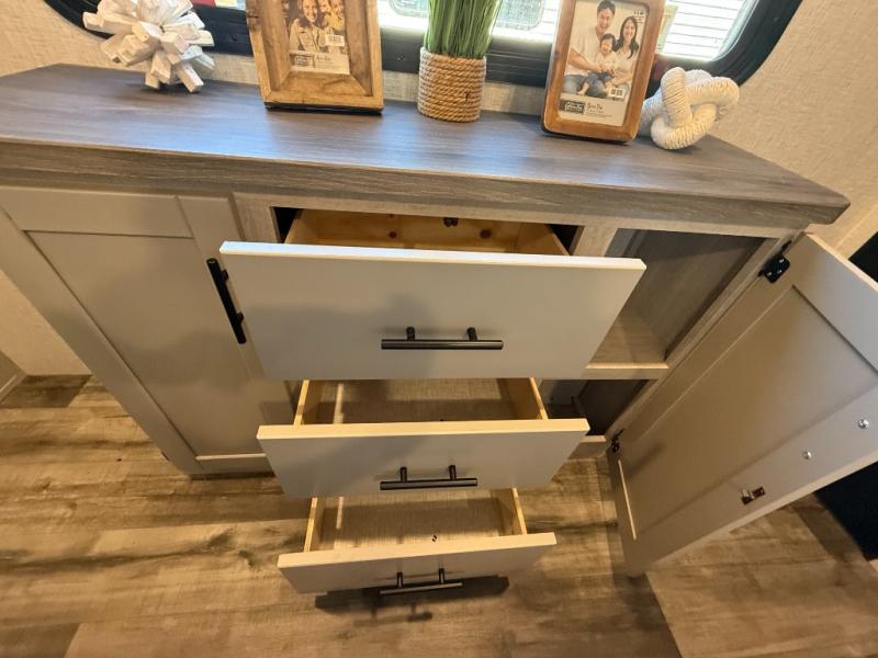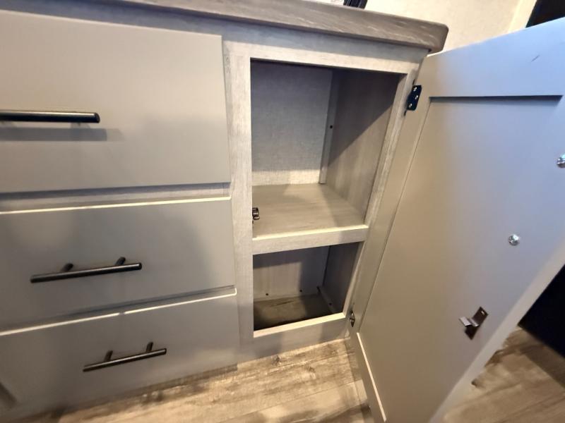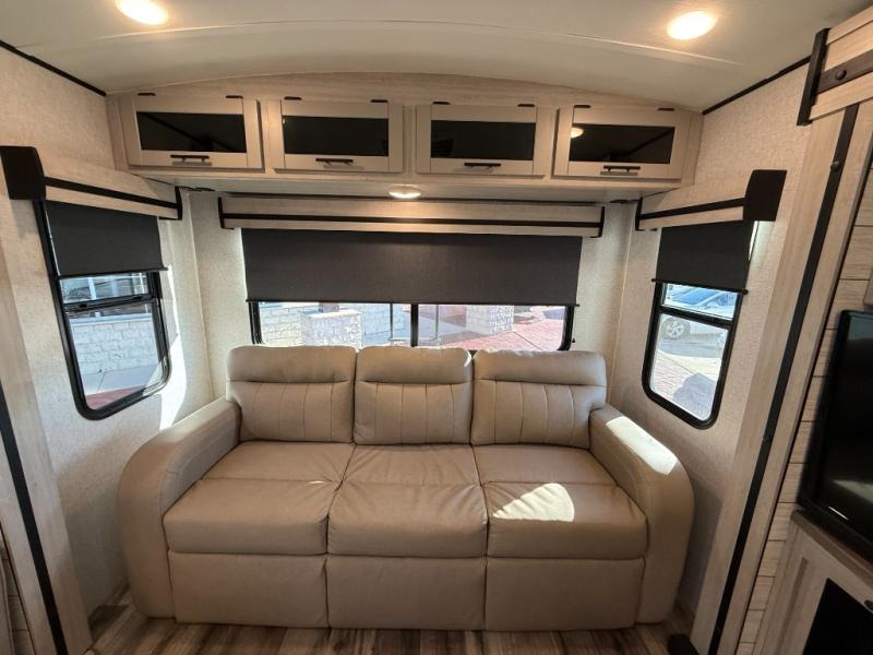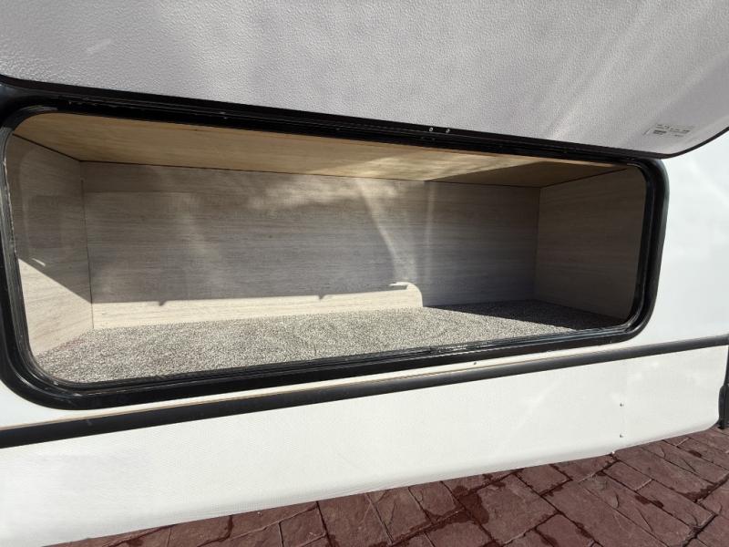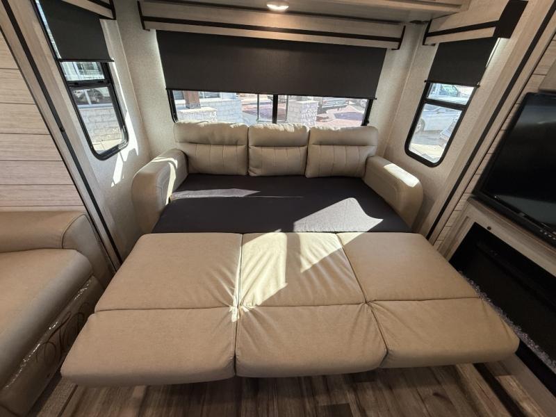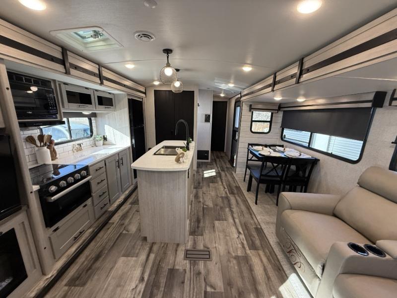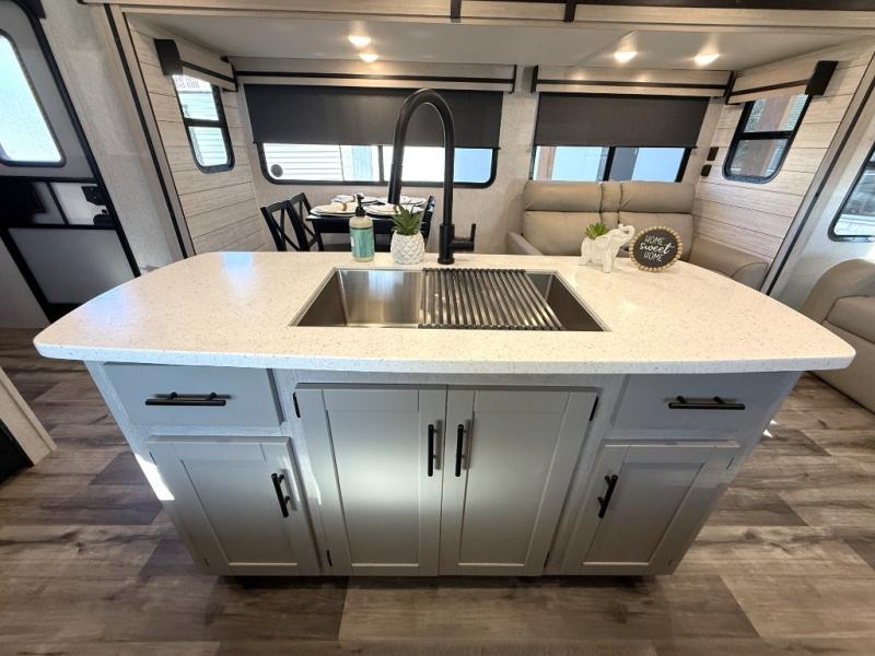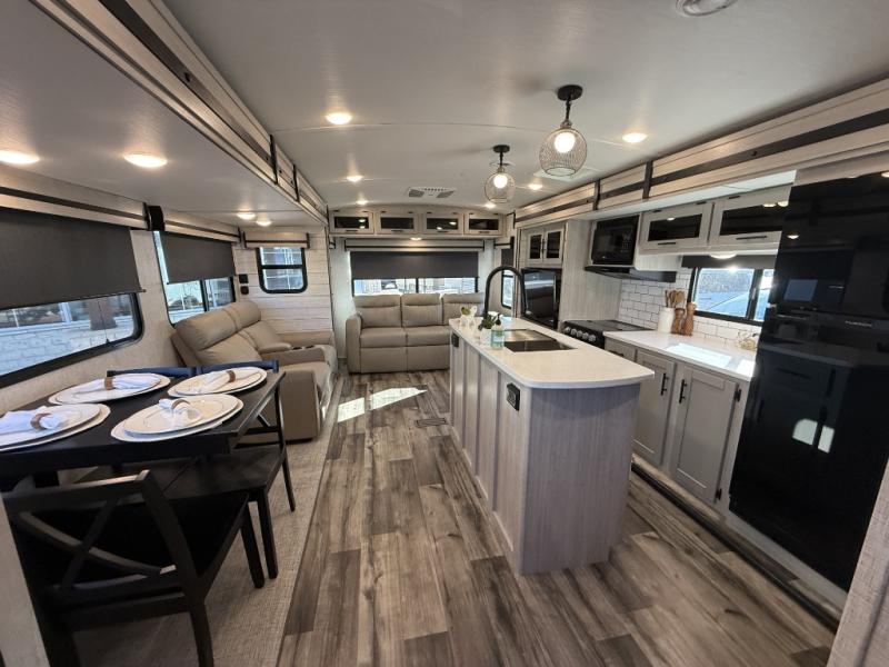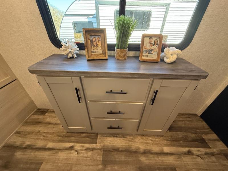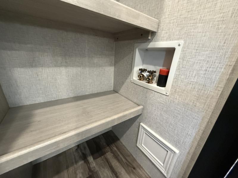 This spacious travel trailer is beaming with luxurious features you are sure to love. The dual opposing slides in the main living area open up the whole space, plus there is a third slide out in the front master suite. The chef of the family will appreciate the kitchen island for additional counter space, and there is a large pantry for all your non-perishables. This space has also been prepped to add an optional washer and dryer if you choose. Your family will find plenty of seating space on the rear 82" tri-fold sofa, the XL booth dinette, and the theater seating. The dual entry bath creates a front master bedroom, and you'll find plenty of storage space here, including a chest of drawers and a large front shelf!