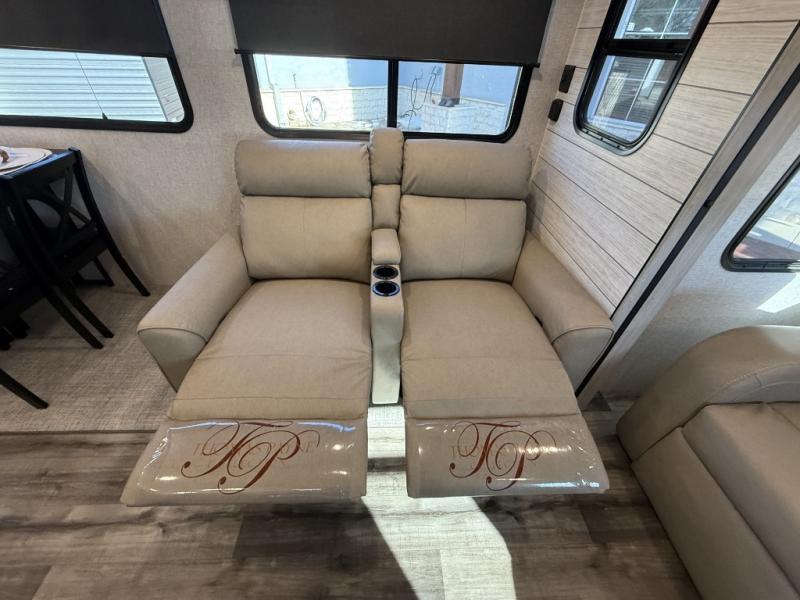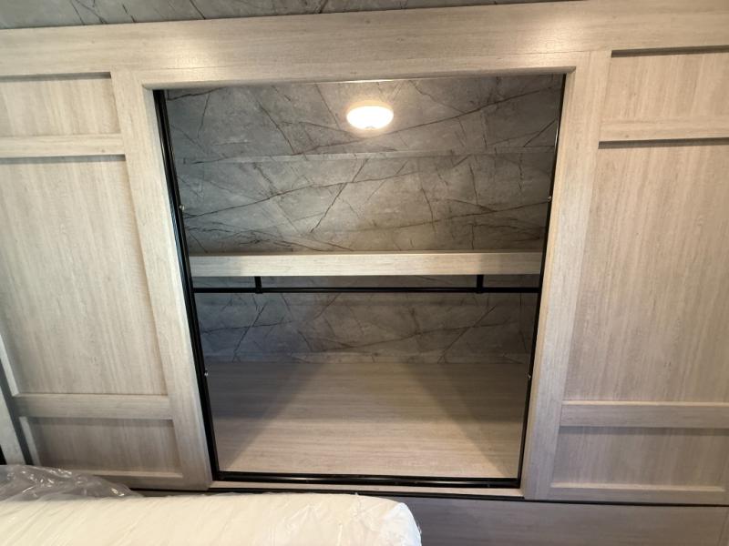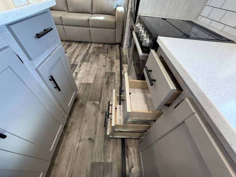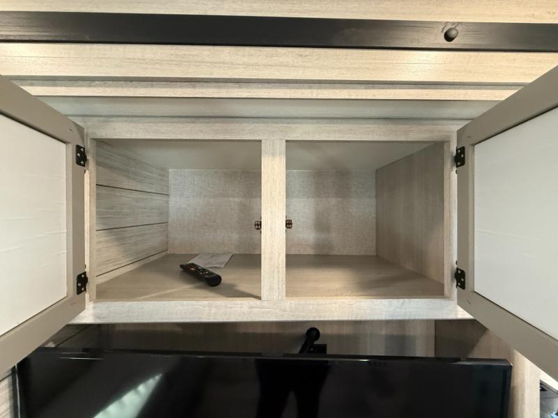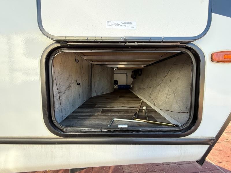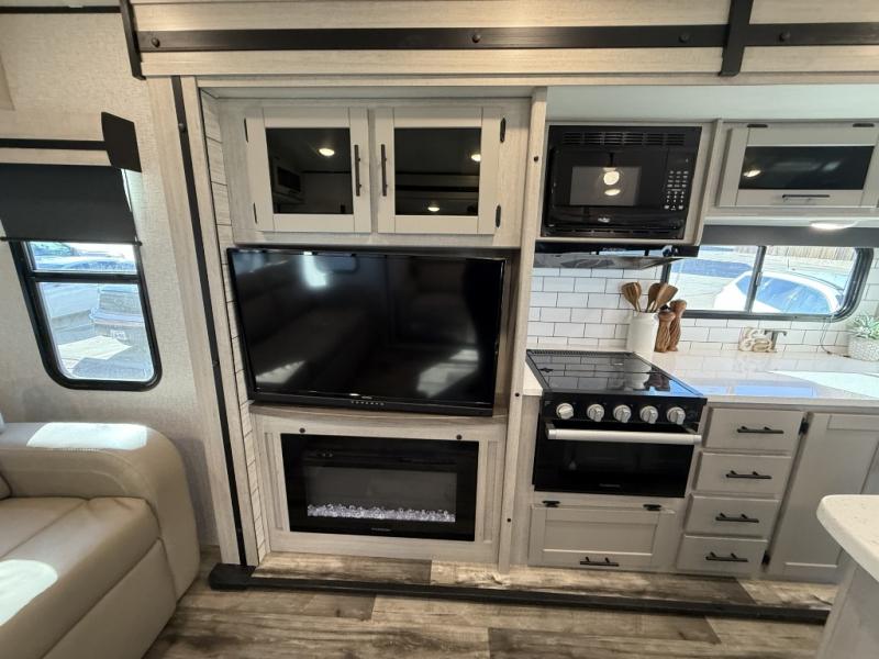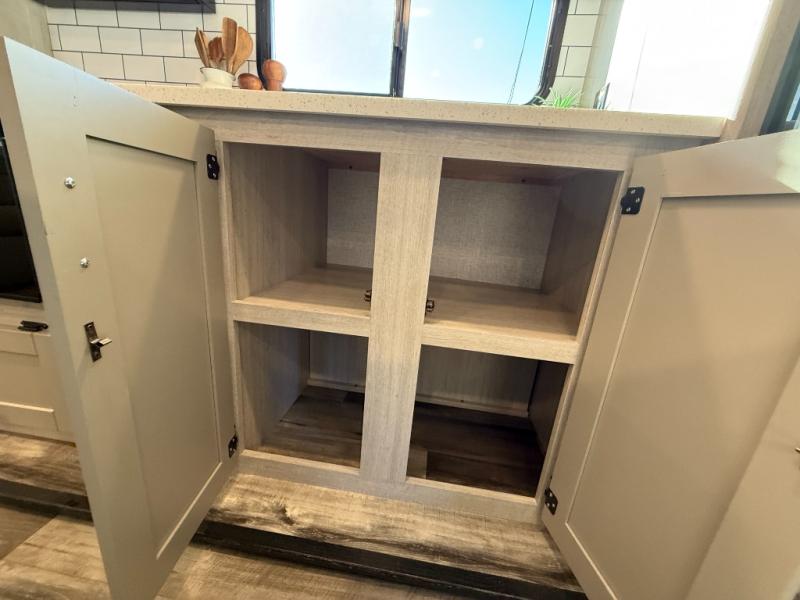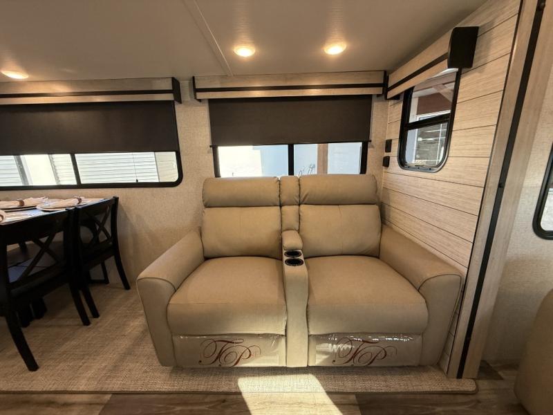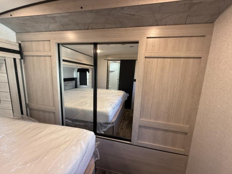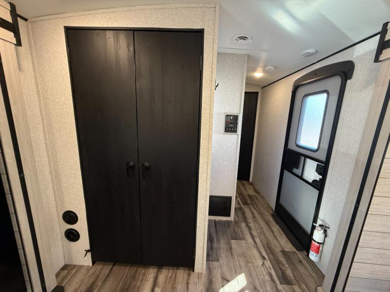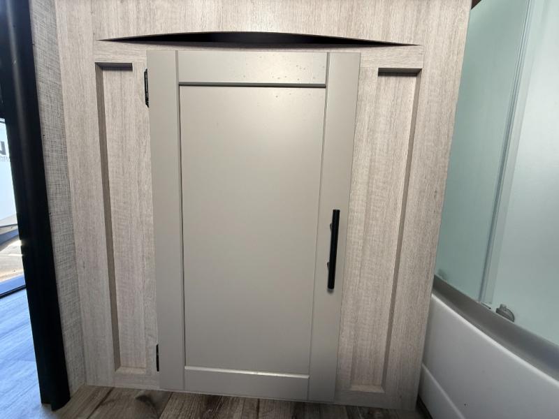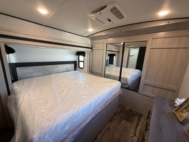 This spacious travel trailer is beaming with luxurious features you are sure to love. The dual opposing slides in the main living area open up the whole space, plus there is a third slide out in the front master suite. The chef of the family will appreciate the kitchen island for additional counter space, and there is a large pantry for all your non-perishables. This space has also been prepped to add an optional washer and dryer if you choose. Your family will find plenty of seating space on the rear 82" tri-fold sofa, the XL booth dinette, and the theater seating. The dual entry bath creates a front master bedroom, and you'll find plenty of storage space here, including a chest of drawers and a large front shelf!